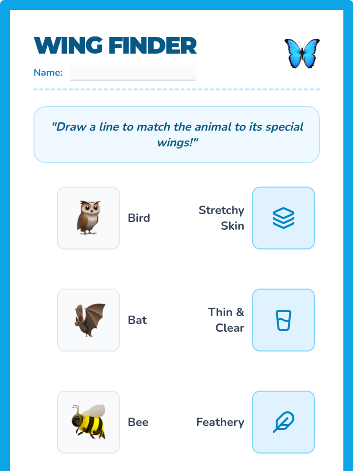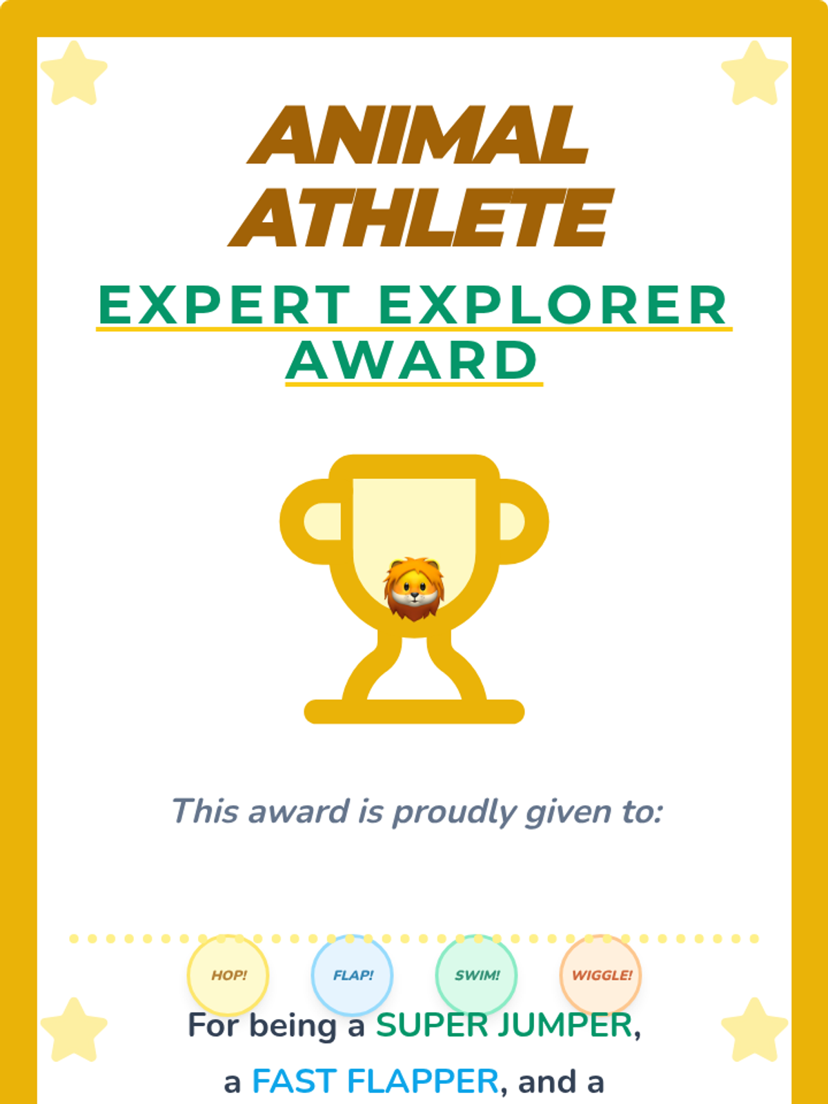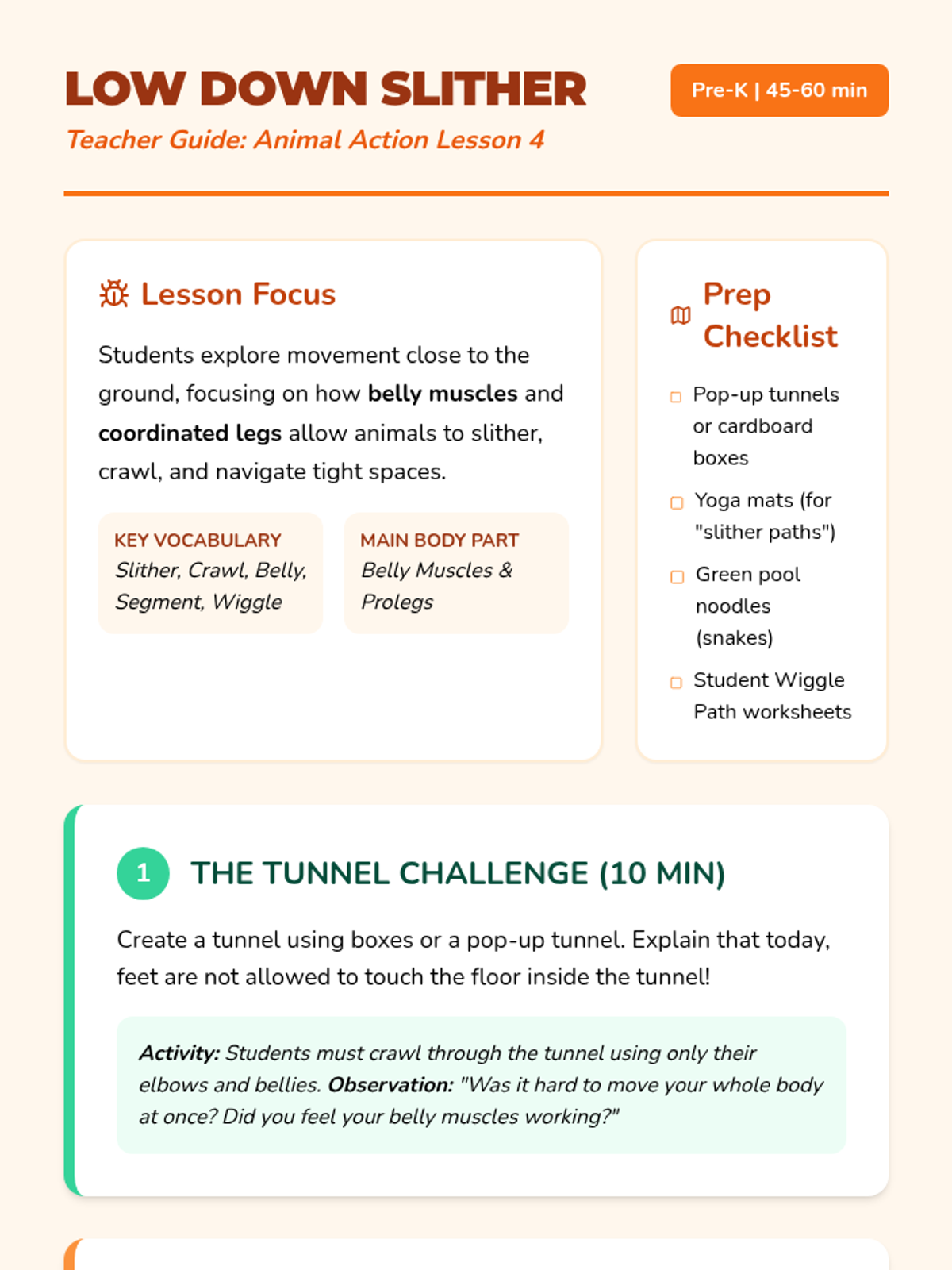 A movement-based exploration of animal anatomy for Pre-K students, focusing on how body parts like legs, wings, and fins enable different types of motion. Students will engage in role-play, sensory activities, and a final 'Olympics' to demonstrate their understanding of animal movements.
