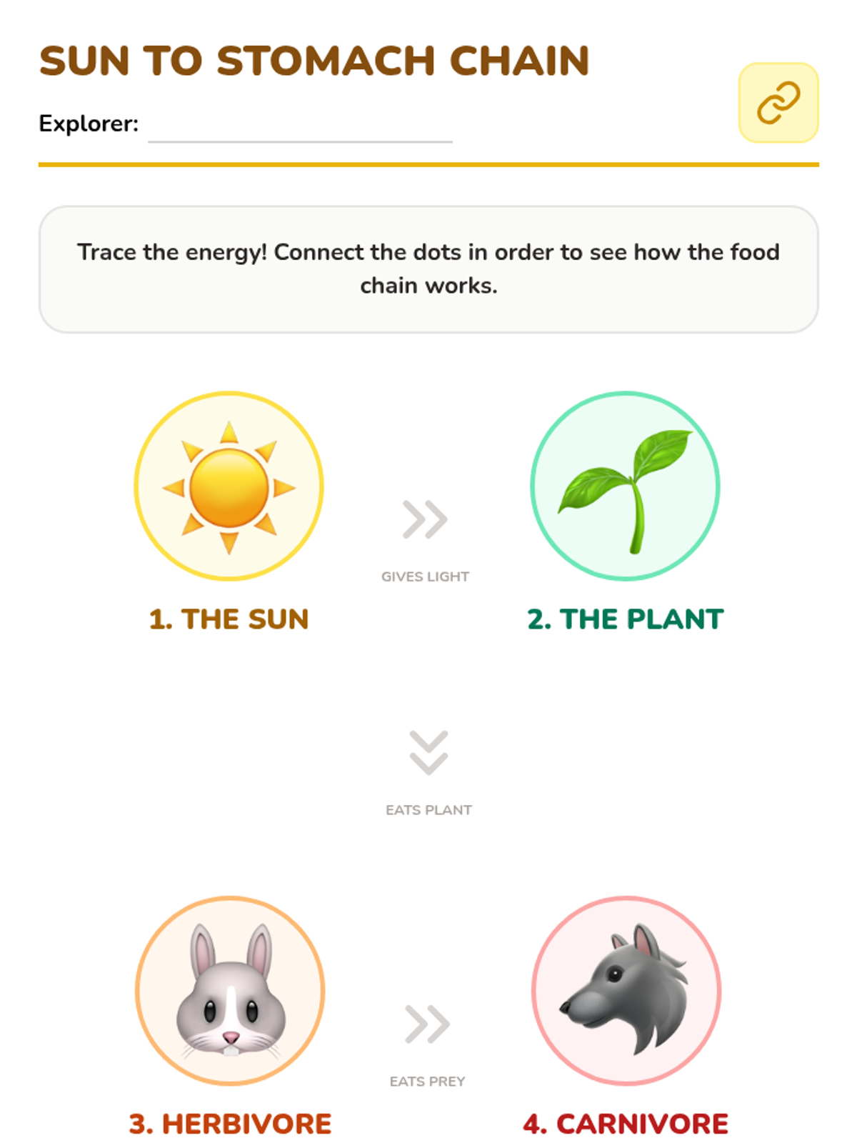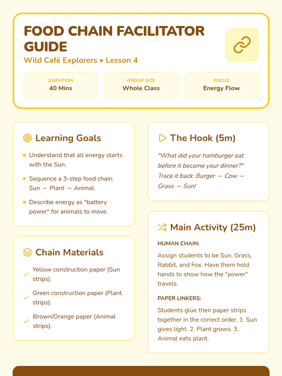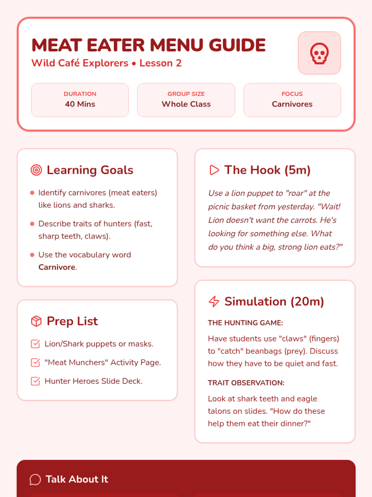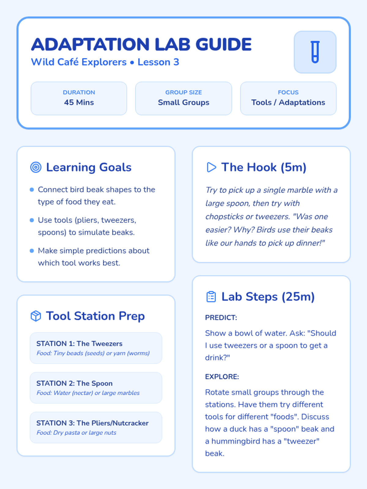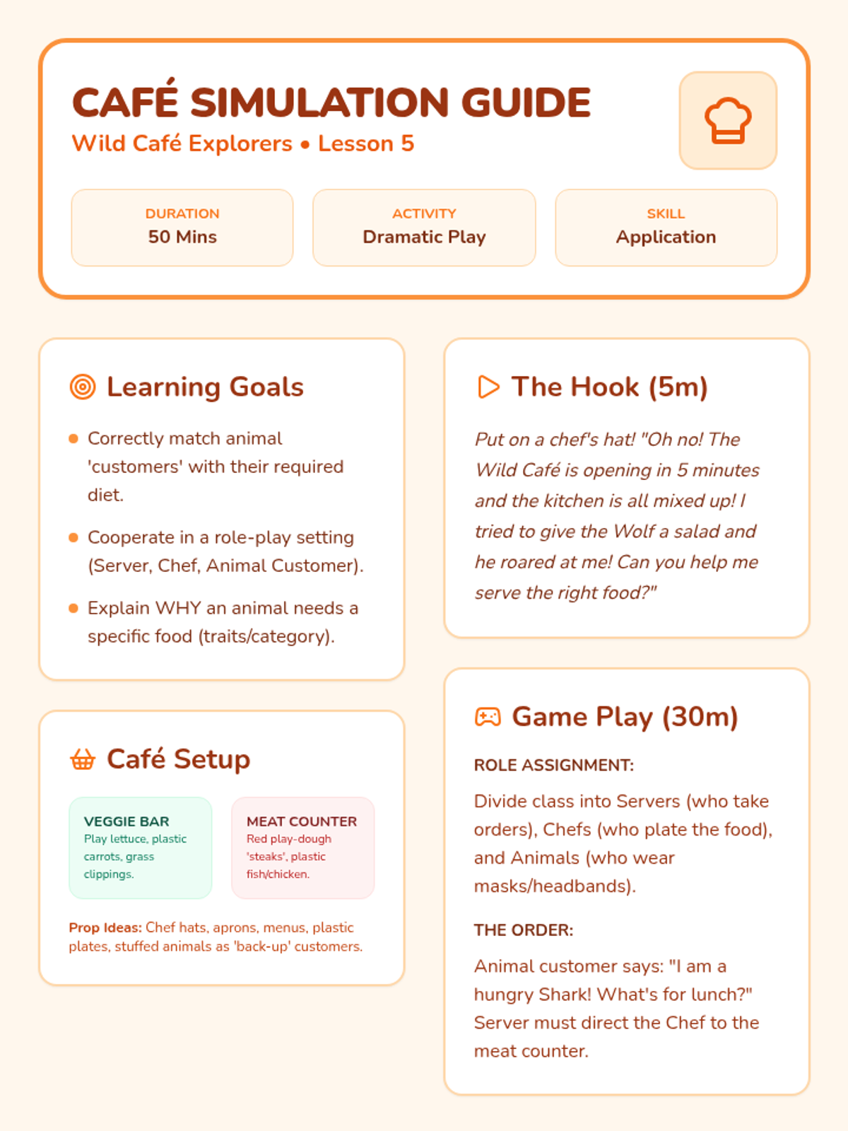 A Pre-K science sequence exploring animal diets and feeding behaviors. Students learn to categorize herbivores and carnivores, understand physical adaptations like beaks and teeth, and explore the flow of energy through simple food chains using hands-on activities and dramatic play.