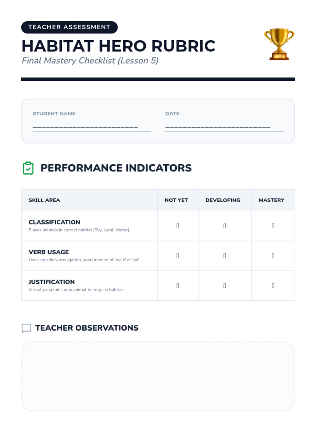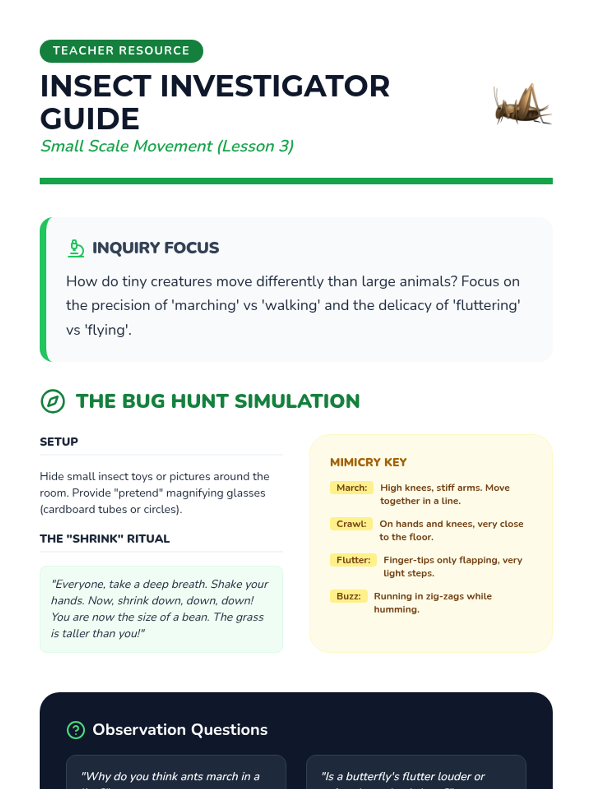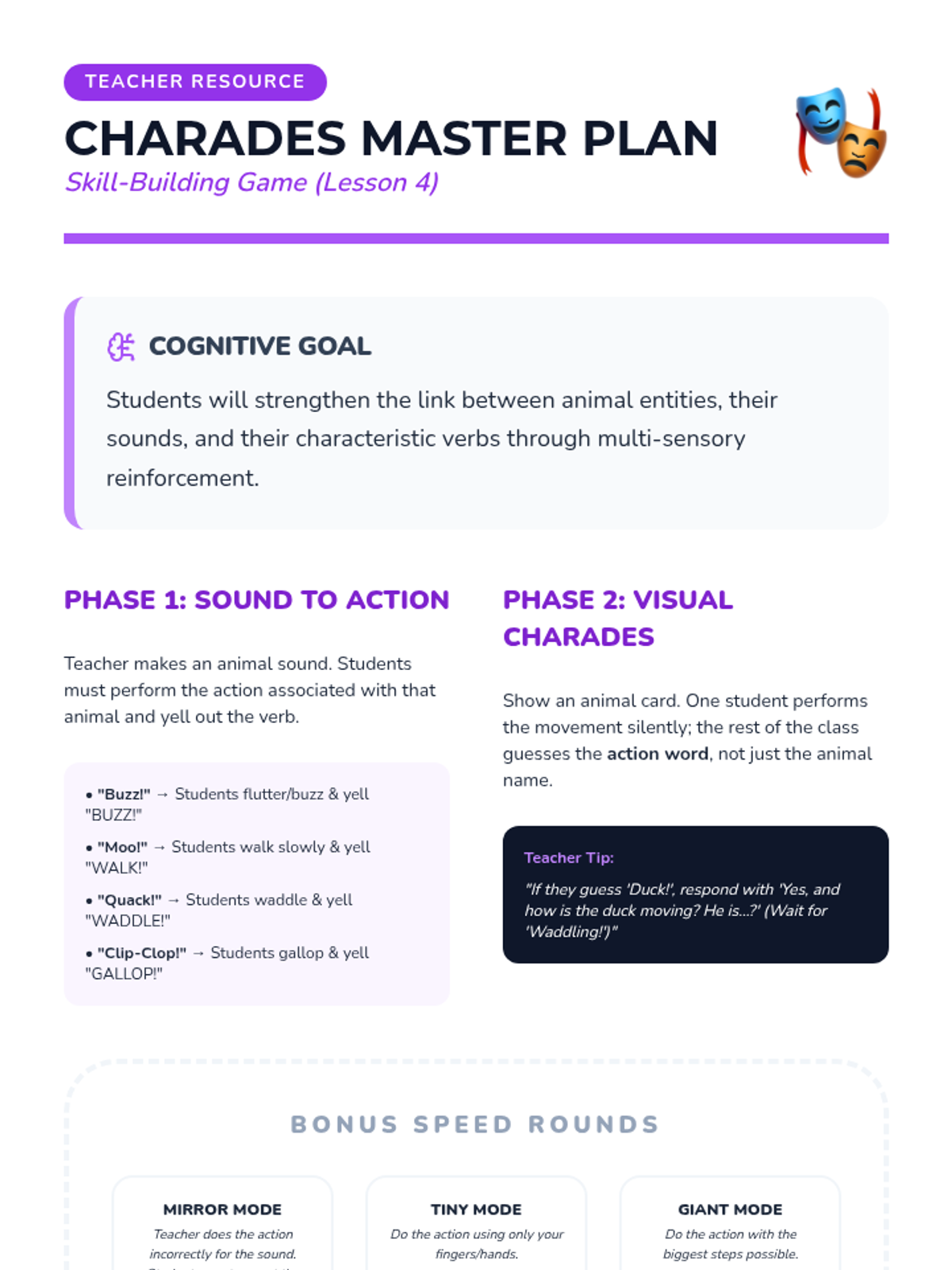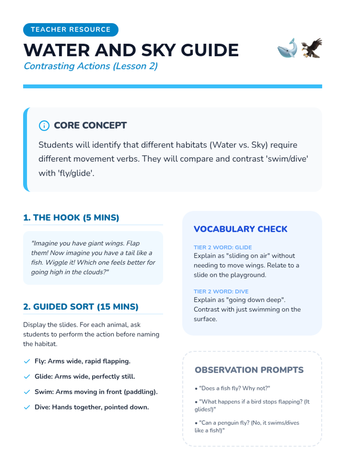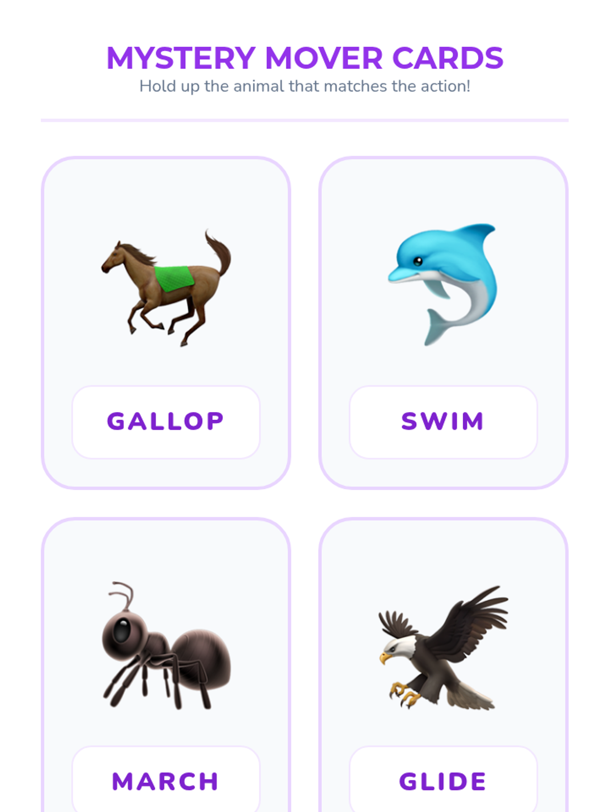 A Pre-K ELA sequence focused on action verbs through the lens of animal movements. Students observe, mimic, and categorize animal actions to build a descriptive vocabulary beyond generic terms like 'walk' or 'run'.