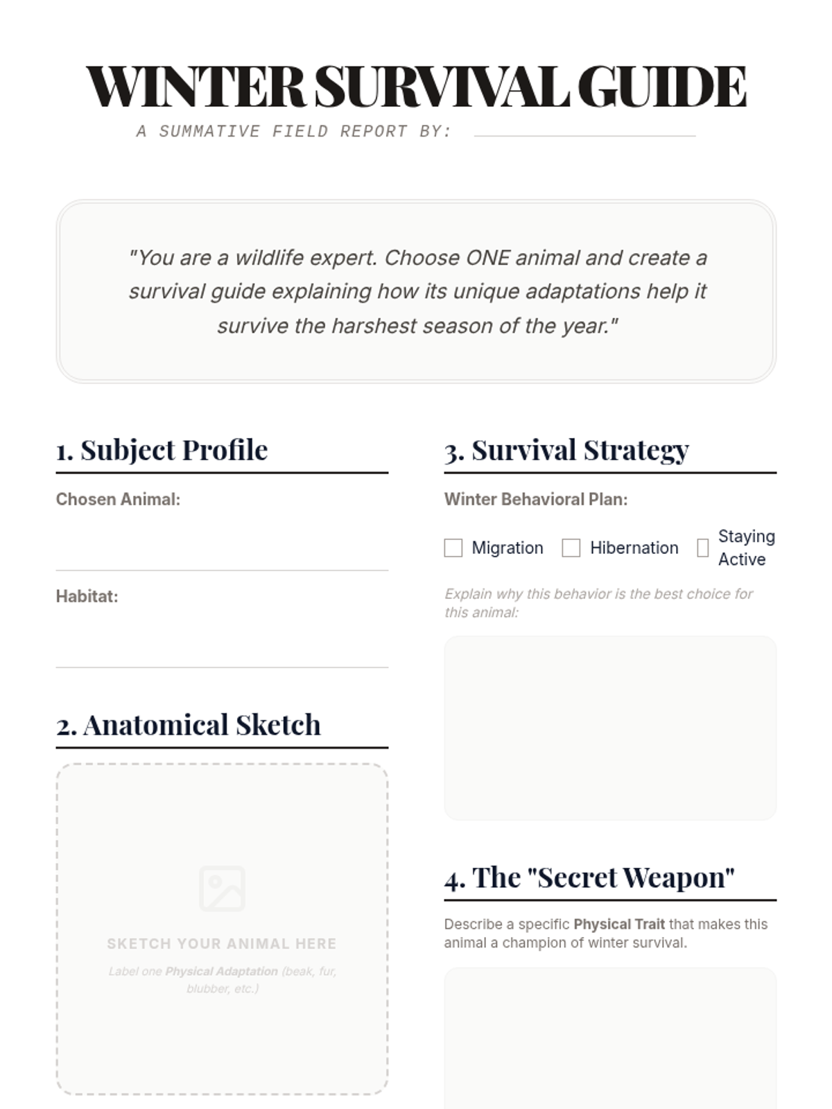A simulation-heavy exploration of how physical traits and behavioral instincts allow animals to survive in diverse environments, from the depths of the ocean to the icy tundra.