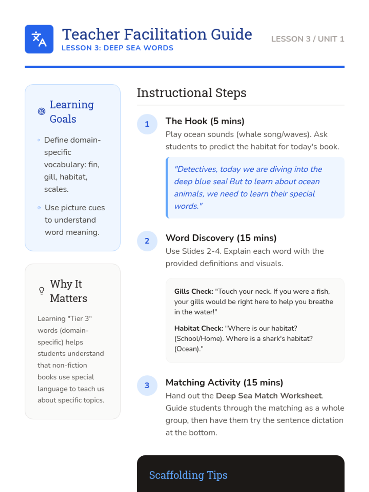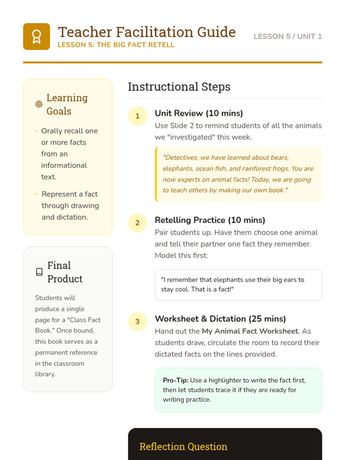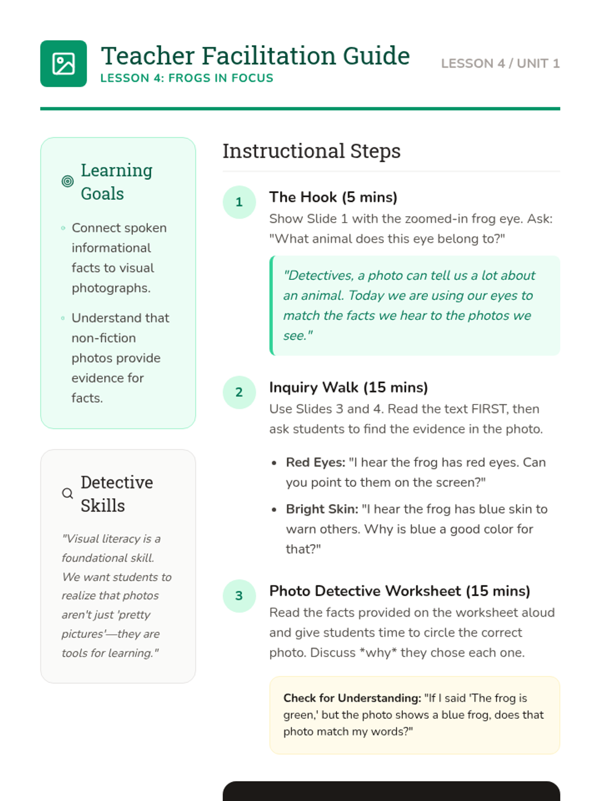 A Kindergarten ELA sequence focused on reading comprehension of informational texts through the lens of animal science. Students learn to distinguish between fiction and non-fiction, identify key details and domain-specific vocabulary, use photographs to support understanding, and retell facts.