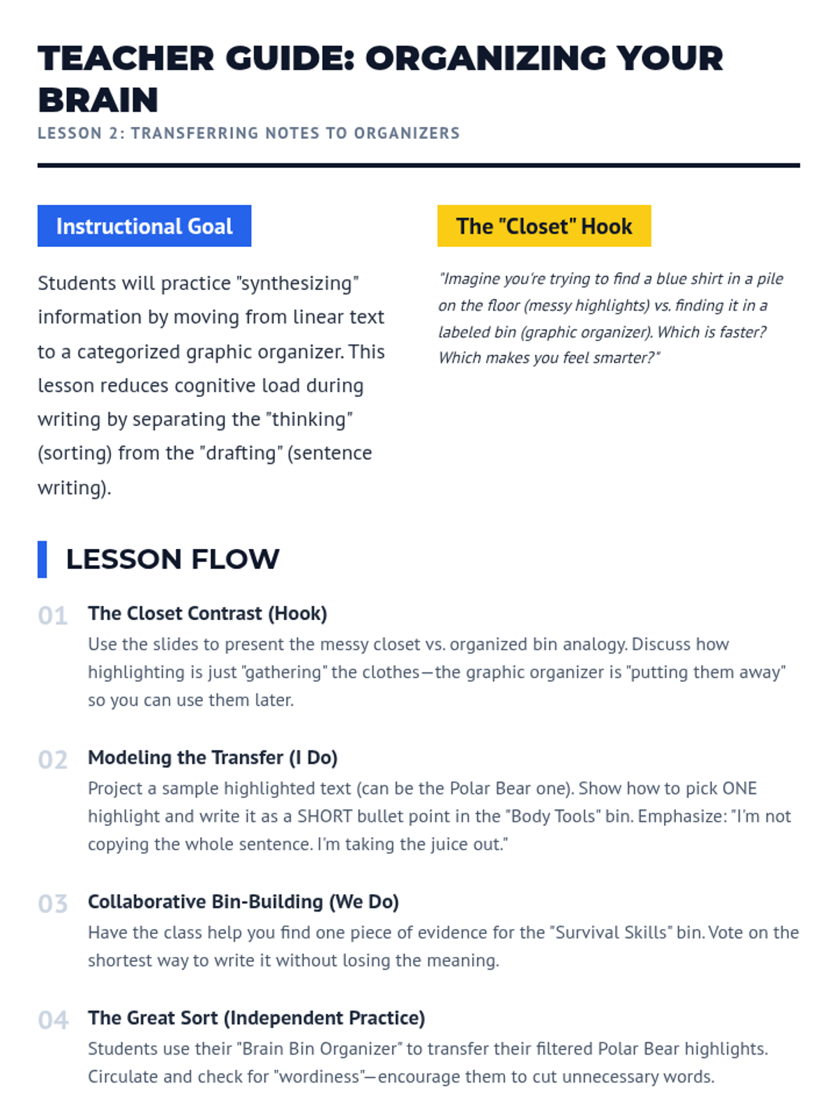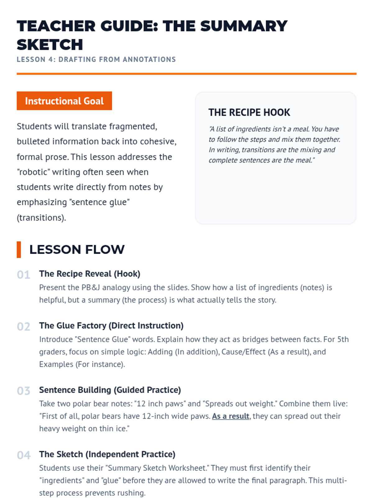 A 5-lesson sequence for 5th-grade students focused on utilizing text highlighting and annotations to create study tools, organize thoughts, and write summaries. Students move from marking text to synthesizing information into functional products like study guides and paragraphs.