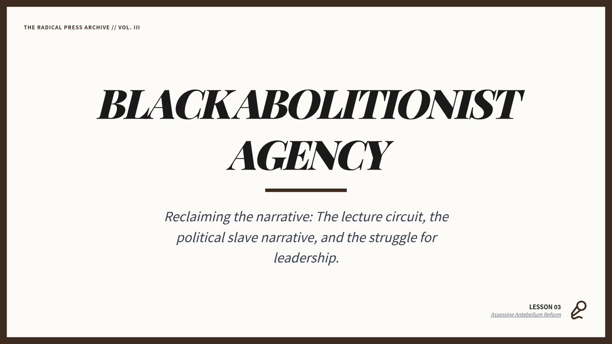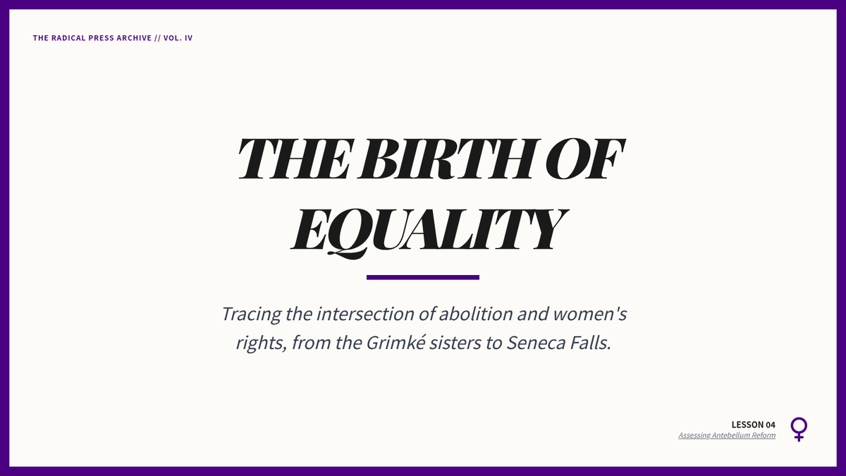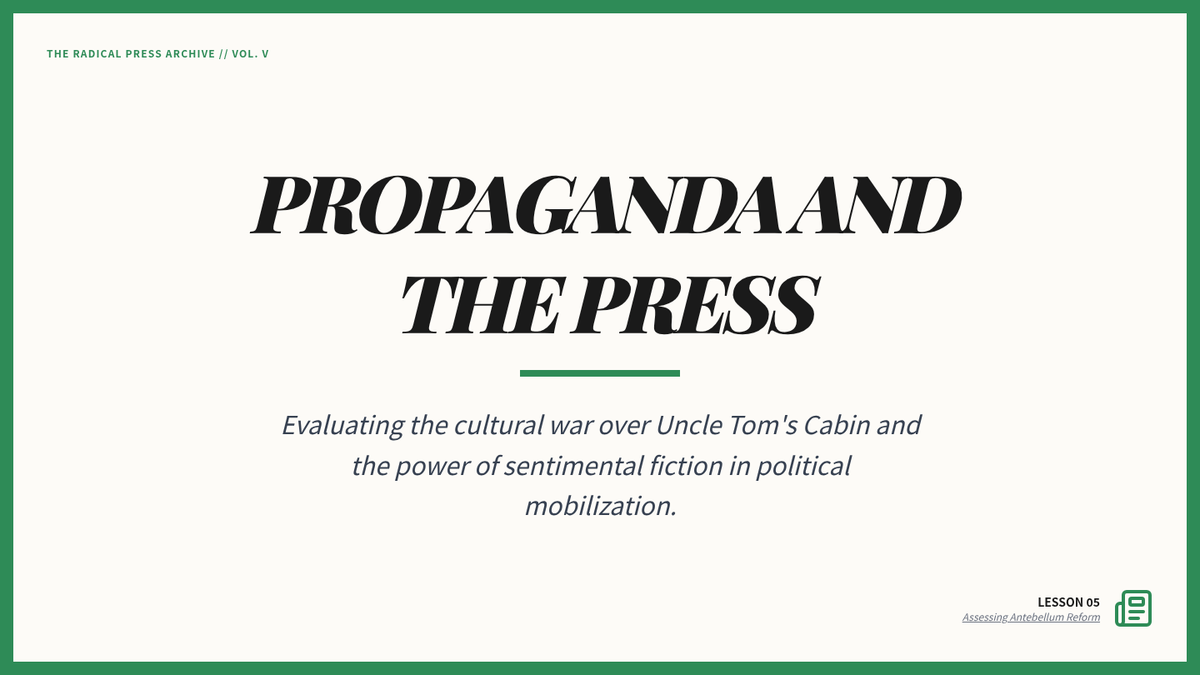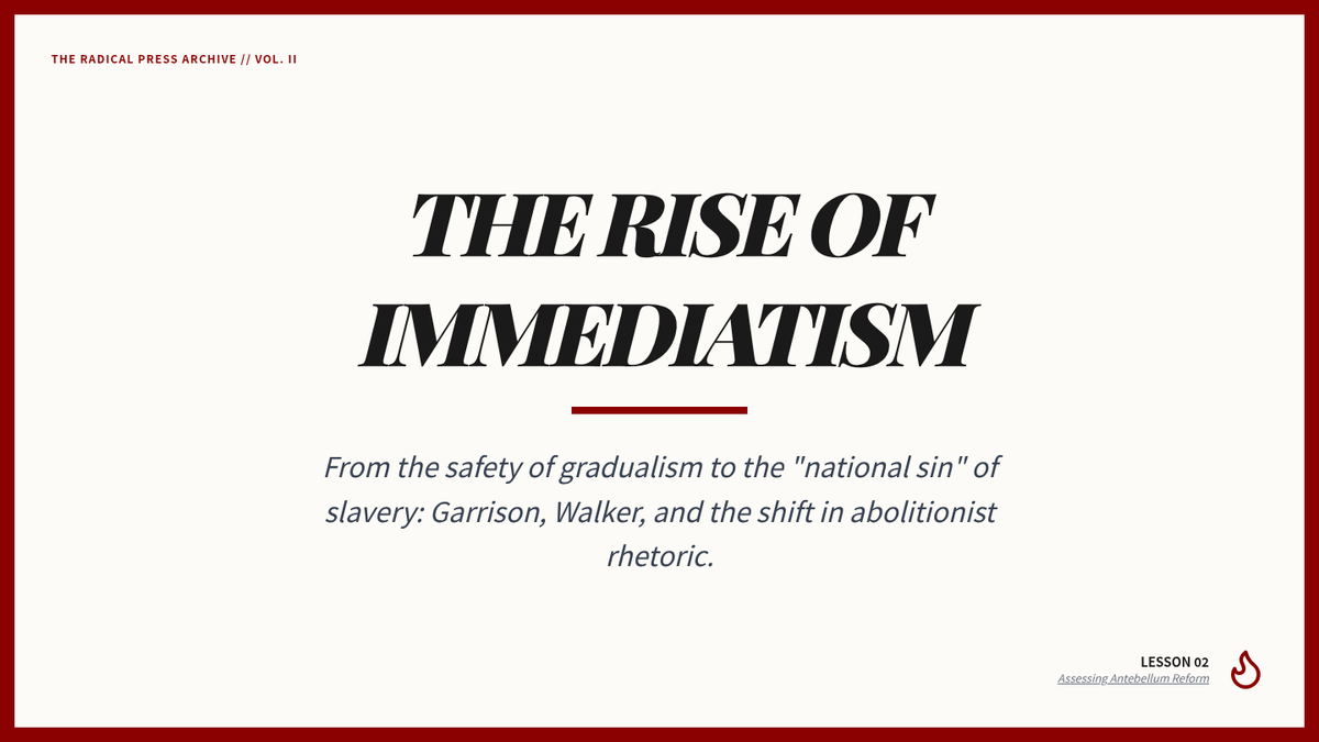 This undergraduate-level sequence explores the intellectual and religious roots of the Antebellum reform era, tracing the evolution from gradualism to radical abolitionism and its intersection with the early women's rights movement. Students analyze primary sources, rhetorical strategies, and the role of the press in shifting national discourse on slavery and equality.