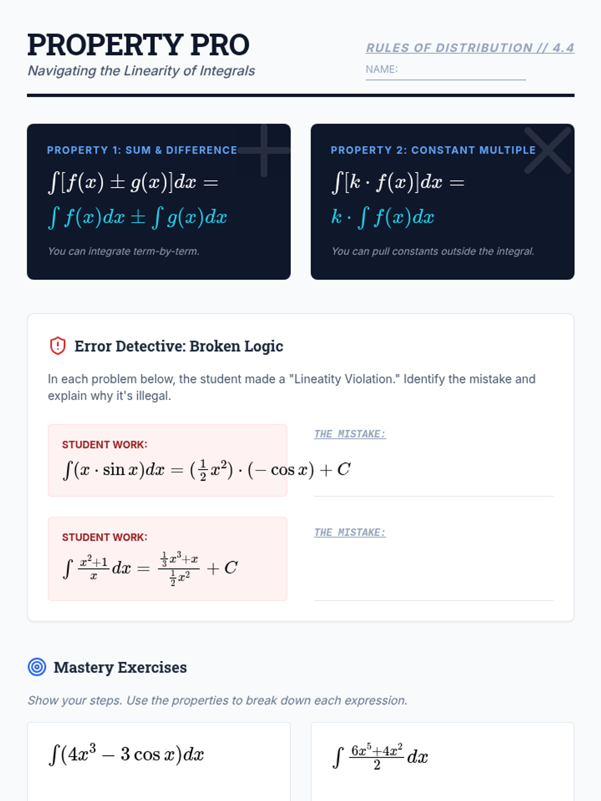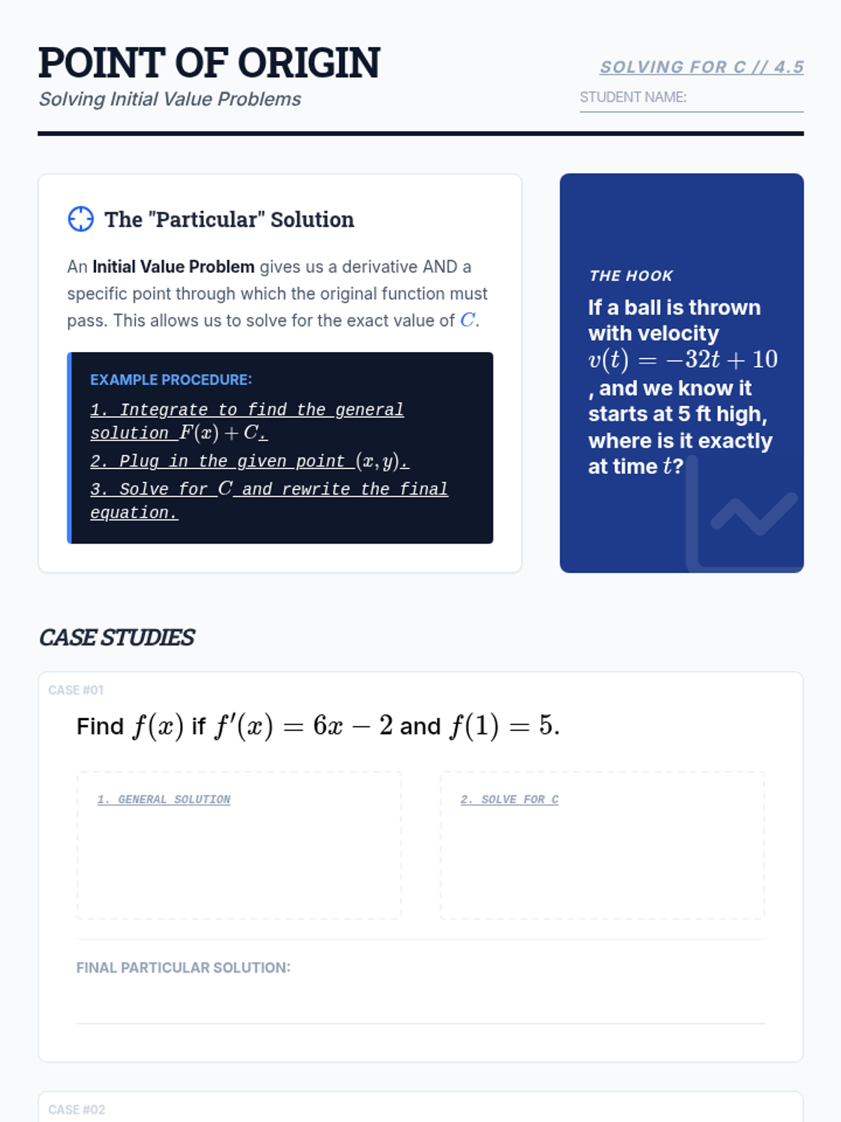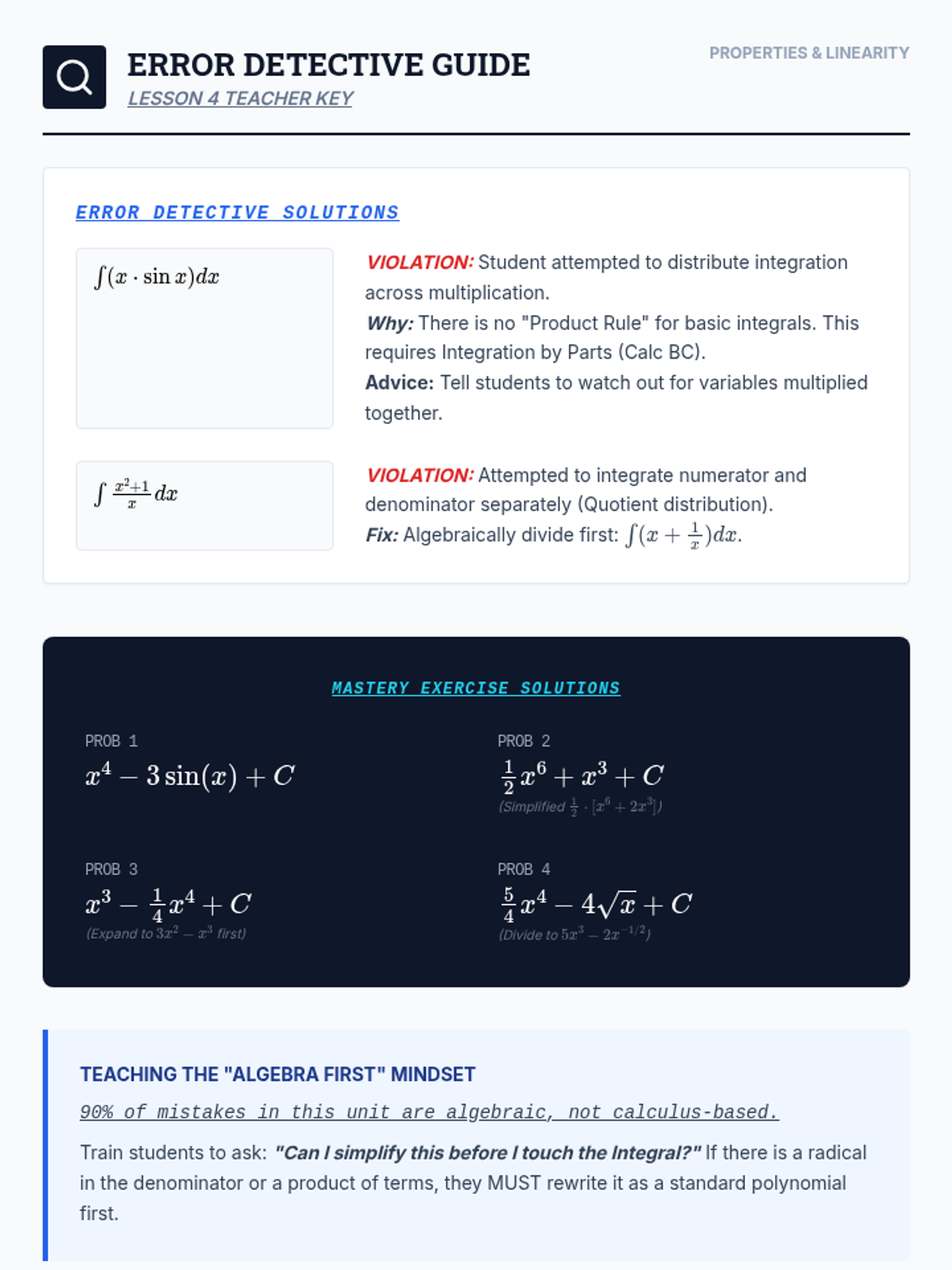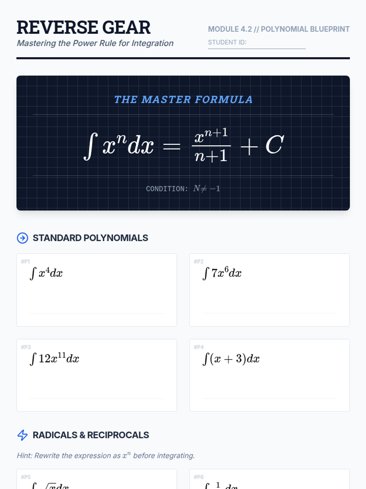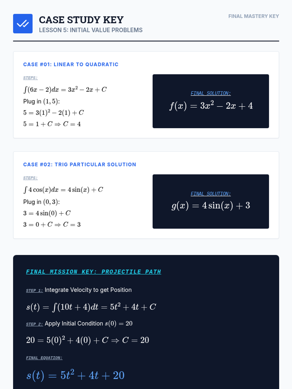 A technical skill-building sequence for 11th-grade students focusing on the algebraic processes of finding antiderivatives, from basic power rules to solving initial value problems.
