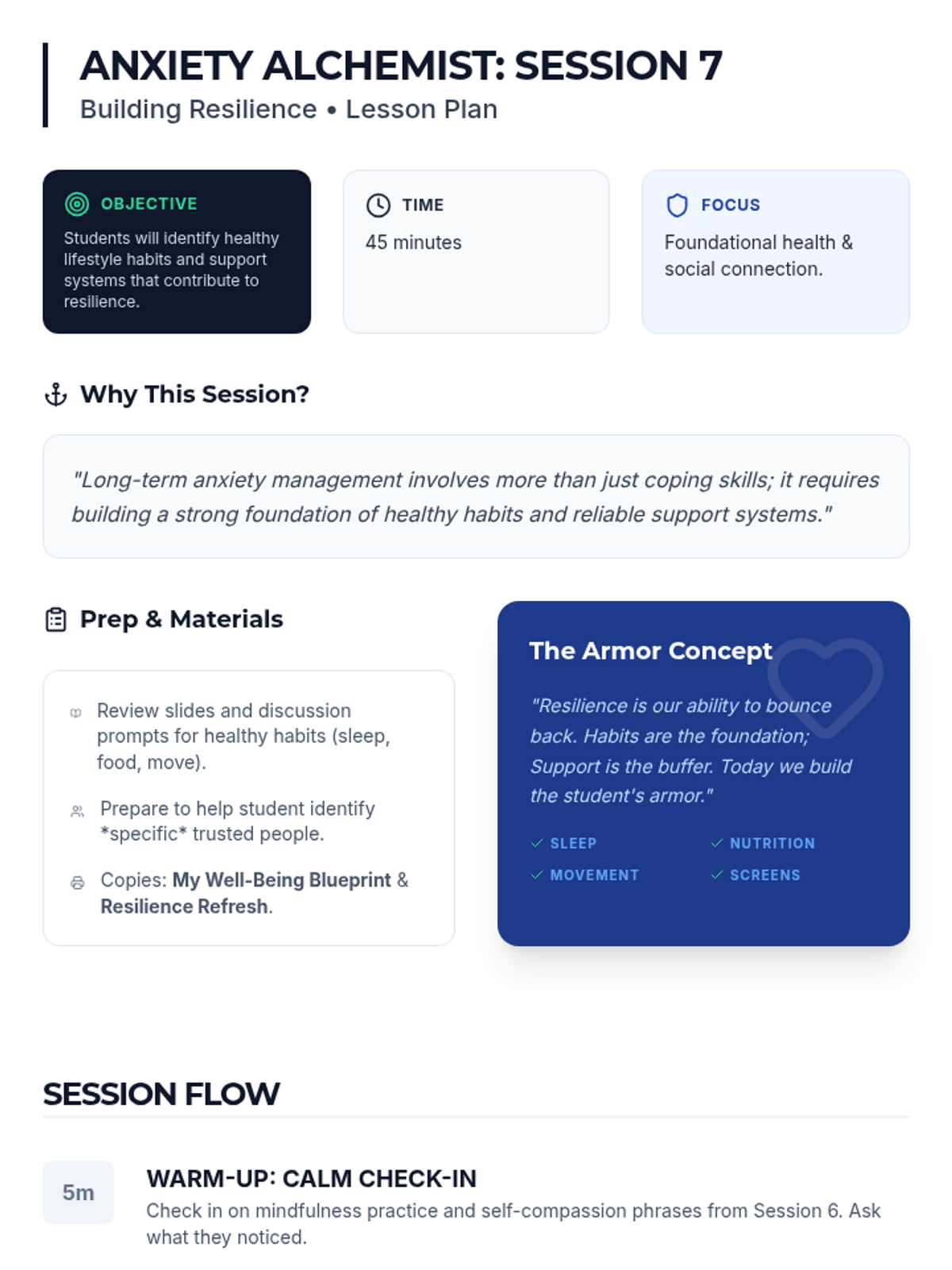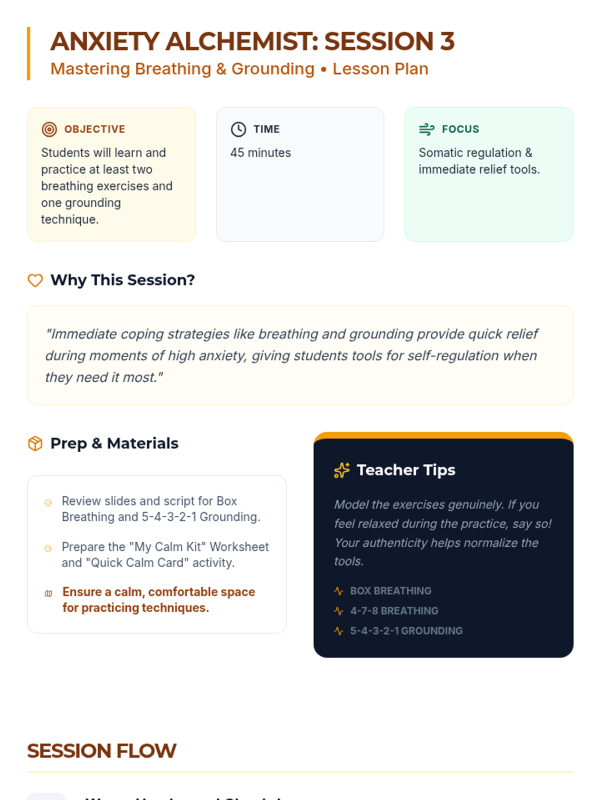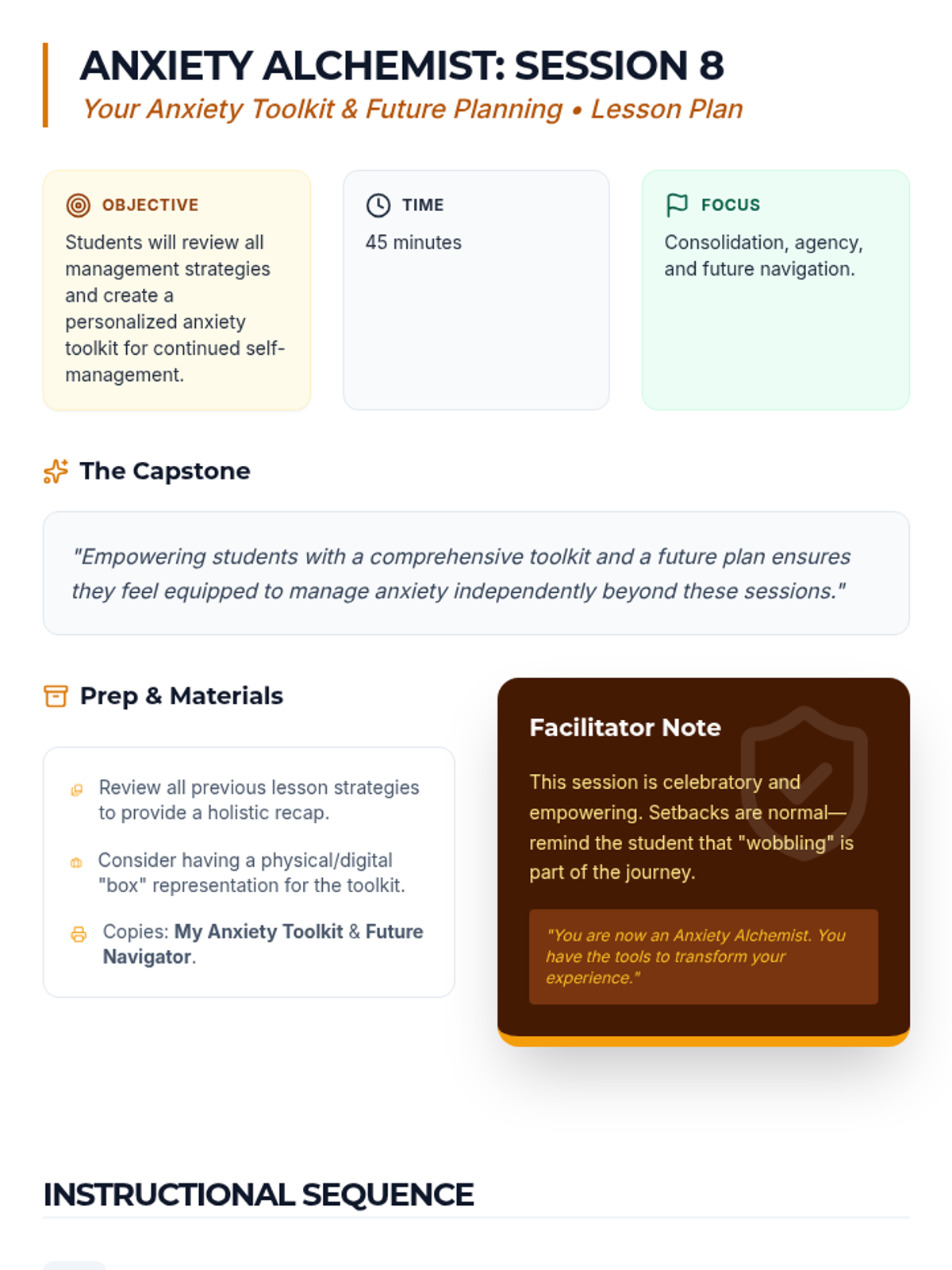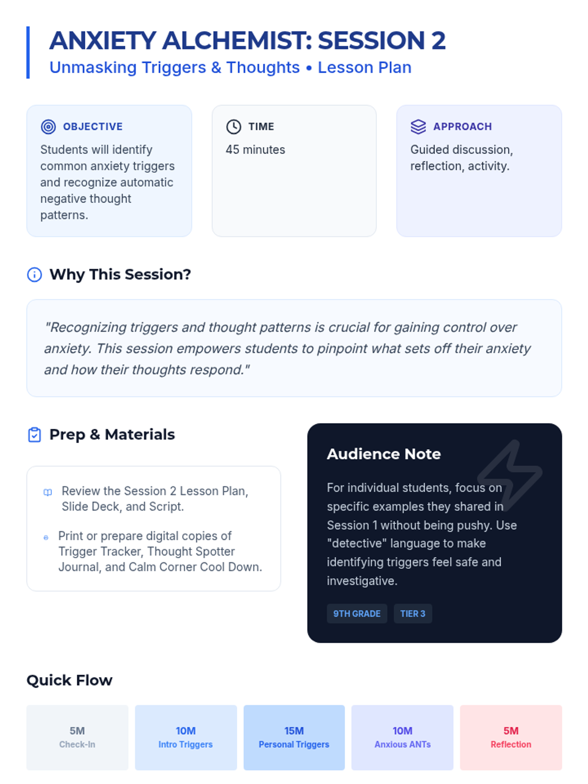 An 8-session individualized Tier 3 intervention series designed for 9th-grade students. This program transforms students into 'Anxiety Alchemists' by teaching them to understand, decode, and manage anxiety through practical coping strategies, cognitive reframing, and resilience building.