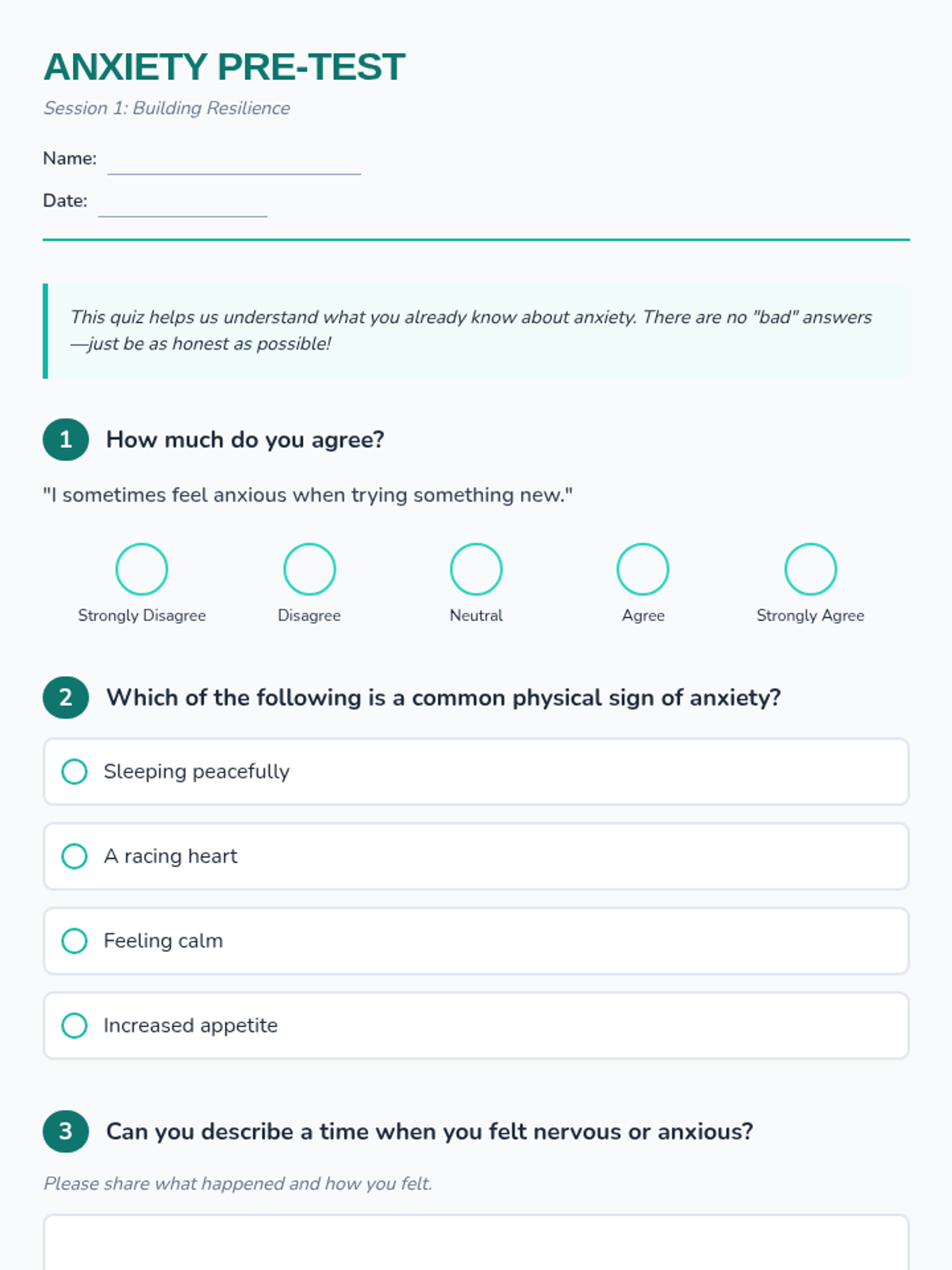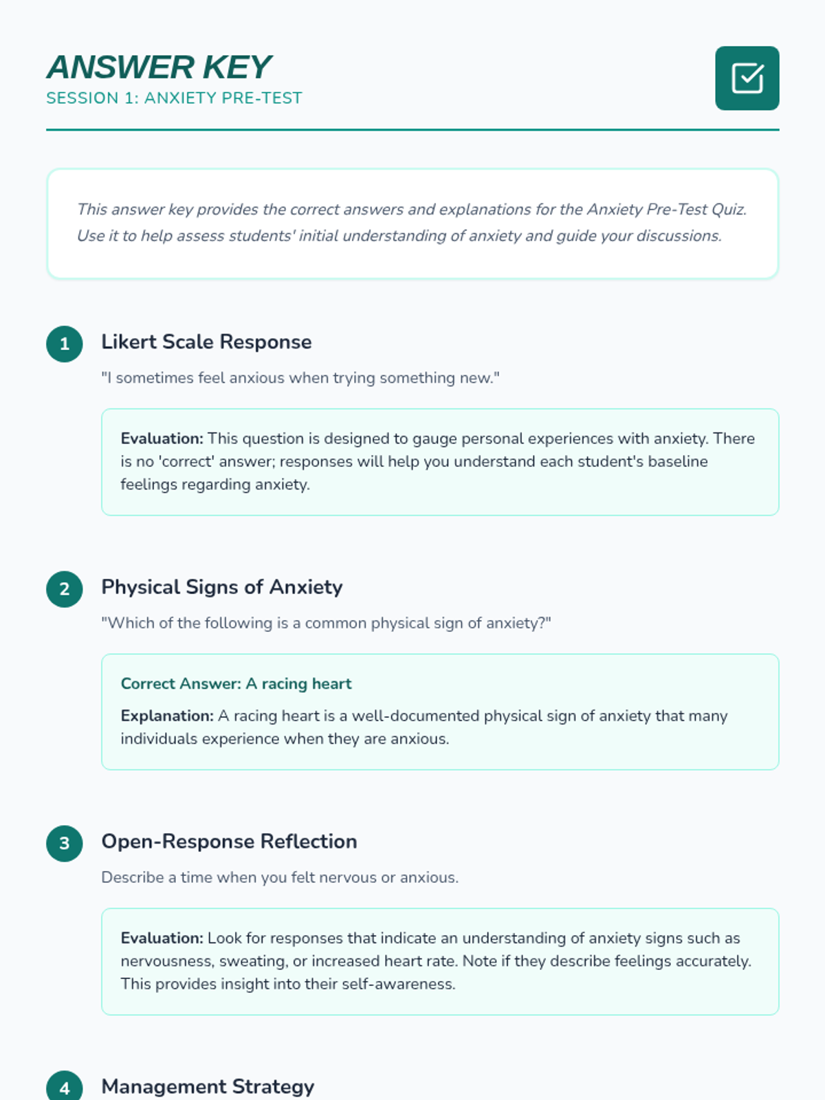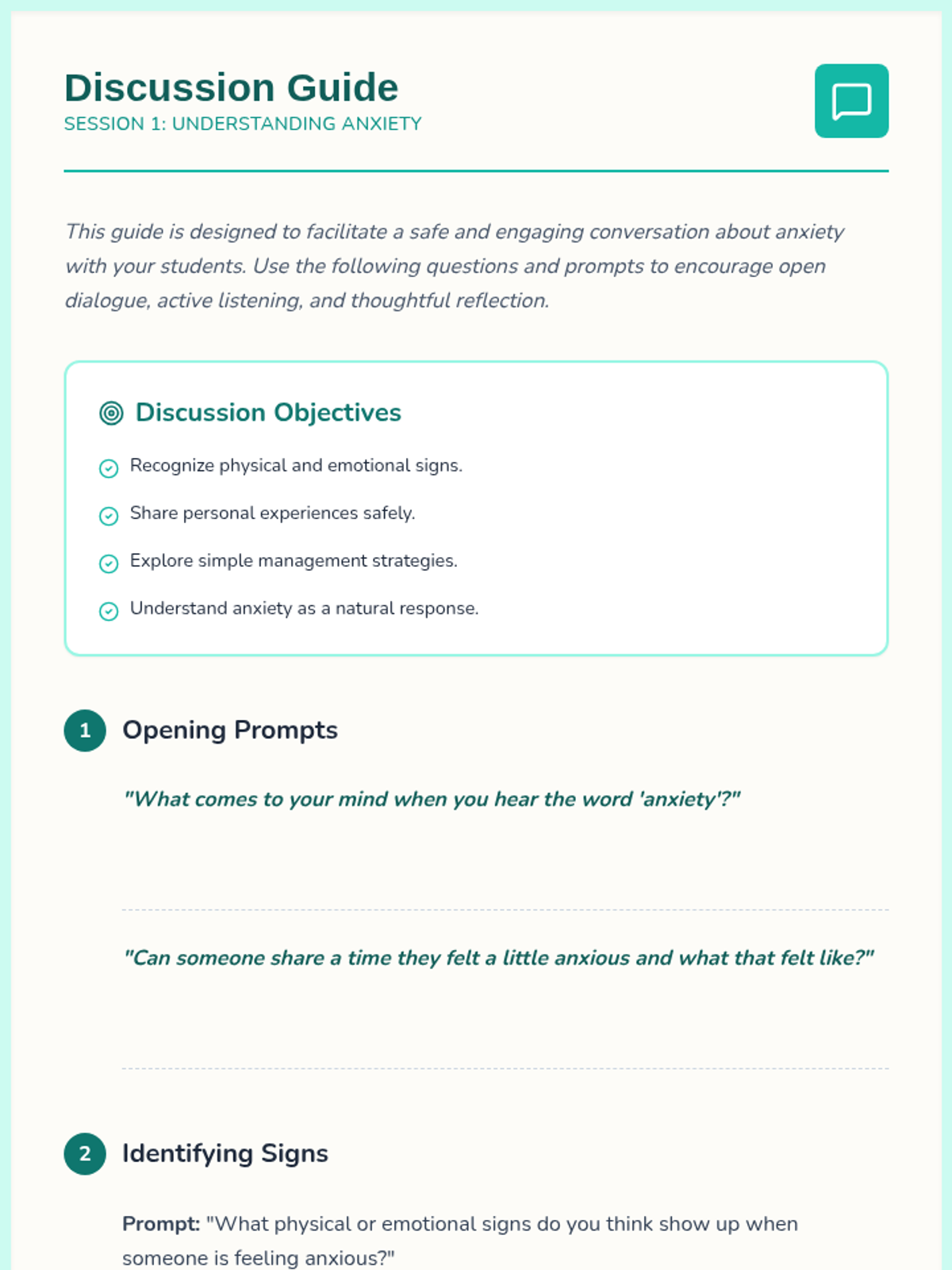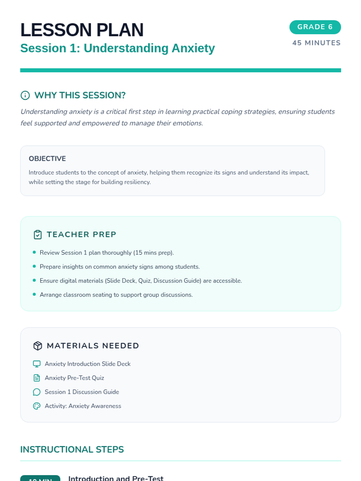 A 6-session series for 6th graders to understand anxiety, master coping strategies, and build long-term resilience through interactive activities and reflection.