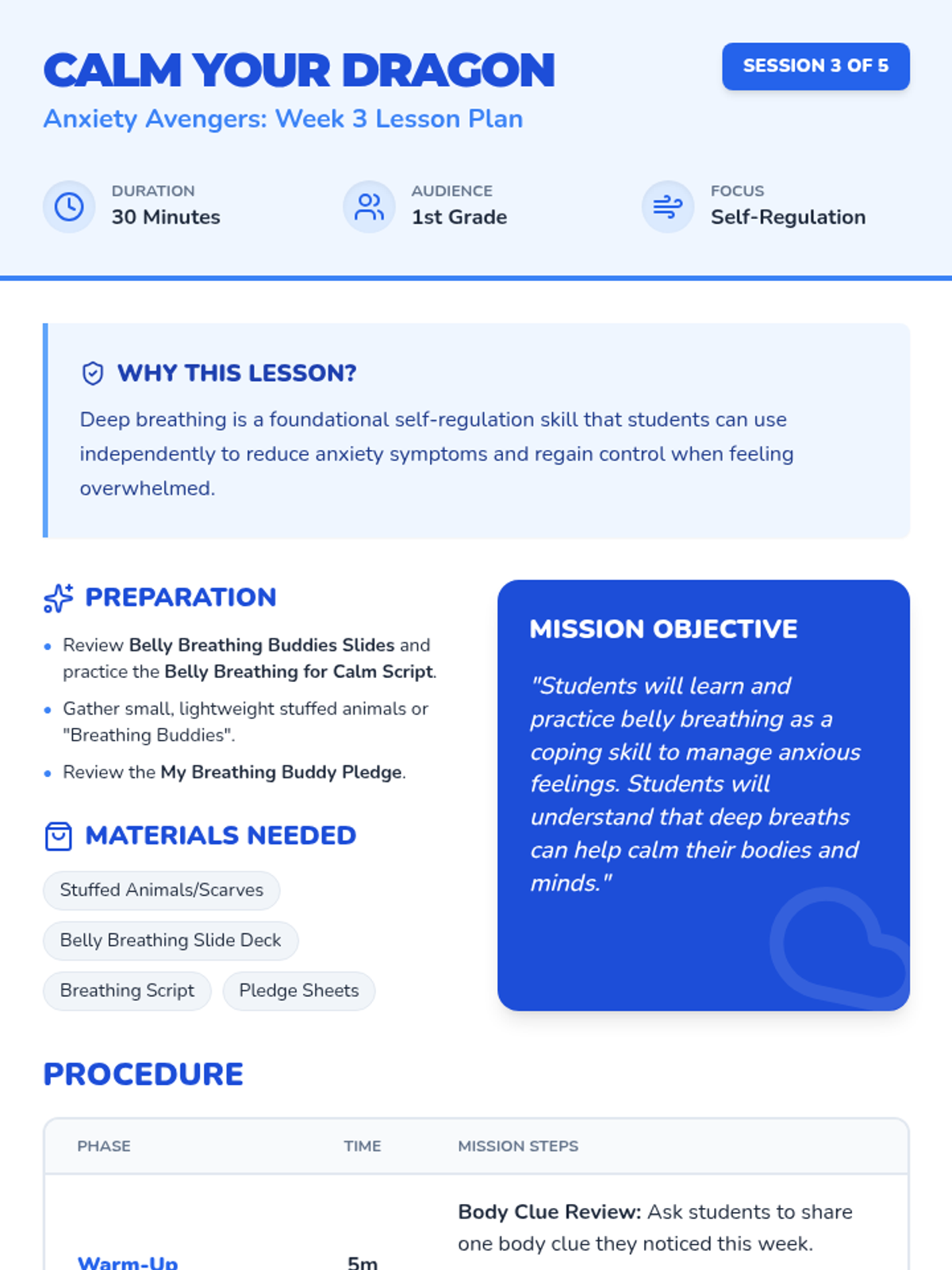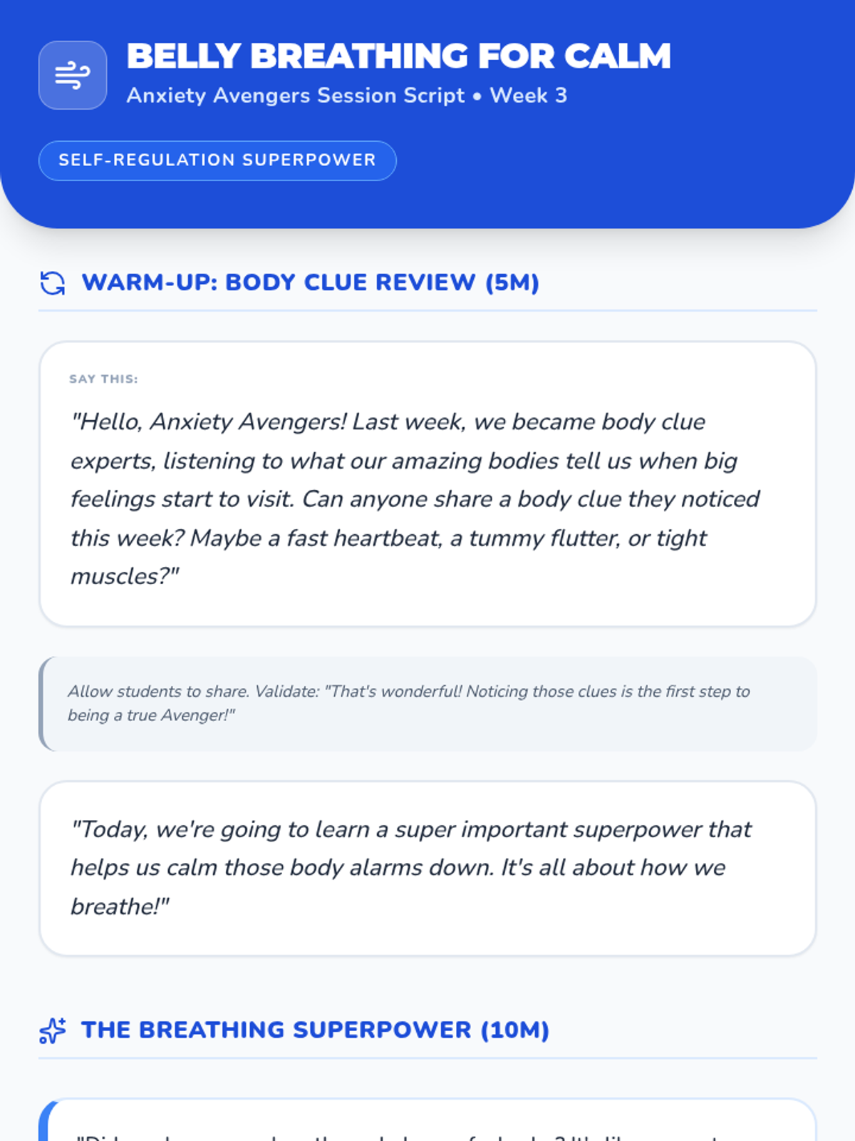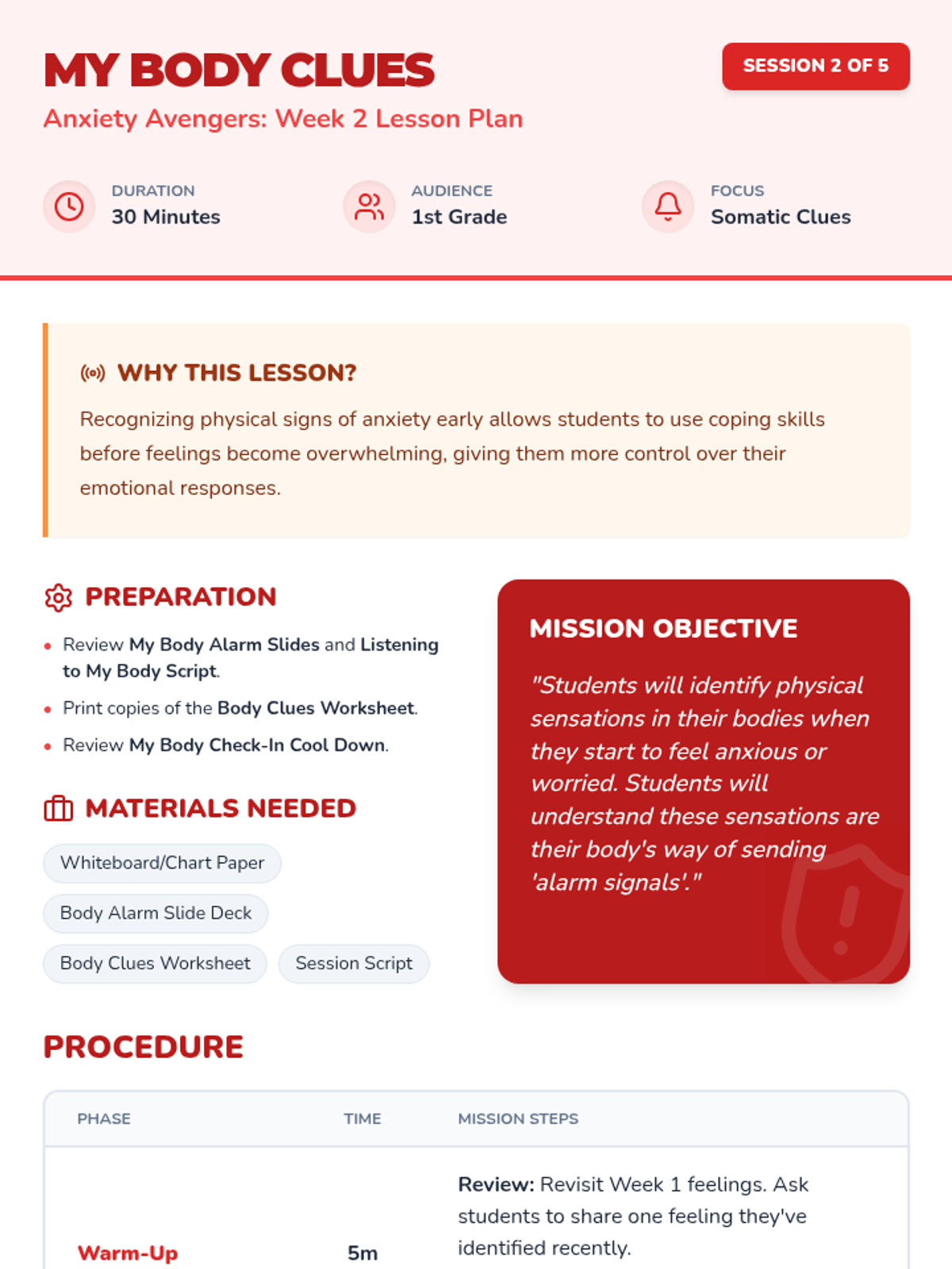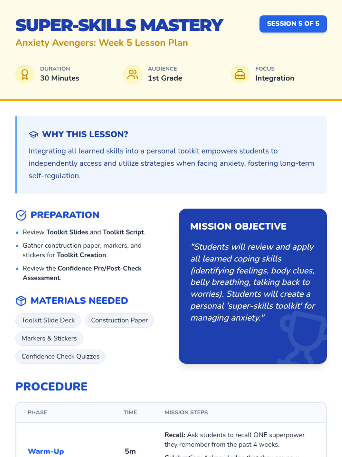 A 5-session small group program for 1st-grade students focusing on identifying feelings, recognizing body clues, practicing belly breathing, and challenging anxious thoughts through a superhero-themed lens.