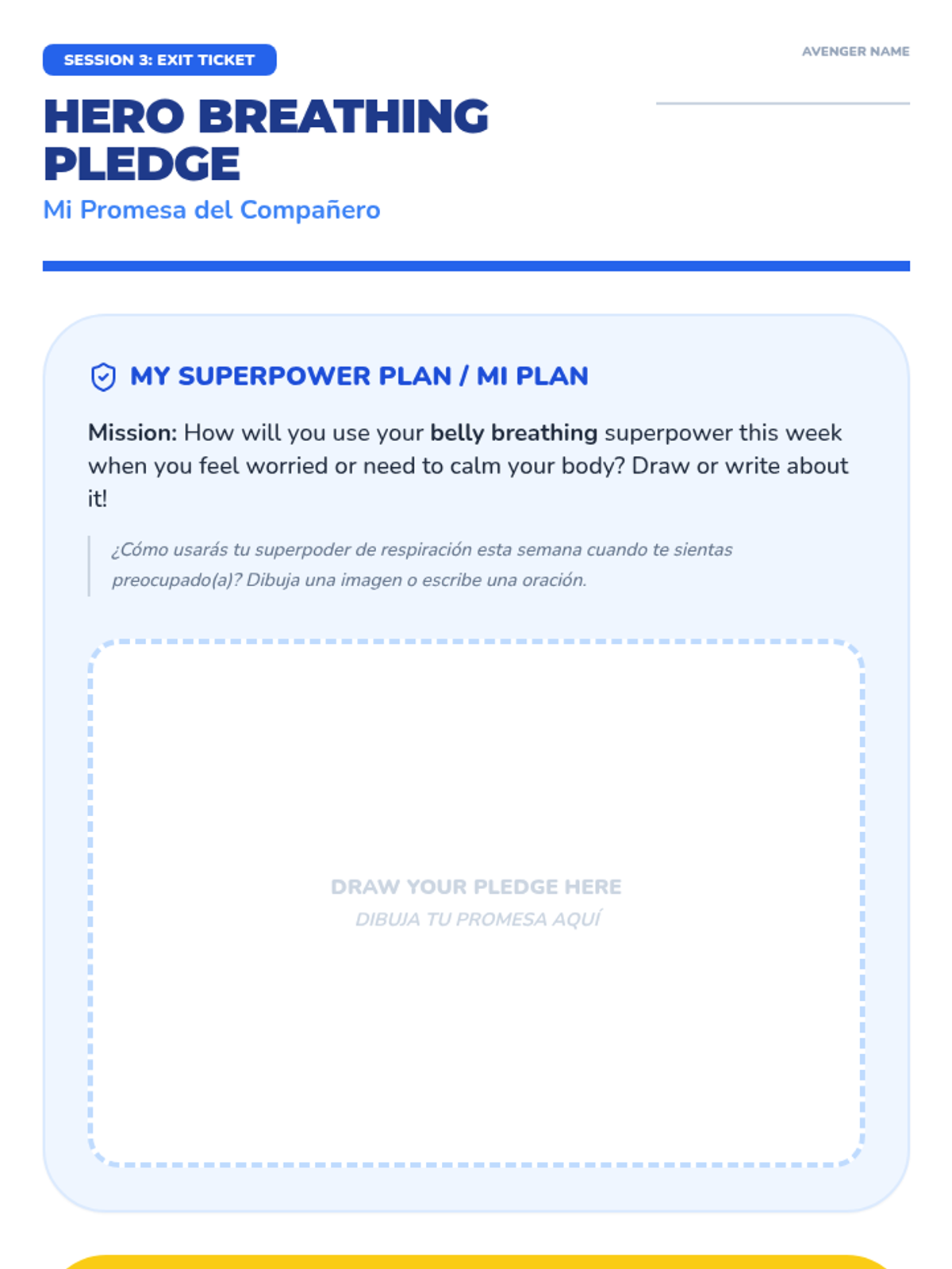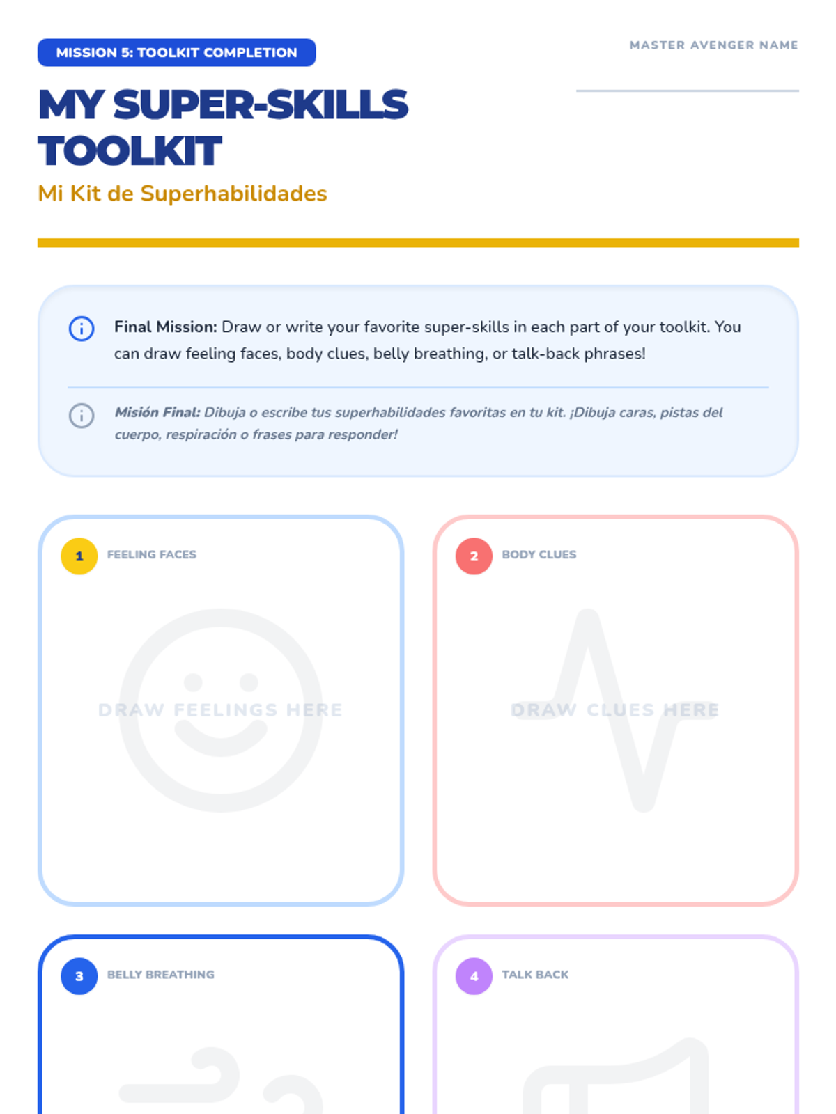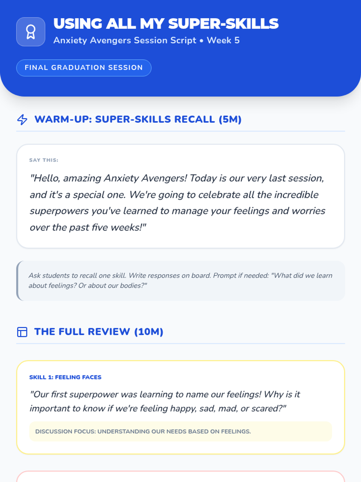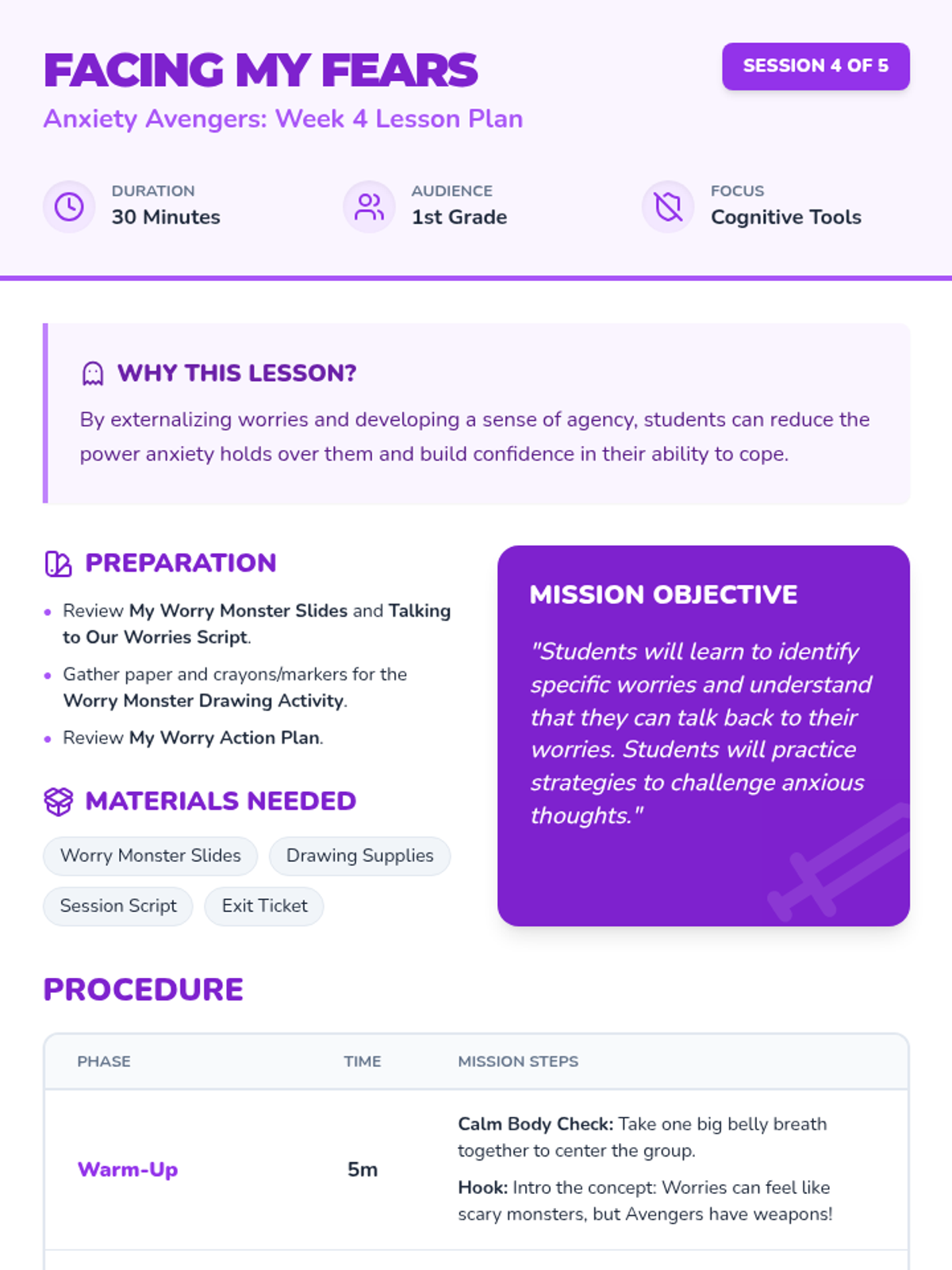 A 5-session small group program for 1st-grade students focusing on identifying feelings, recognizing body clues, practicing belly breathing, and challenging anxious thoughts through a superhero-themed lens.