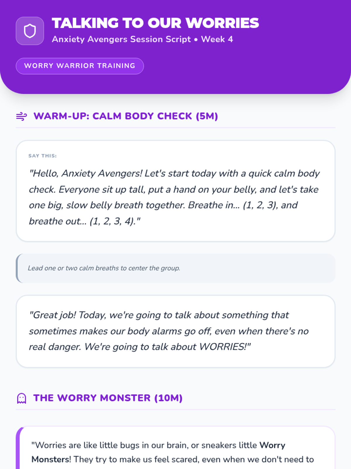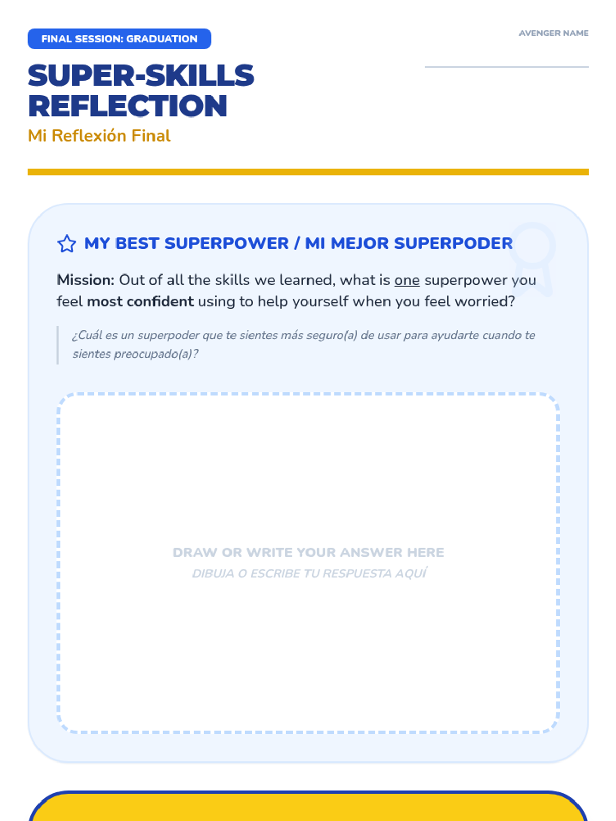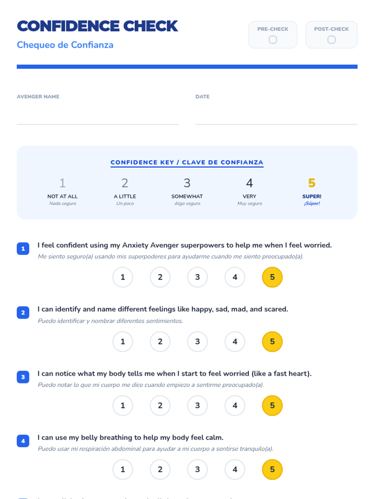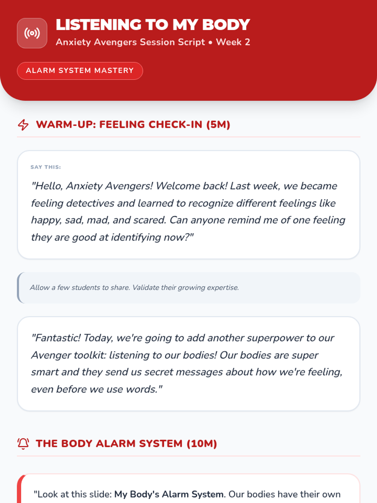 A 5-session small group program for 1st-grade students focusing on identifying feelings, recognizing body clues, practicing belly breathing, and challenging anxious thoughts through a superhero-themed lens.
