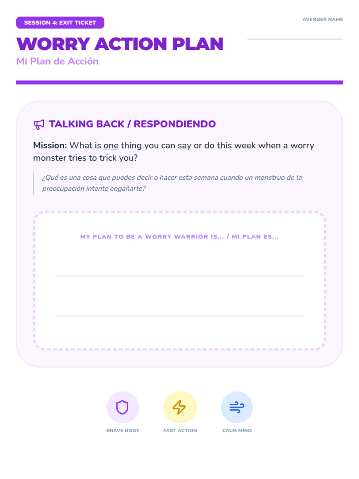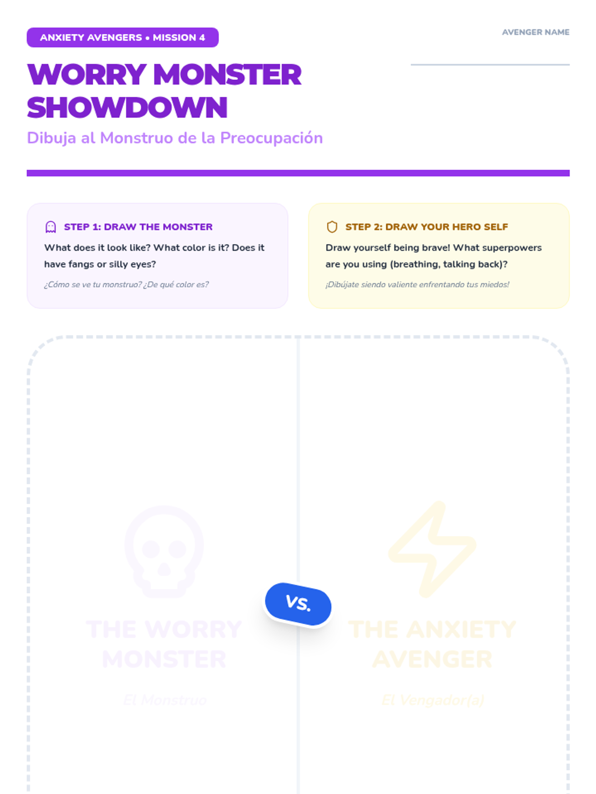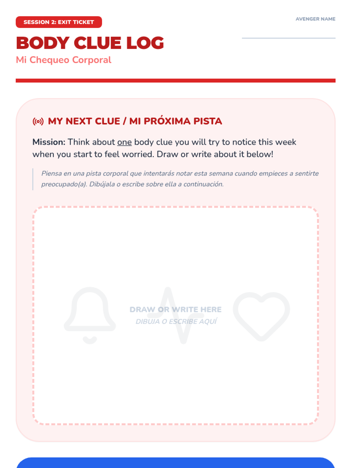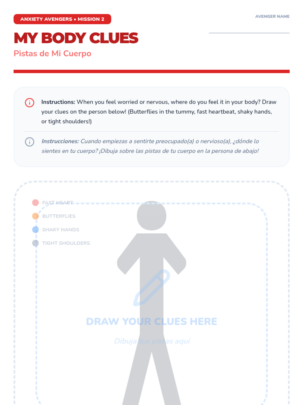 A 5-session small group program for 1st-grade students focusing on identifying feelings, recognizing body clues, practicing belly breathing, and challenging anxious thoughts through a superhero-themed lens.