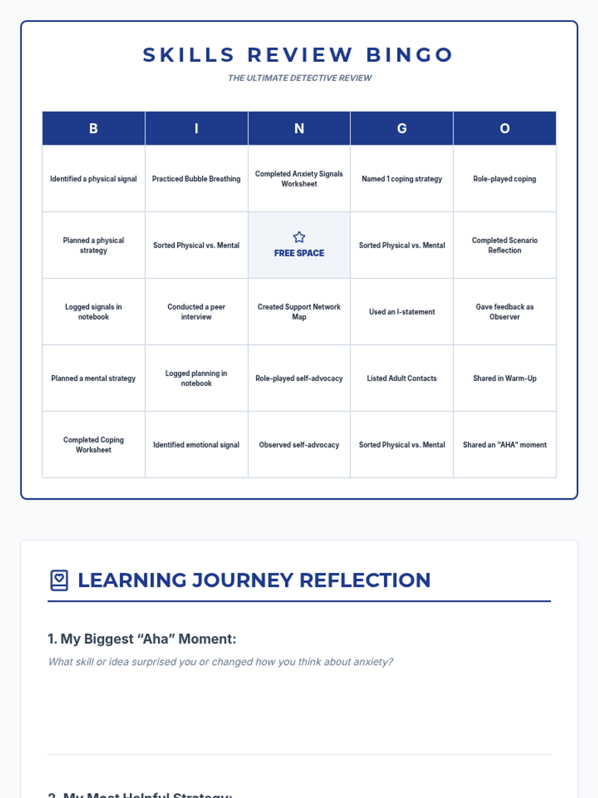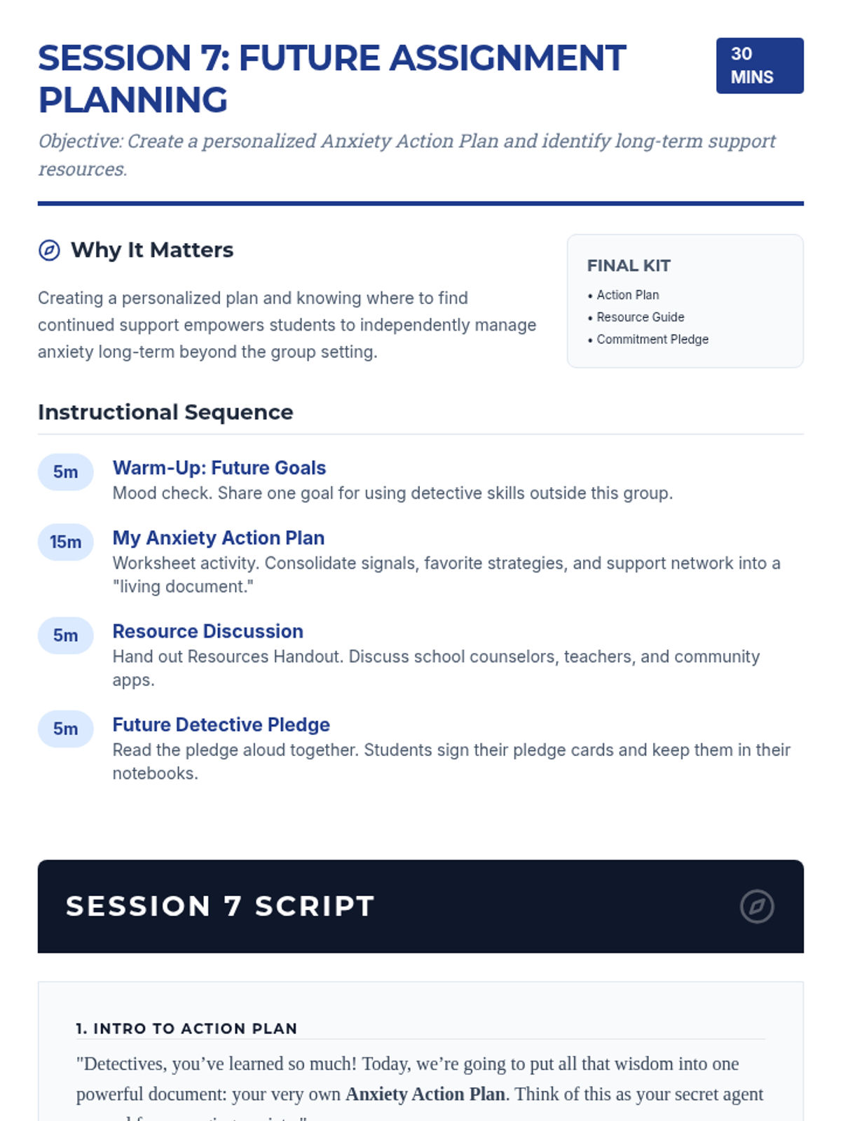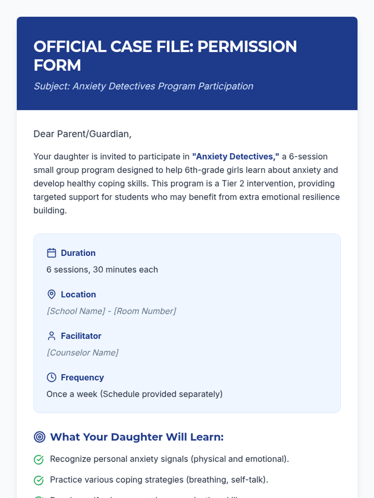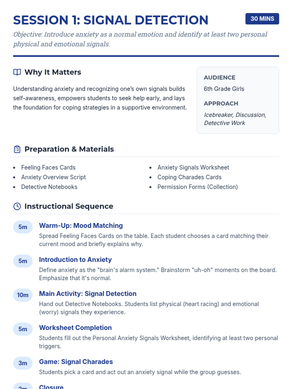 A 7-session Tier 2 intervention program for 6th-grade girls, using a detective-themed approach to build self-awareness, coping strategies, and resilience against anxiety. Students learn to identify personal signals, practice diverse coping tools, and build a strong support network through interactive activities and role-plays.