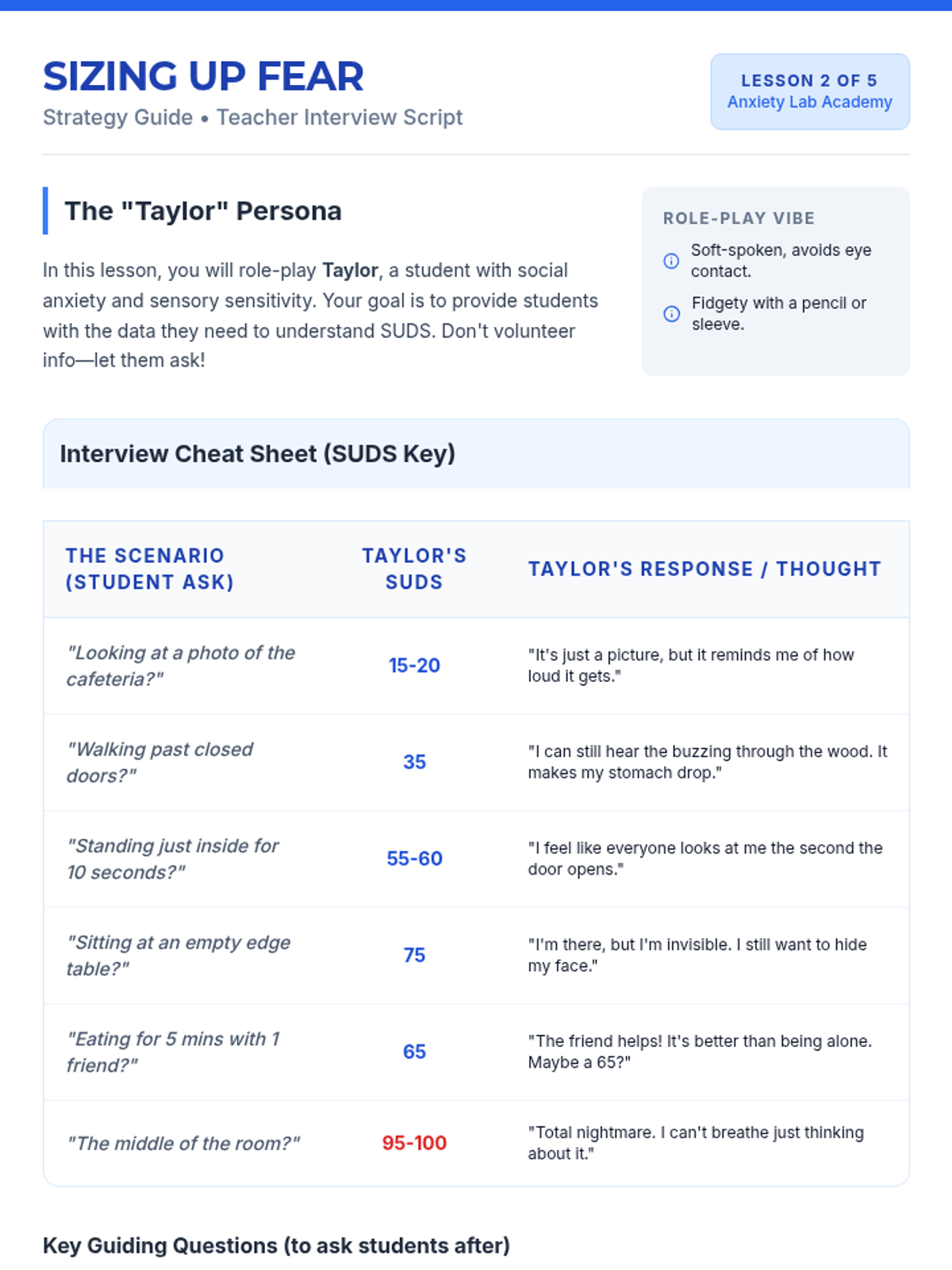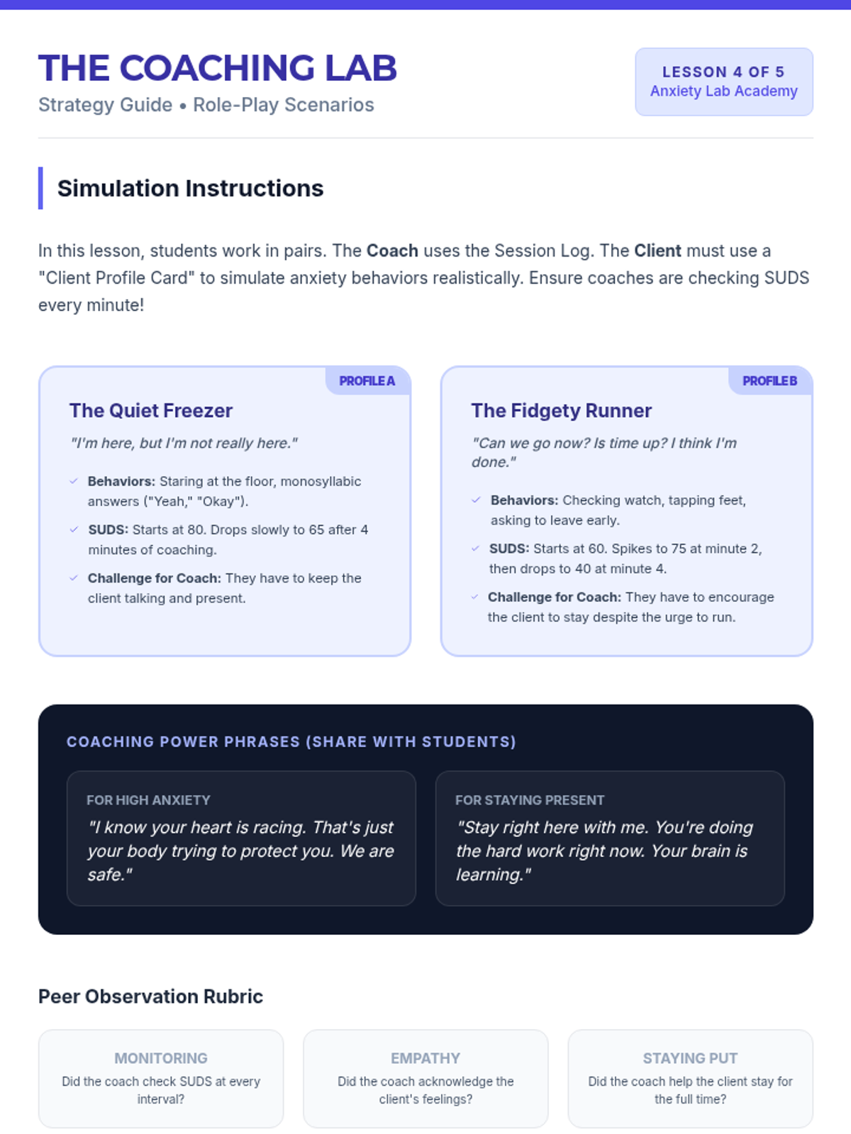 A project-based unit where 6th-grade students act as 'Anxiety Coaches' for fictional characters. They learn to identify avoidance behaviors, use the SUDS scale, and design gradual exposure hierarchies to help characters overcome fears safely.
