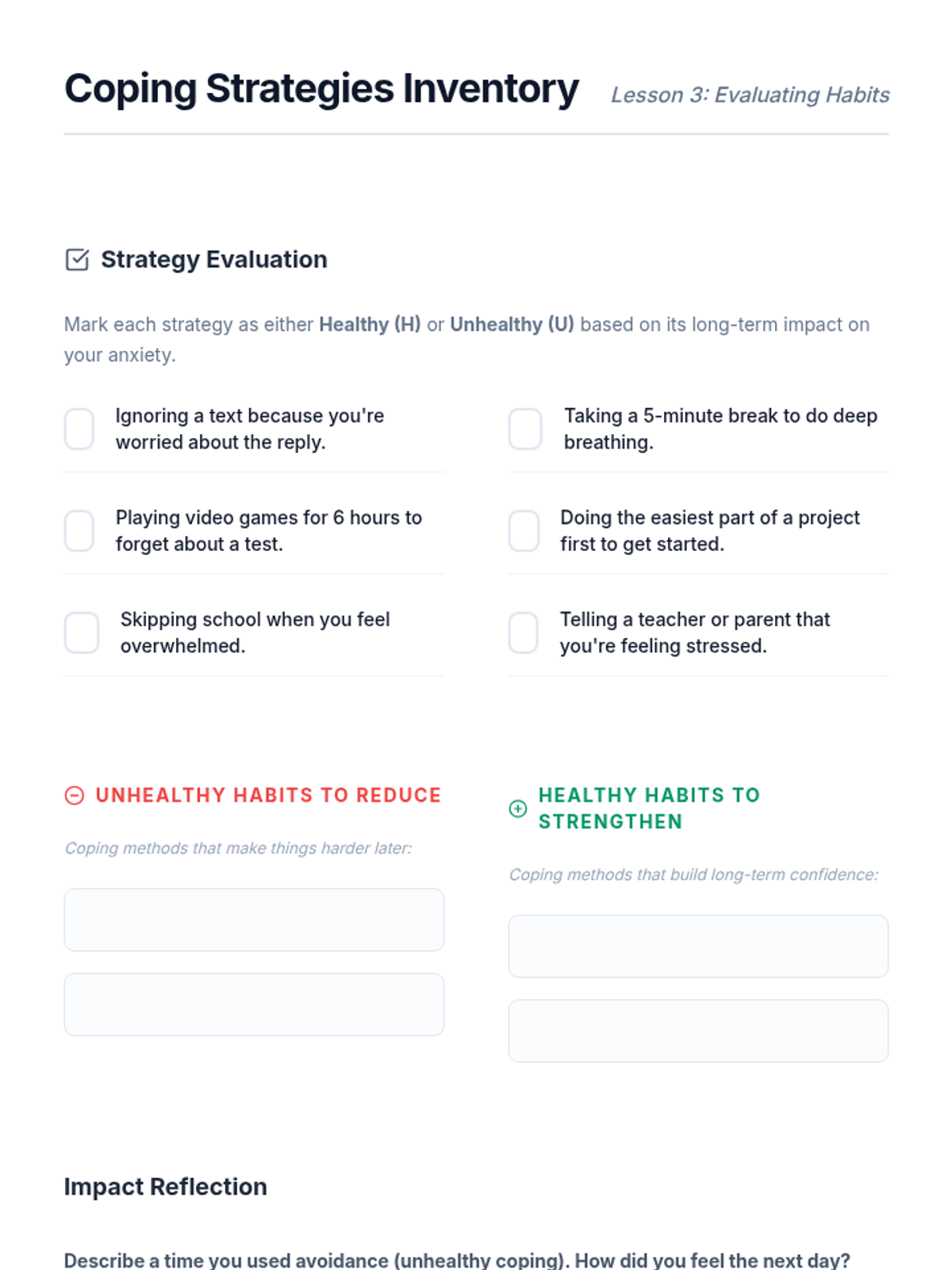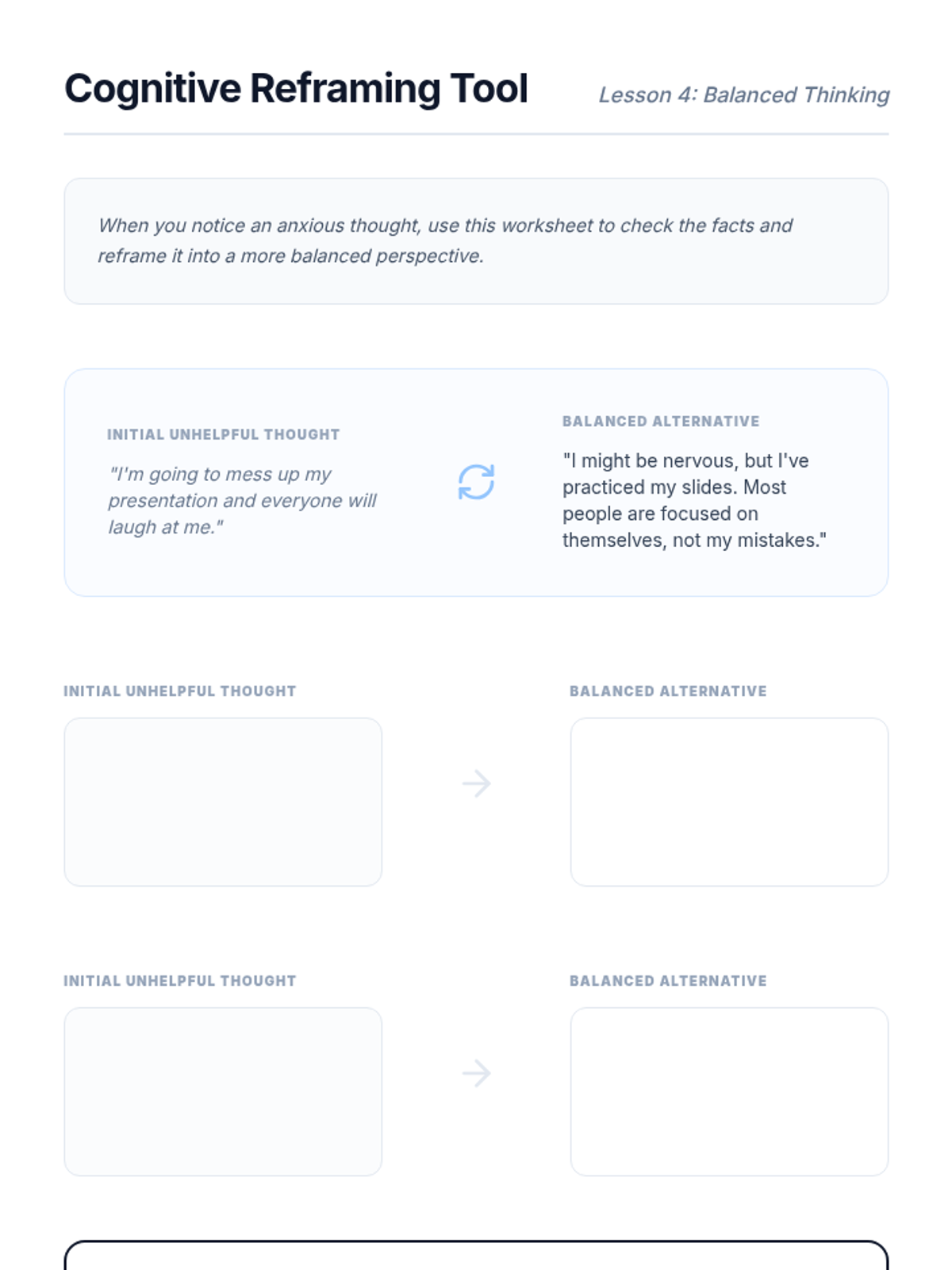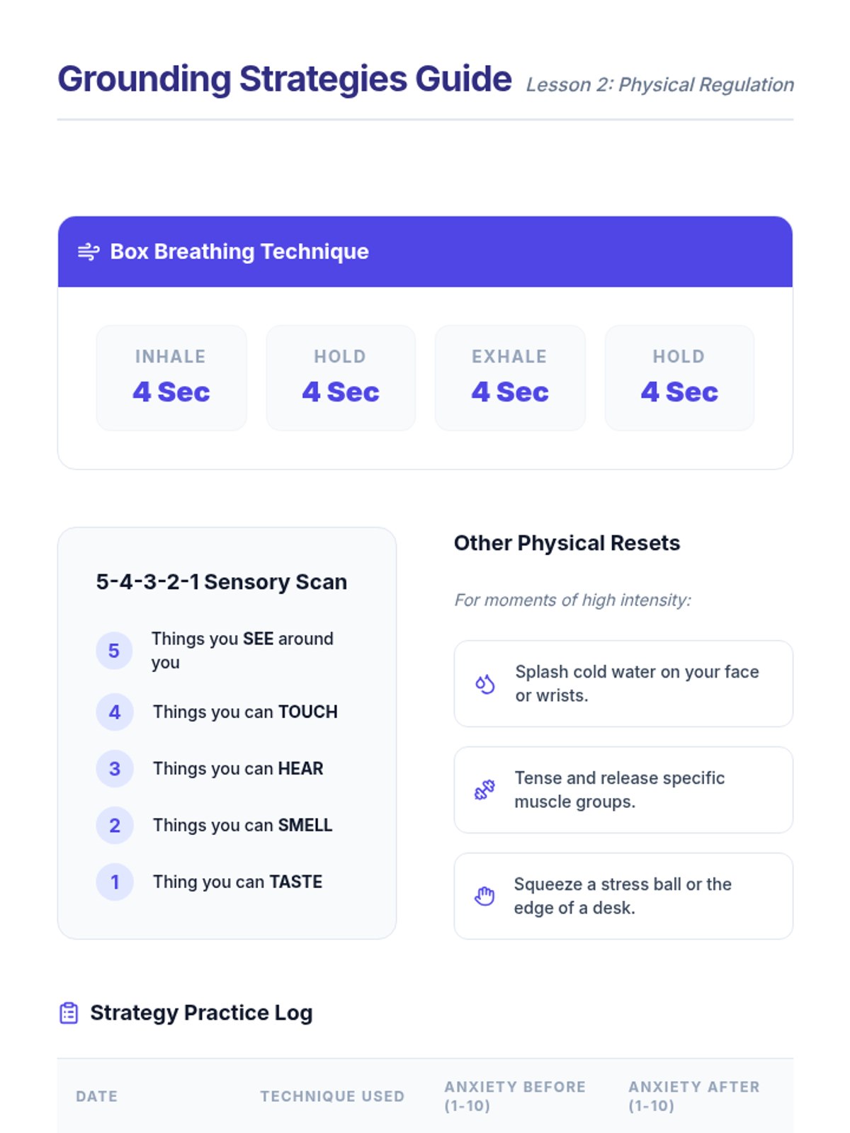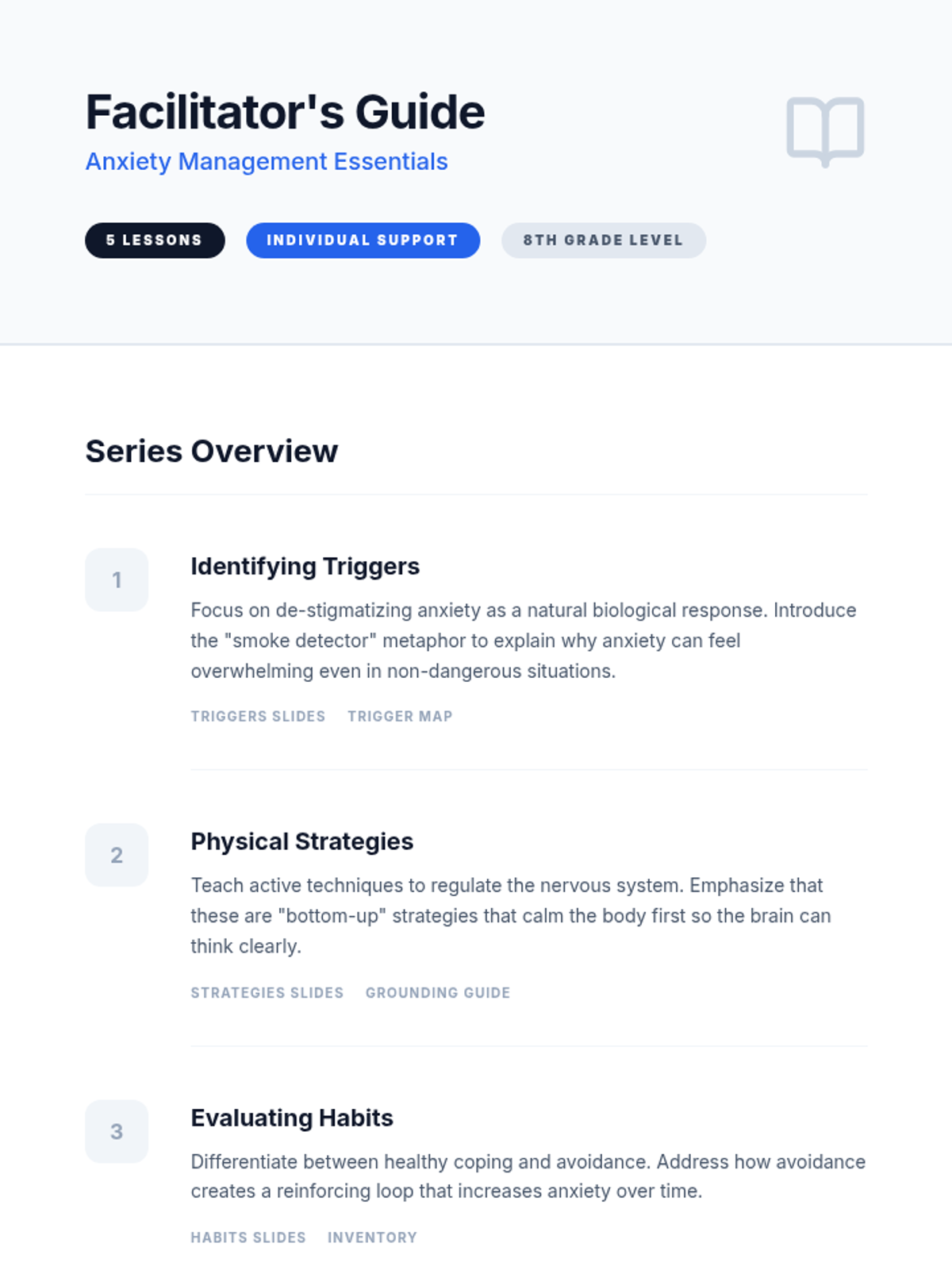 A 5-lesson series for 8th-grade students focused on understanding the biological basis of anxiety and developing practical tools for management through trigger identification, physical grounding, and cognitive reframing.