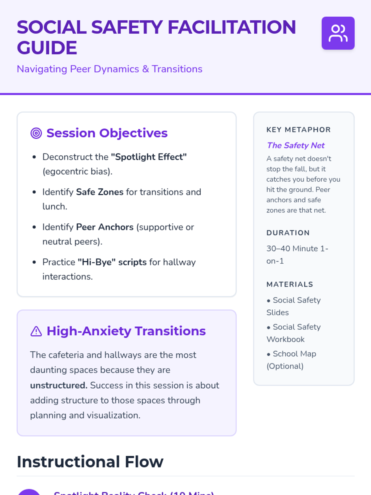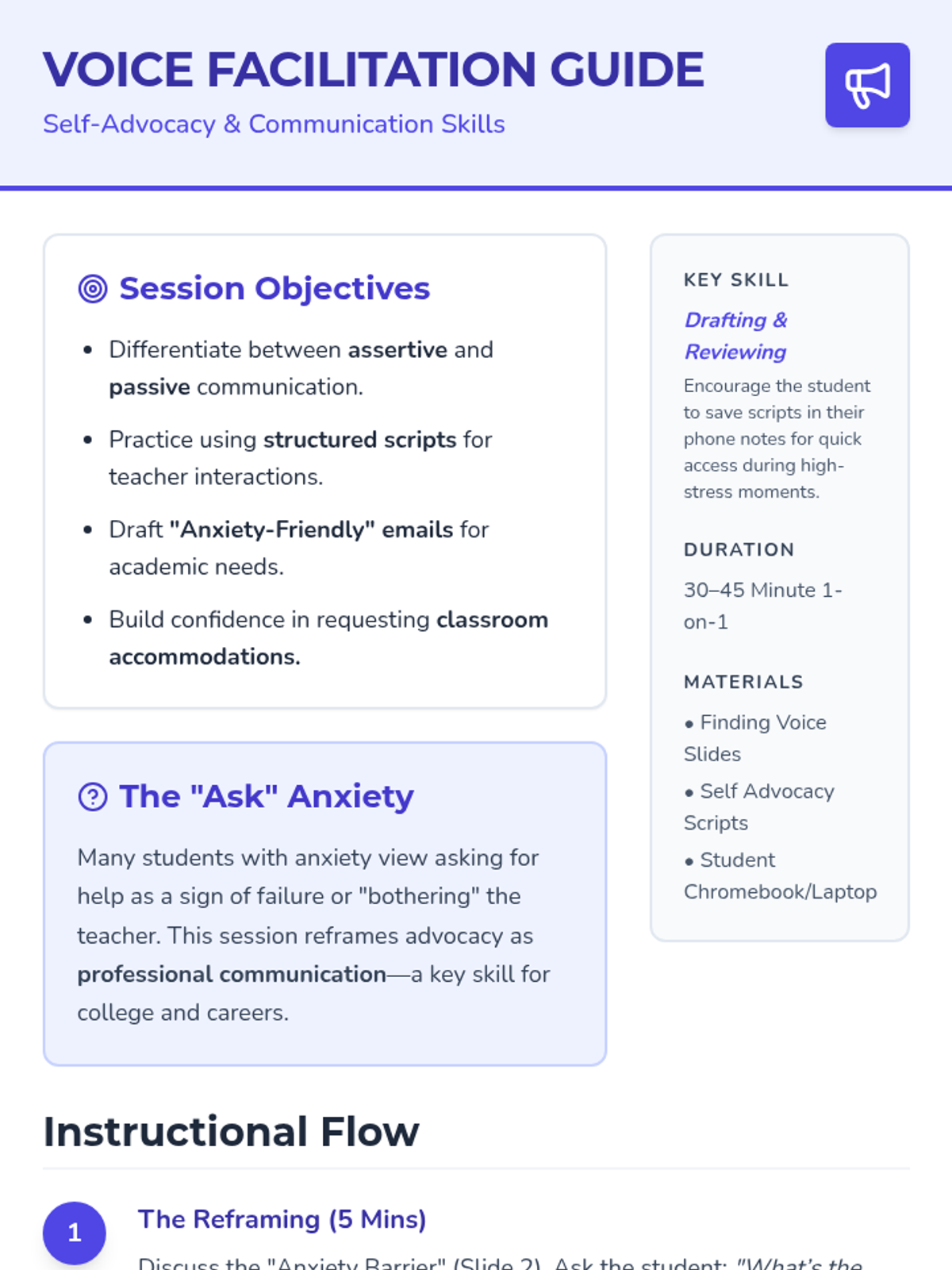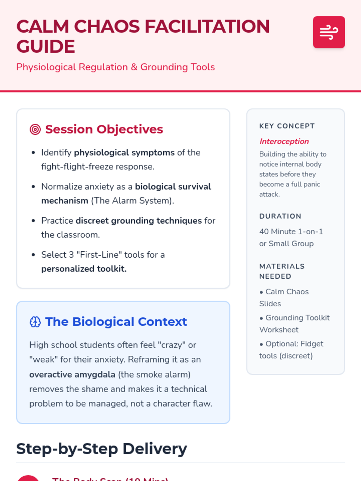 A comprehensive sequence of lessons designed for high school students managing re-entry and school-based anxiety. The curriculum focuses on physical and psychological safety, self-regulation tools, self-advocacy skills, and navigating social peer dynamics.