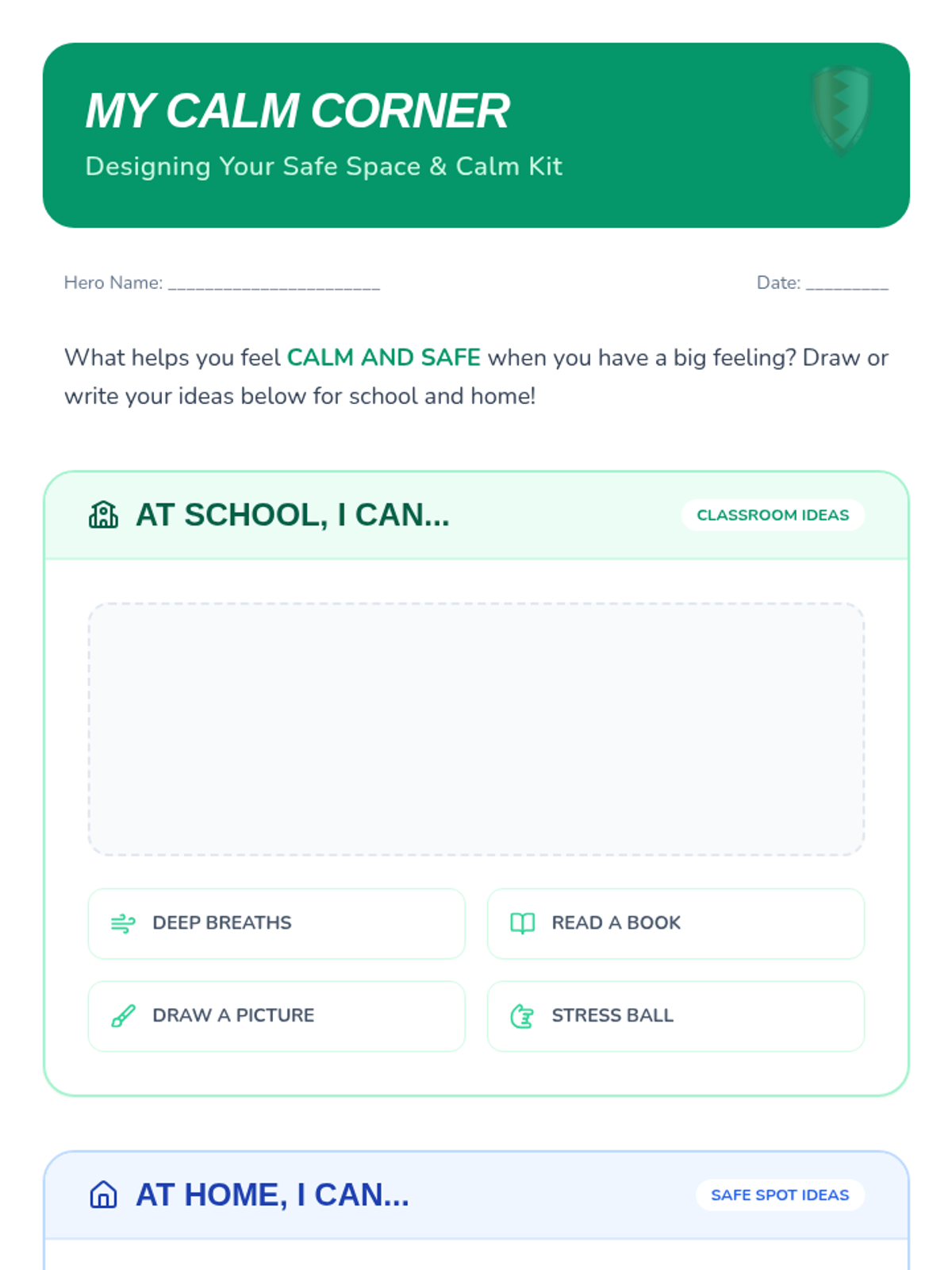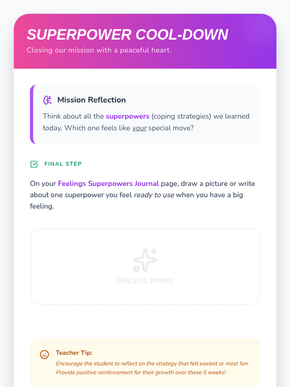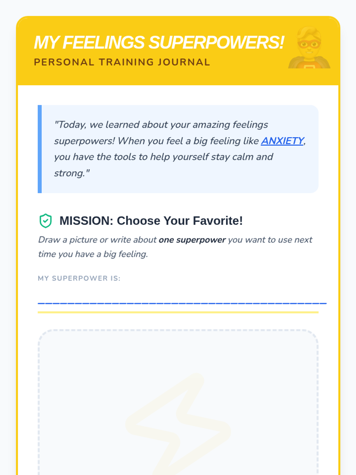 A 5-week individual counseling sequence for 2nd graders designed to build emotional literacy and anxiety management skills through a 'superhero' lens. Students learn to recognize physical symptoms, create personalized calm kits, and practice deep breathing techniques.