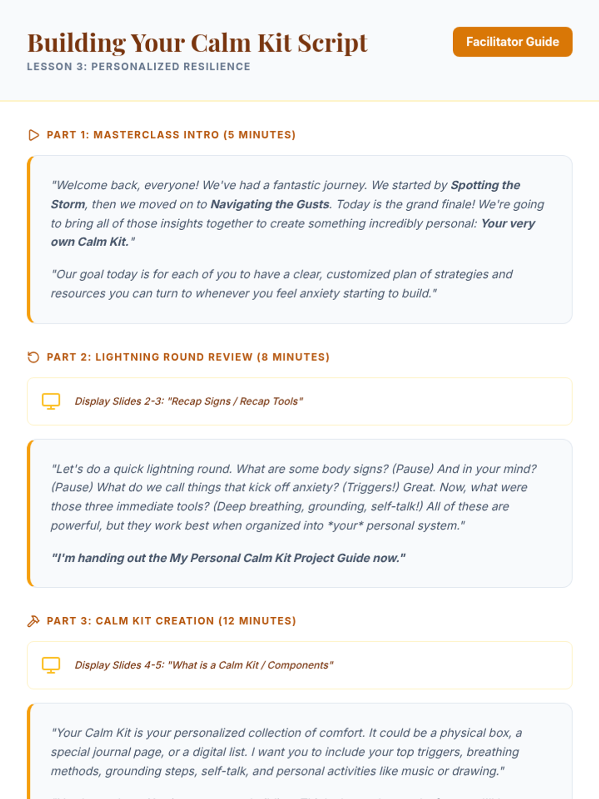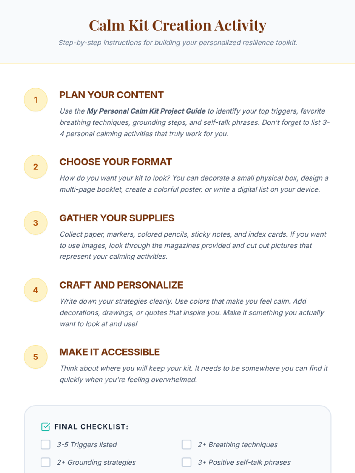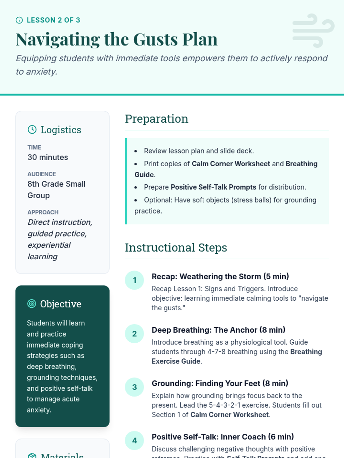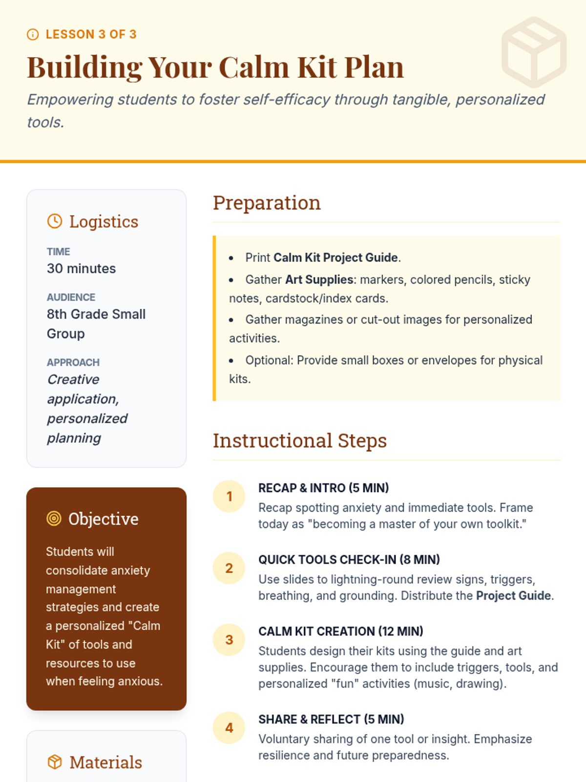 A three-part small group series for 8th graders designed to help them identify anxiety signs, learn immediate coping tools, and build a personalized 'Calm Kit' for long-term emotional resilience.