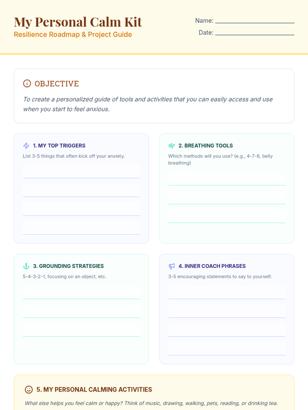 A 6-session counseling group designed to help students identify triggers, understand physical symptoms of anxiety, and build a personalized toolkit of coping strategies through a 'Calm Explorer' theme.
