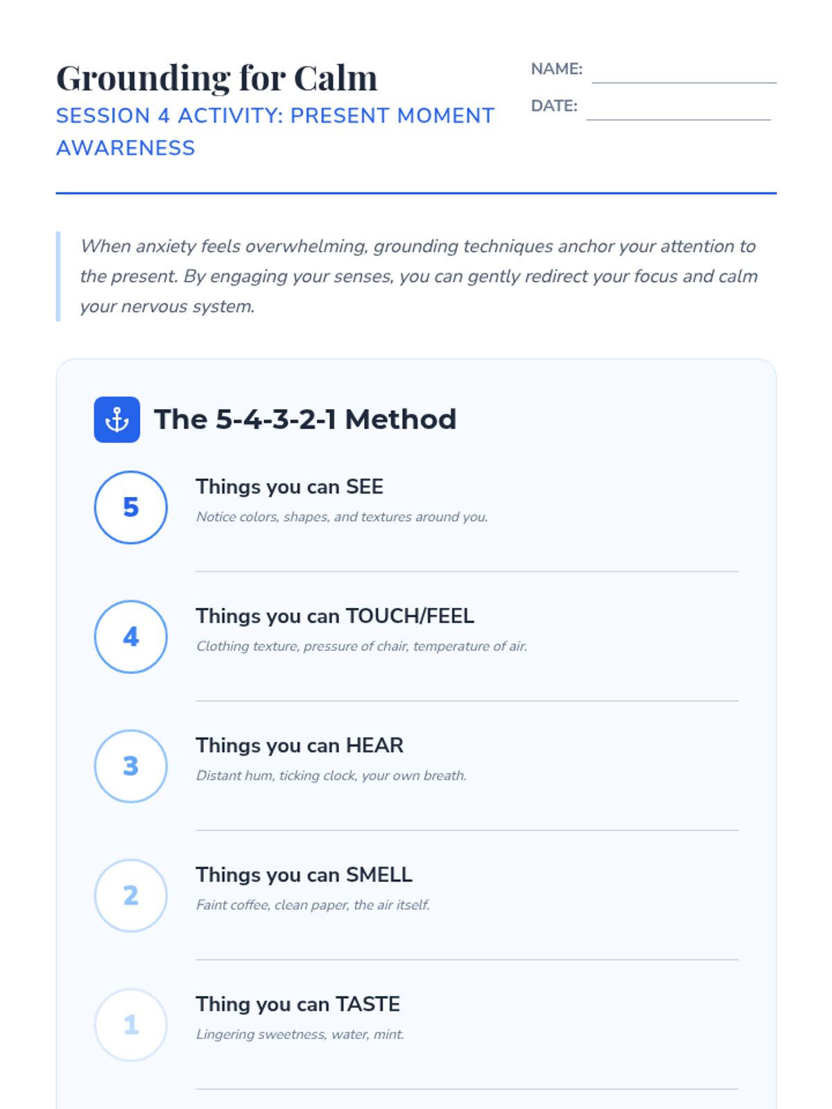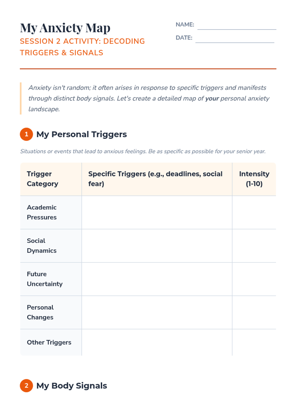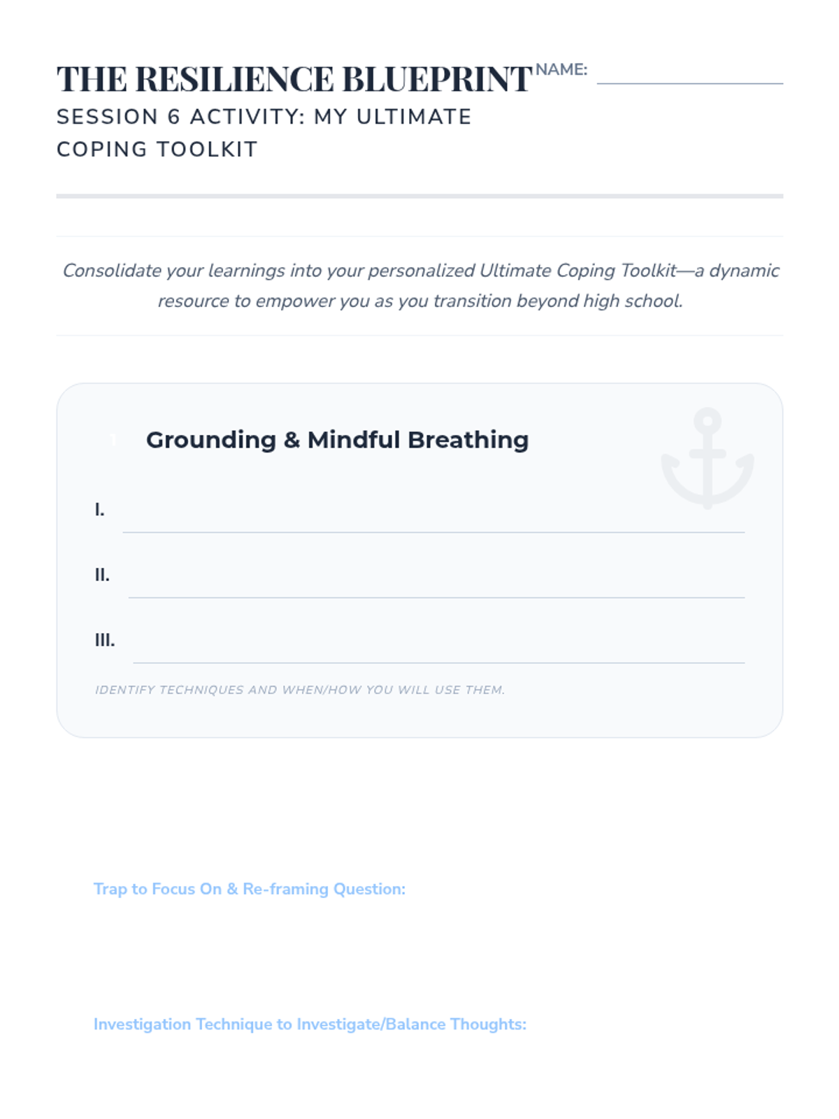 A comprehensive 6-session sequence designed to empower students with self-awareness and practical coping mechanisms to manage anxiety, specifically tailored for the transitions and pressures of senior year.