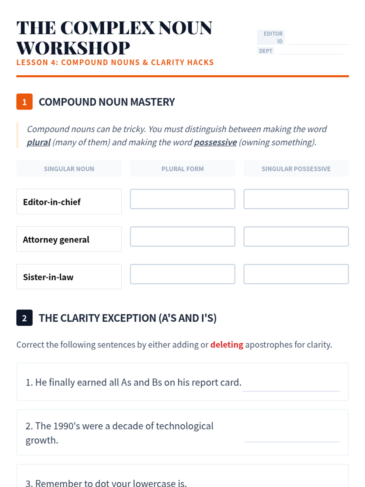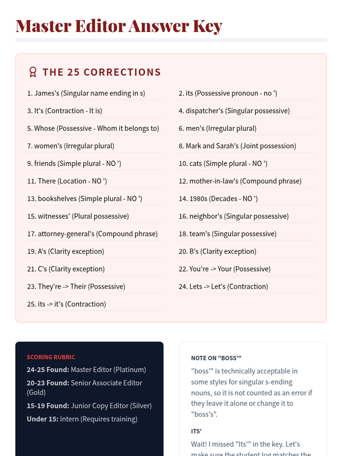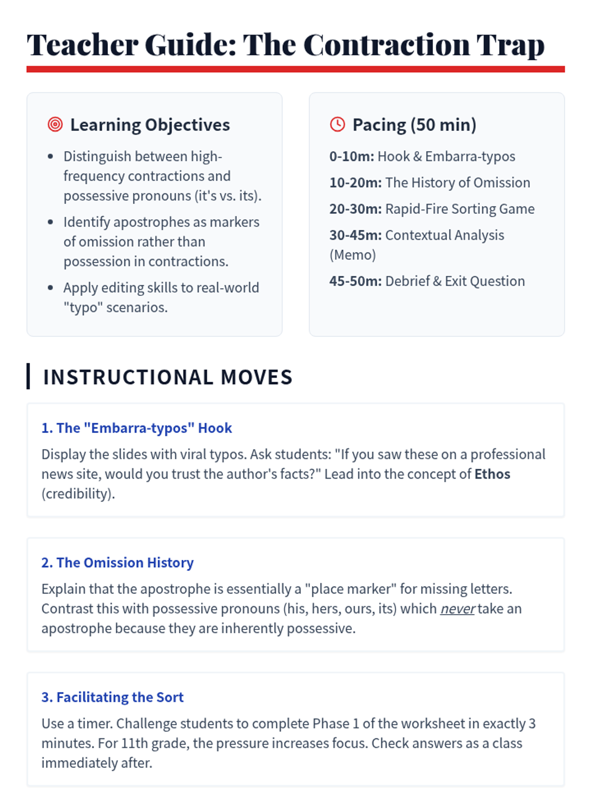 A comprehensive sequence for 11th-grade students focused on eliminating high-frequency apostrophe errors. Through gamification and simulated editing, students master contractions, singular/plural possession, joint ownership, and complex pluralization to improve their professional writing credibility.