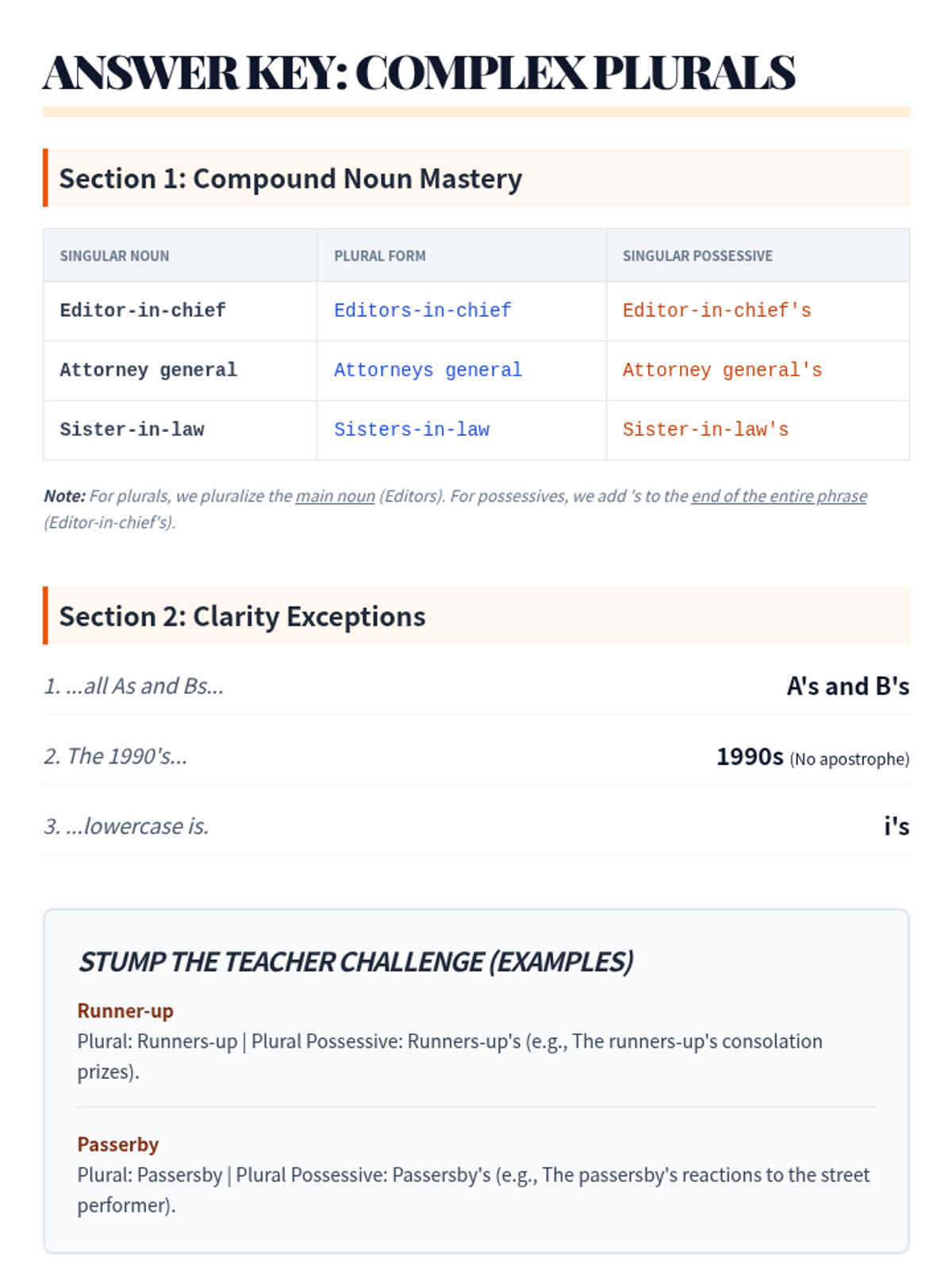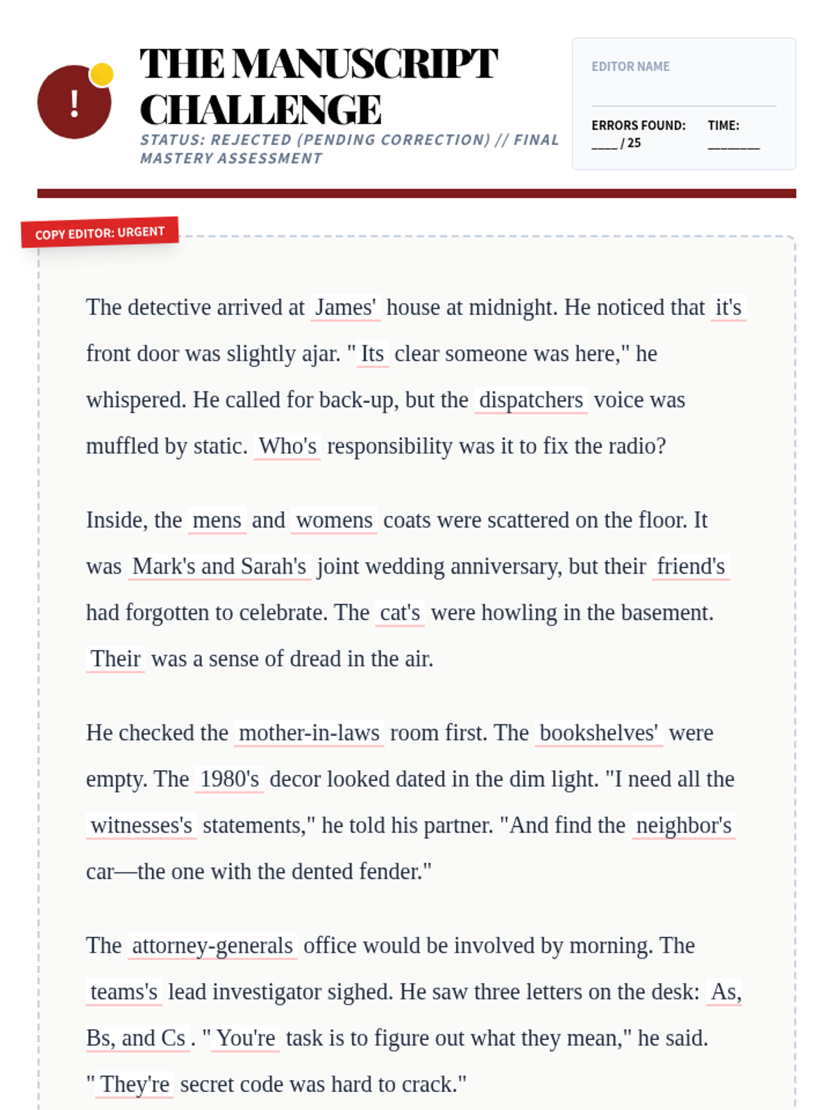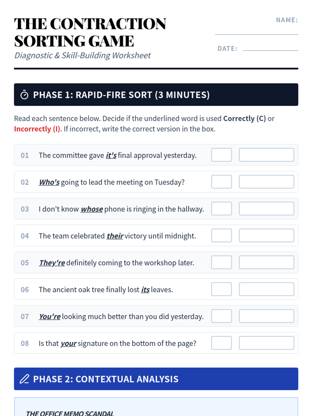 A comprehensive sequence for 11th-grade students focused on eliminating high-frequency apostrophe errors. Through gamification and simulated editing, students master contractions, singular/plural possession, joint ownership, and complex pluralization to improve their professional writing credibility.