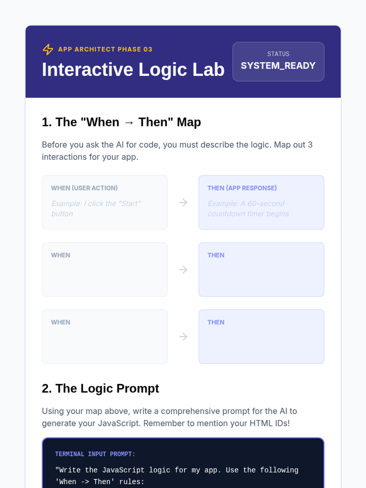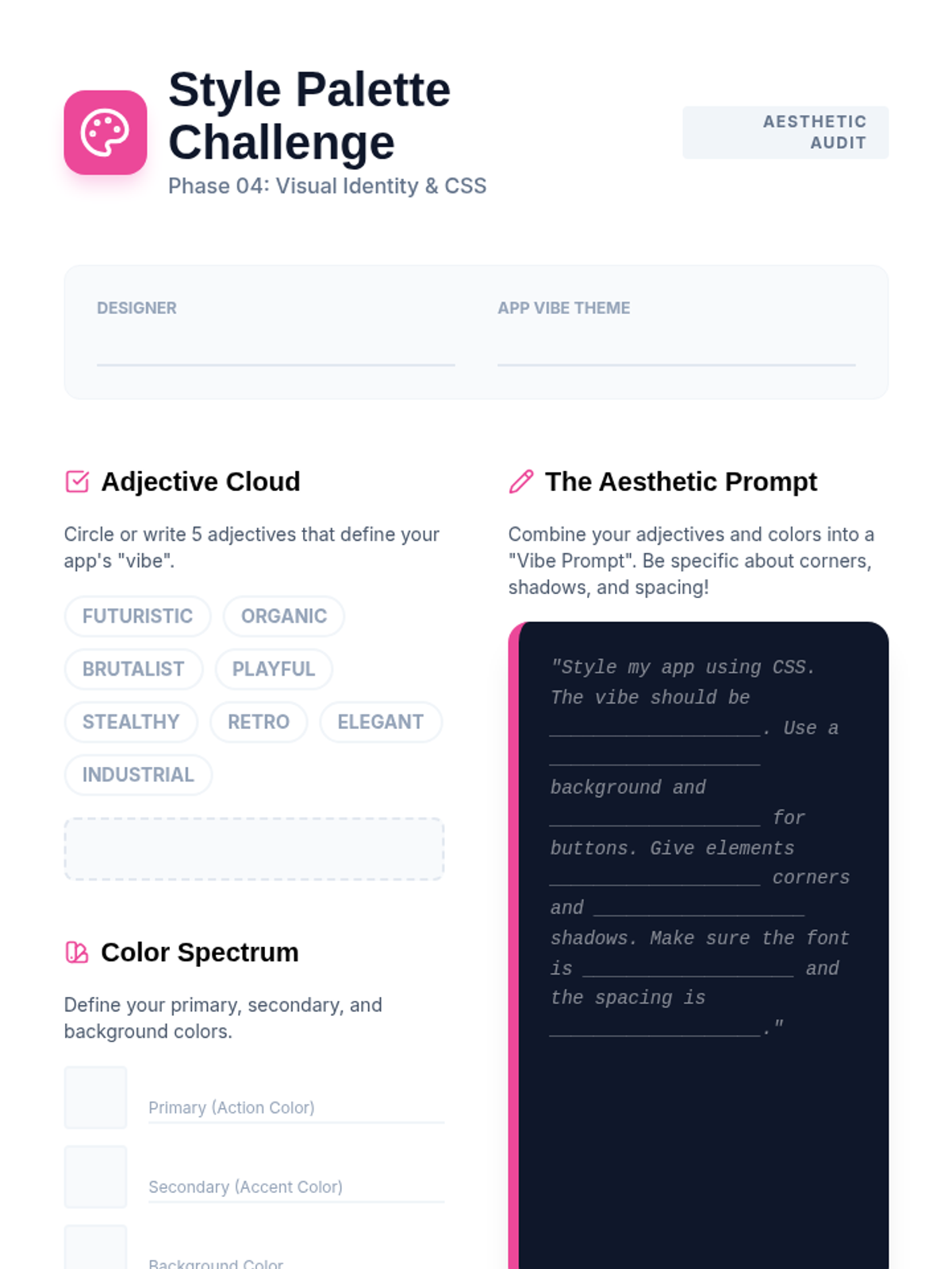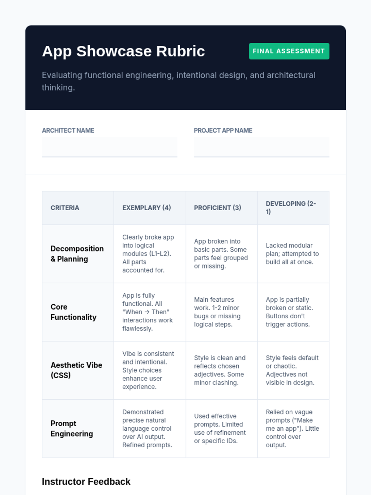 A project-based journey where students learn to build functional web applications using AI. They master decomposition, structural planning, logical implementation, and aesthetic styling to turn ideas into working digital products.