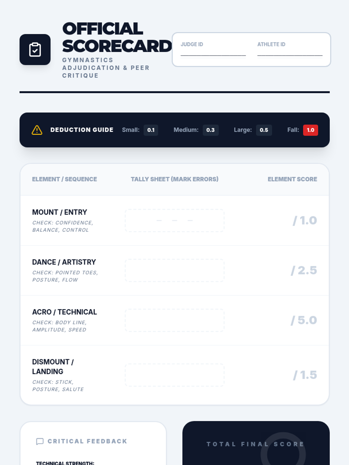 This sequence focuses on advanced gymnastics apparatus work, covering balance beam, vaulting mechanics, and artistic routine composition. Students transition from floor skills to technical apparatus navigation while developing performance psychology and movement critique skills suitable for undergraduate study.
