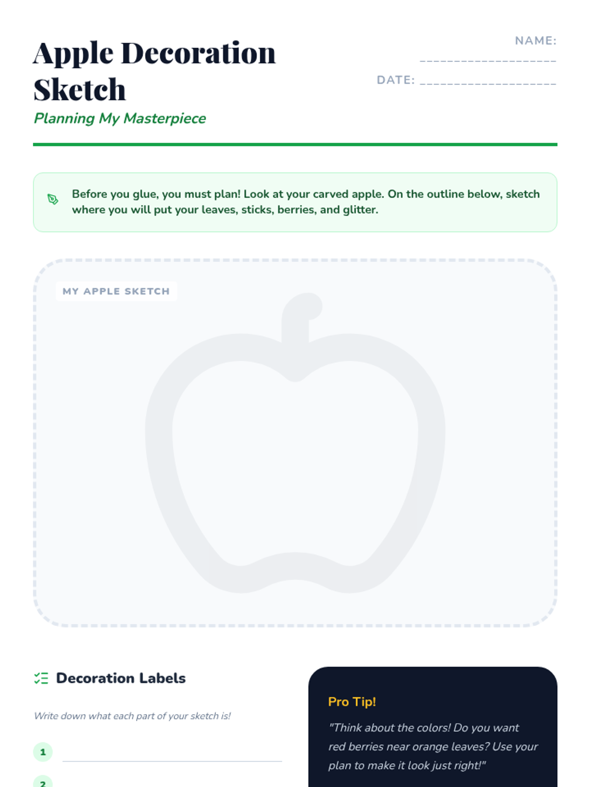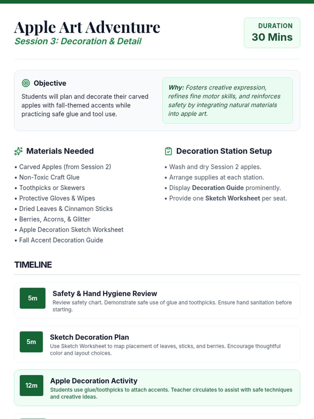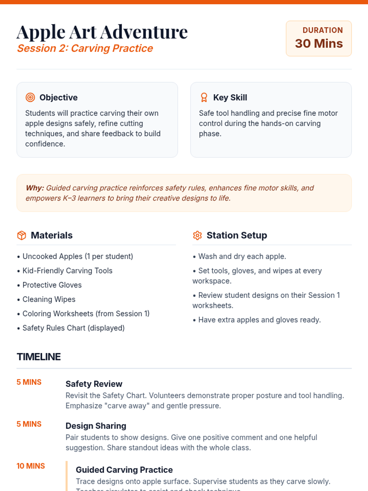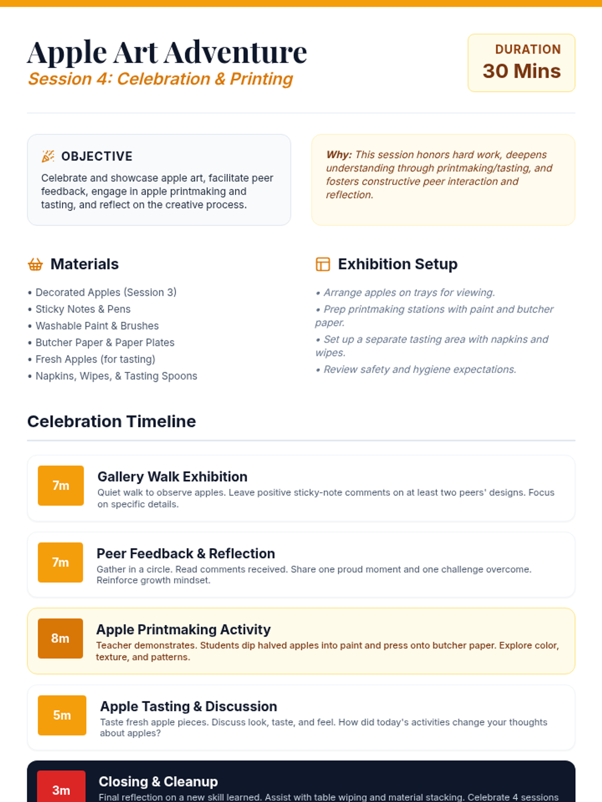 A 4-session fall-themed sequence for K-3 students focusing on apple anatomy, safe carving techniques, creative decoration, and celebratory printmaking. Students develop fine motor skills and safety awareness while creating unique edible art.