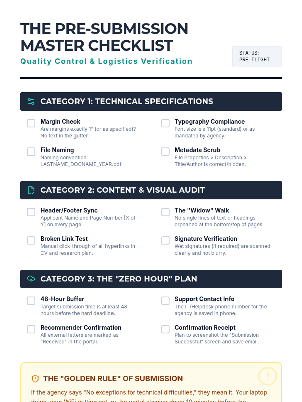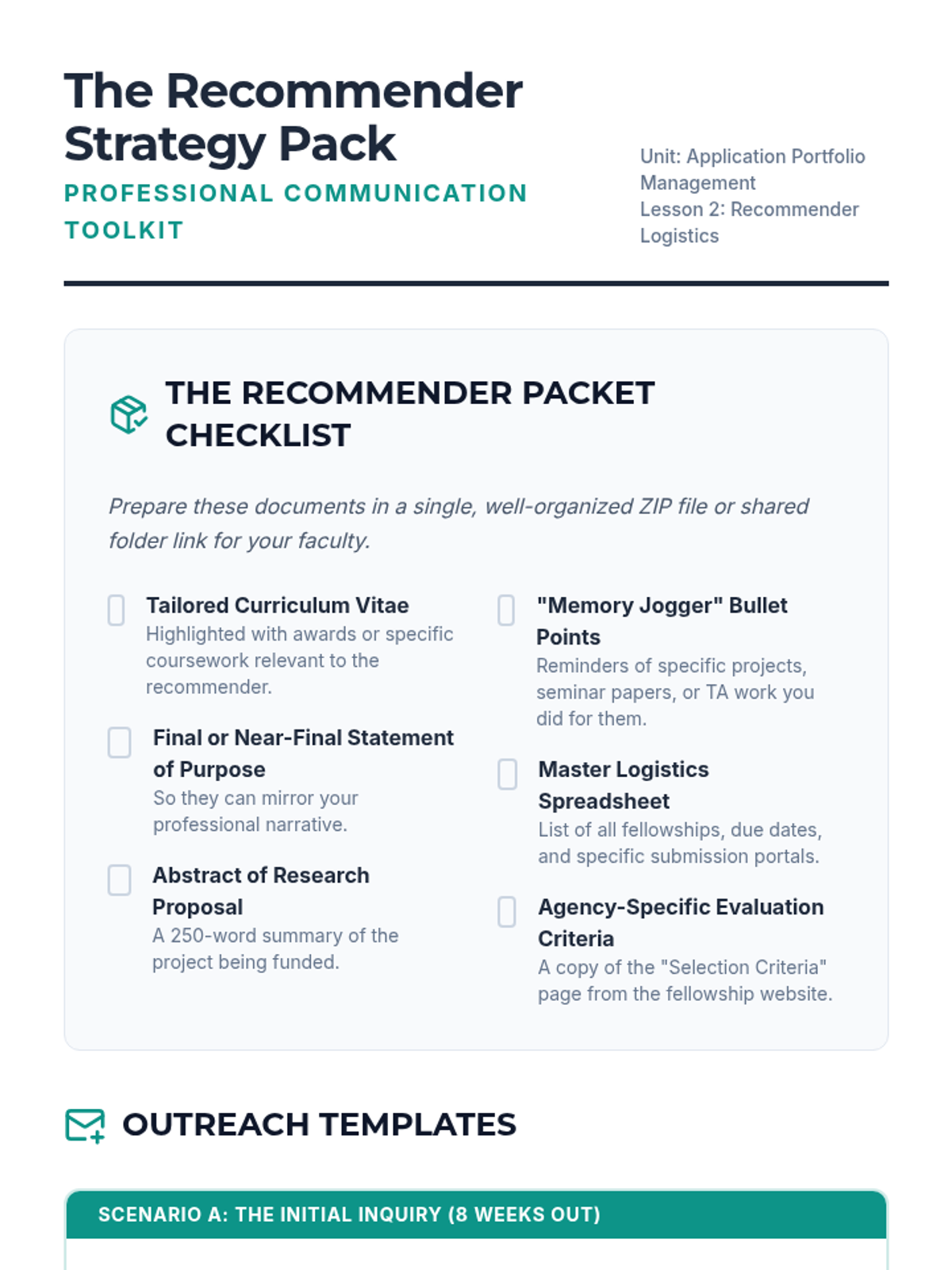 A comprehensive graduate-level sequence focused on the professional project management of fellowship and scholarship applications. Students learn to build tracking systems, manage recommenders strategically, curate funding-specific CVs, and ensure quality control for final submissions.