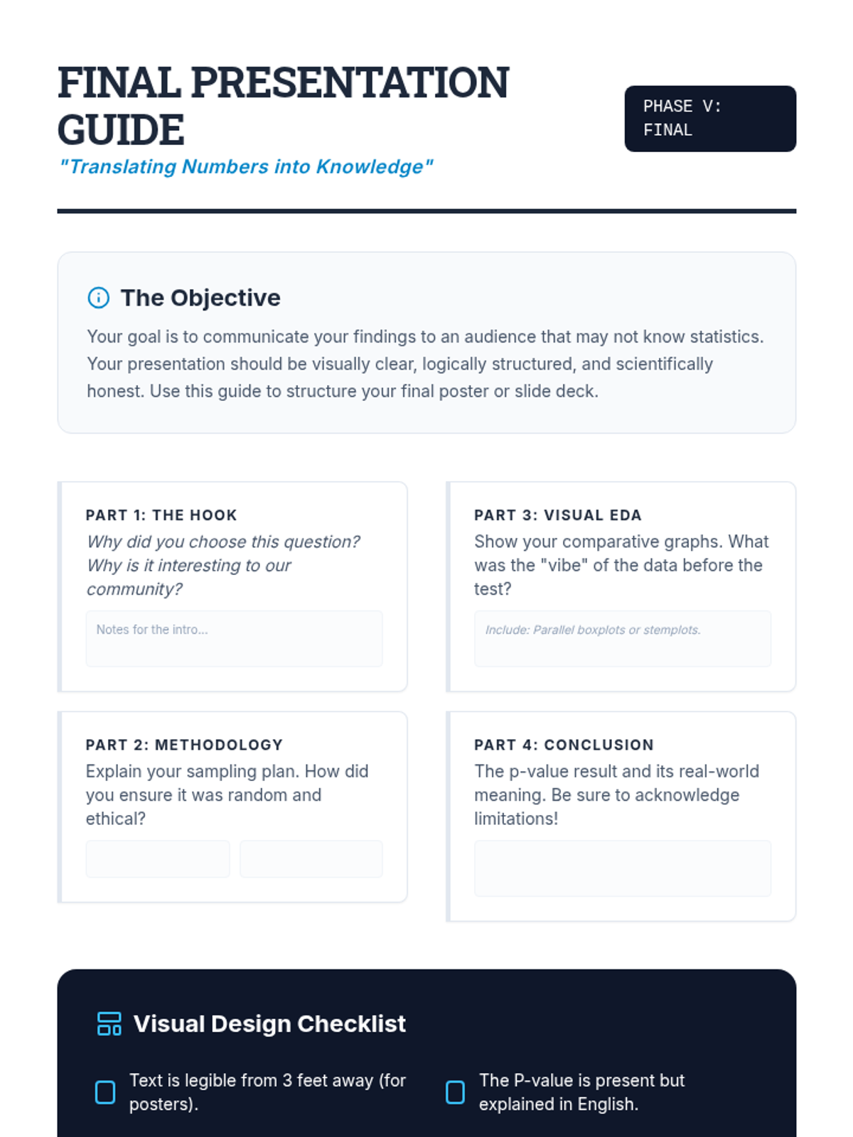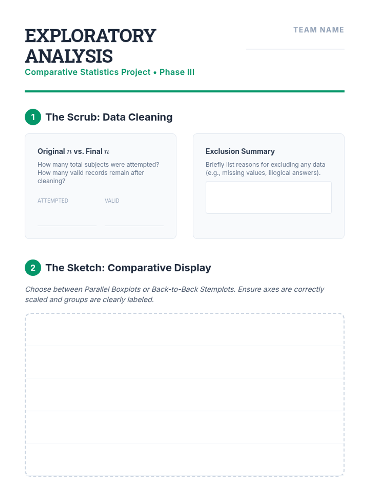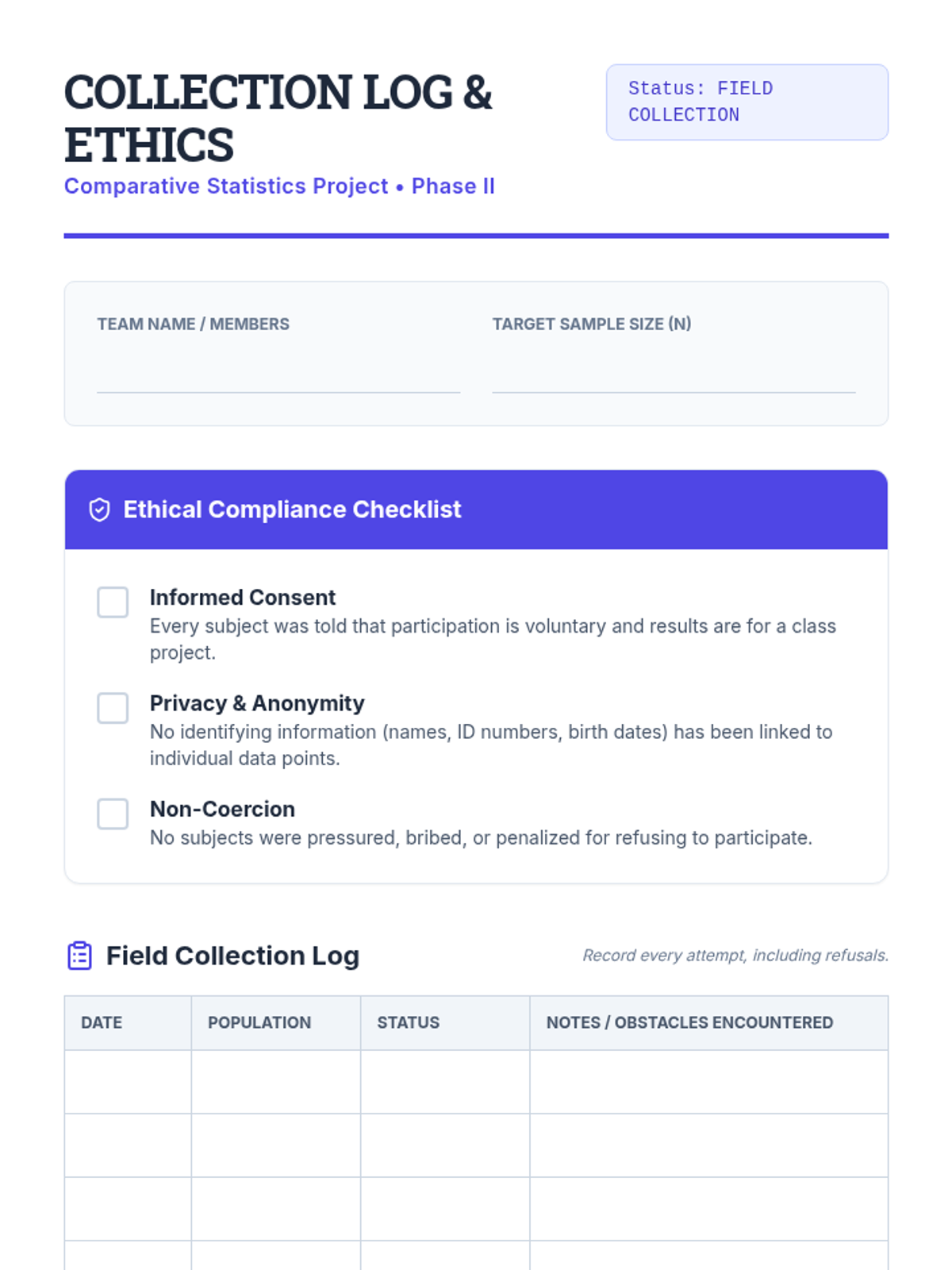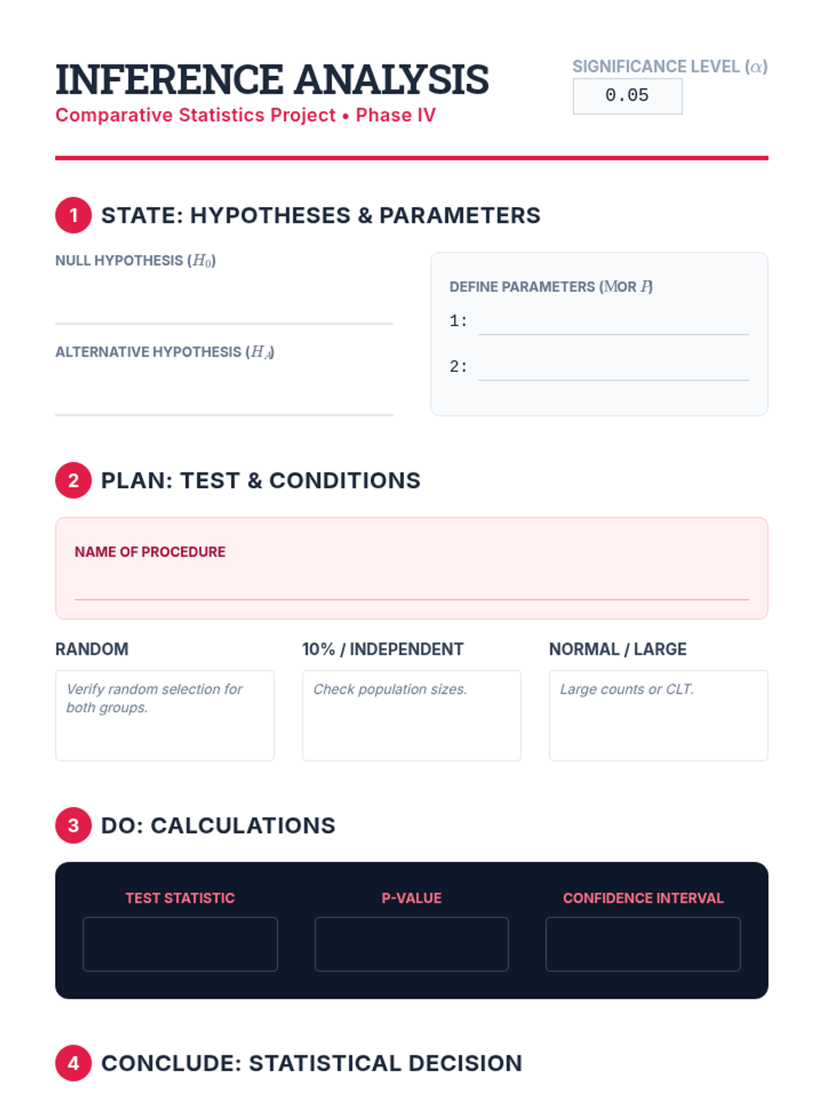 A project-based unit where 12th-grade students design and execute an original statistical study comparing two populations. Students move from research design and ethical data collection to exploratory data analysis and formal inferential testing, culminating in a professional research presentation.