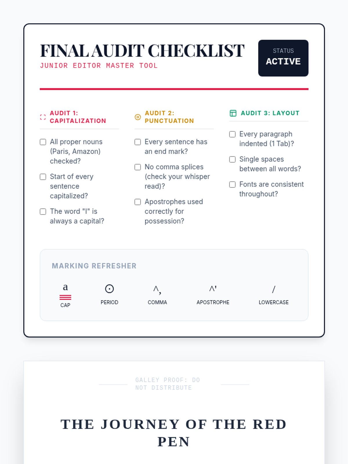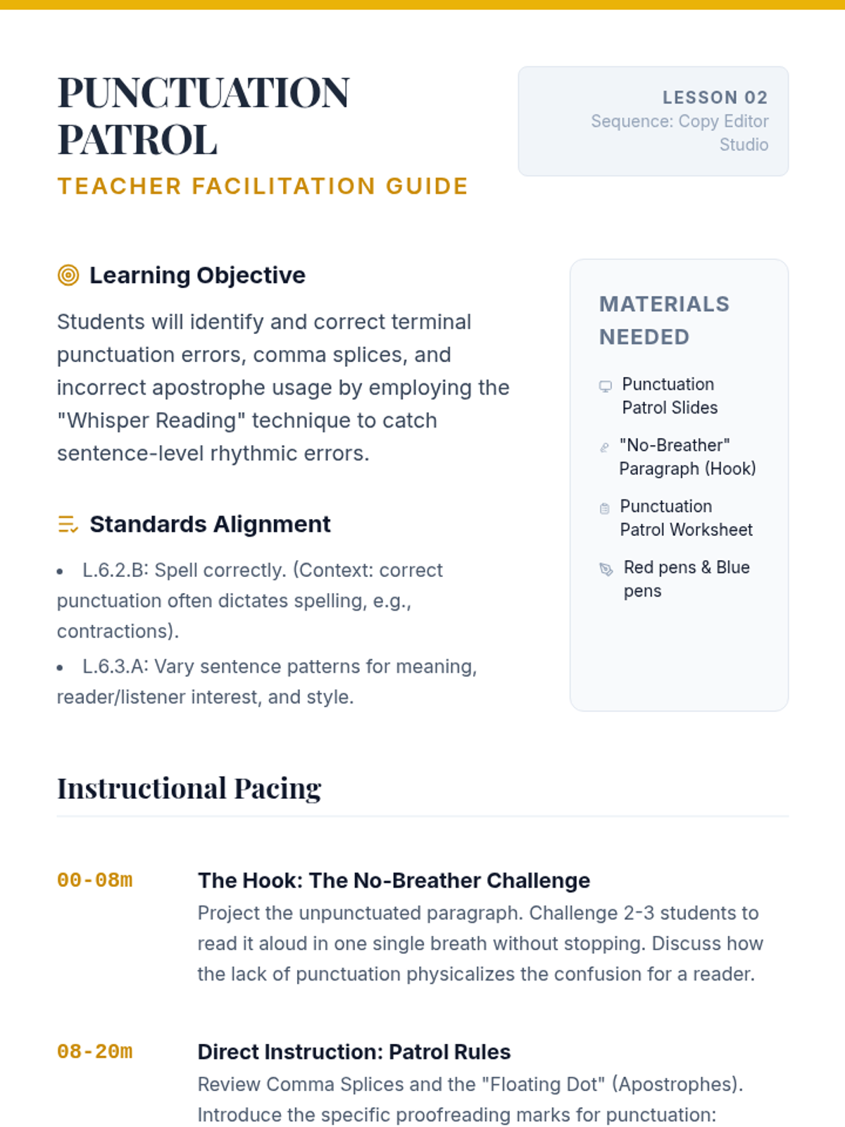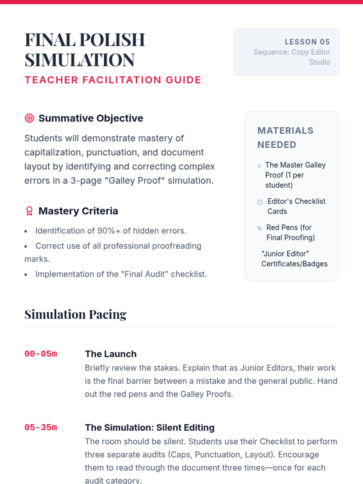 A professional simulation sequence where 6th-grade students act as copy editors, mastering capitalization, punctuation, and layout through real-world proofreading challenges and publishing house scenarios.