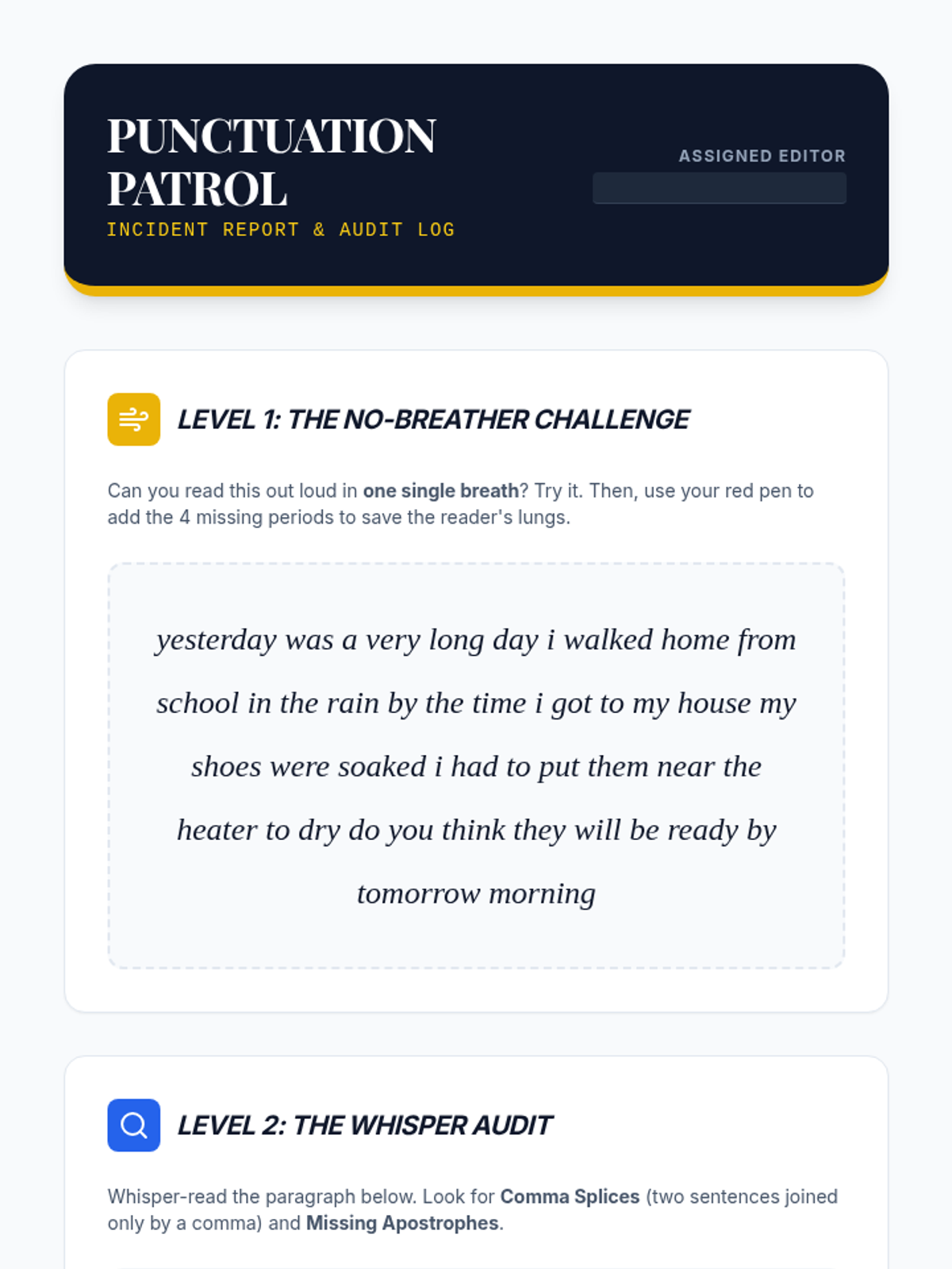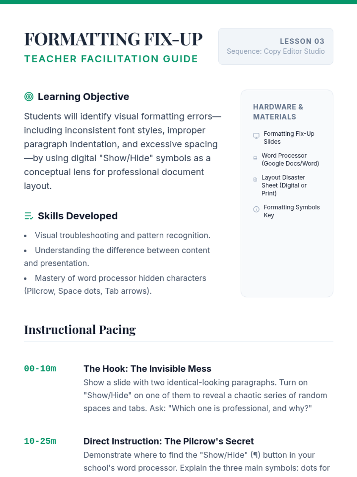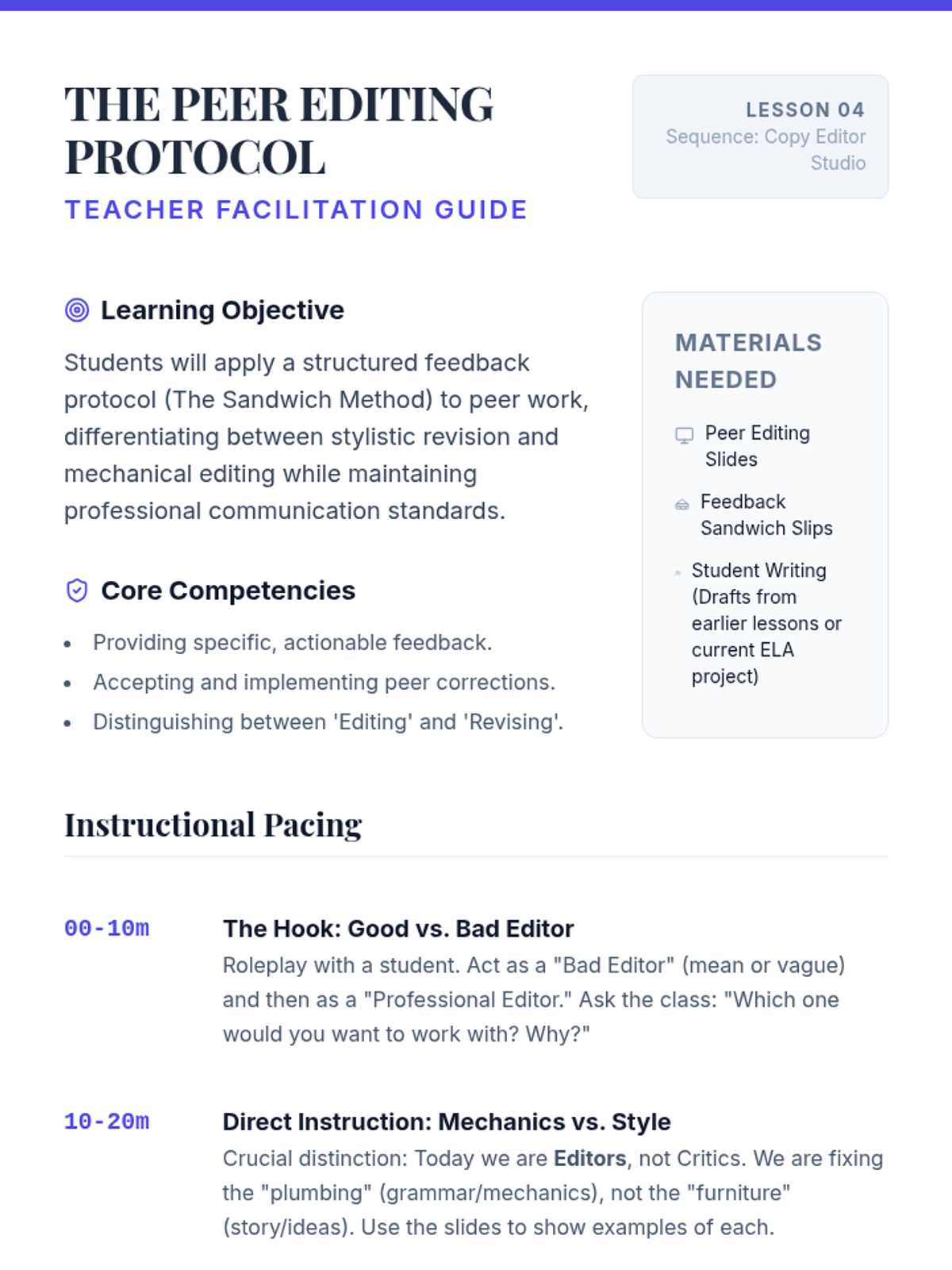 A professional simulation sequence where 6th-grade students act as copy editors, mastering capitalization, punctuation, and layout through real-world proofreading challenges and publishing house scenarios.