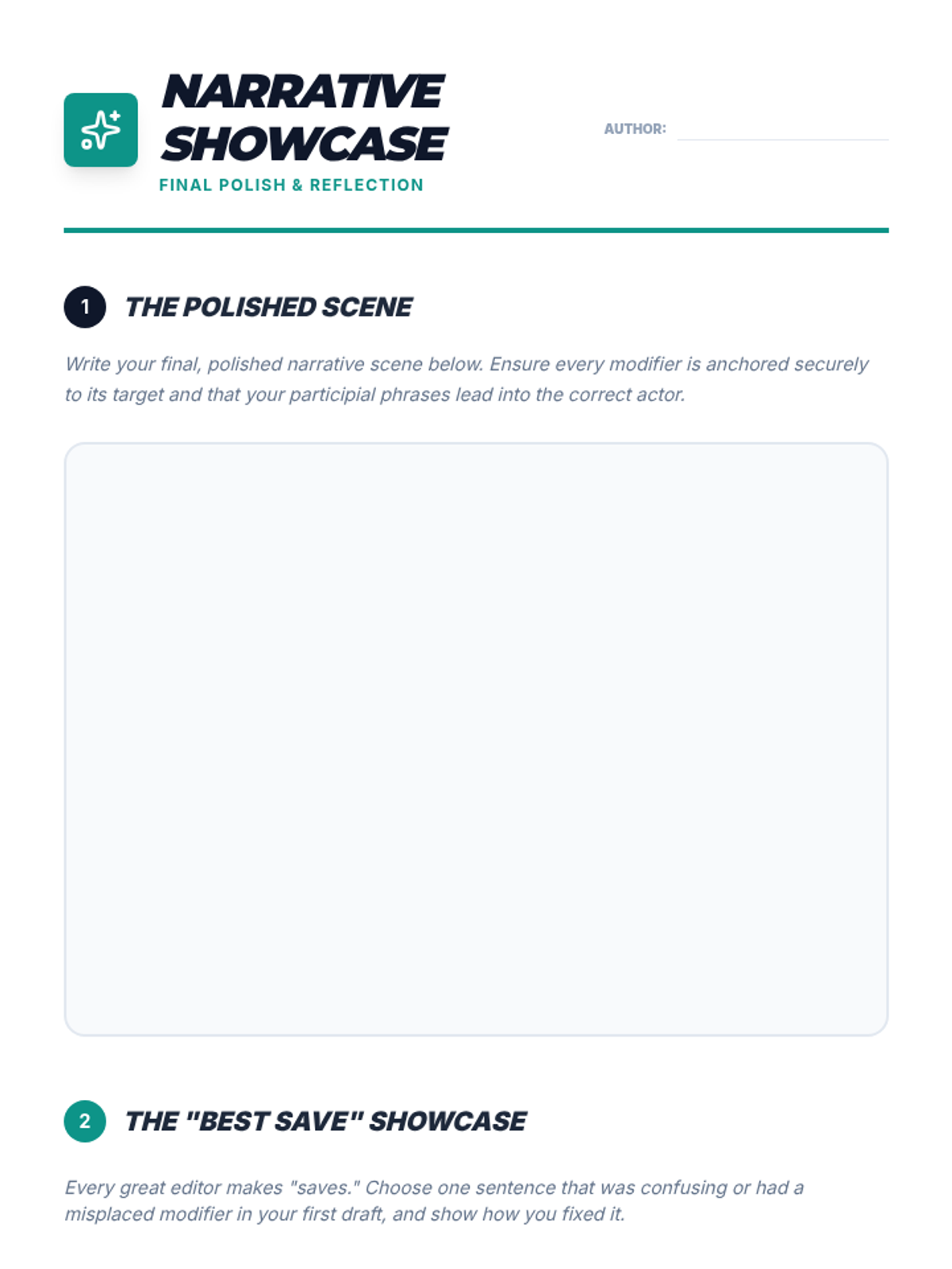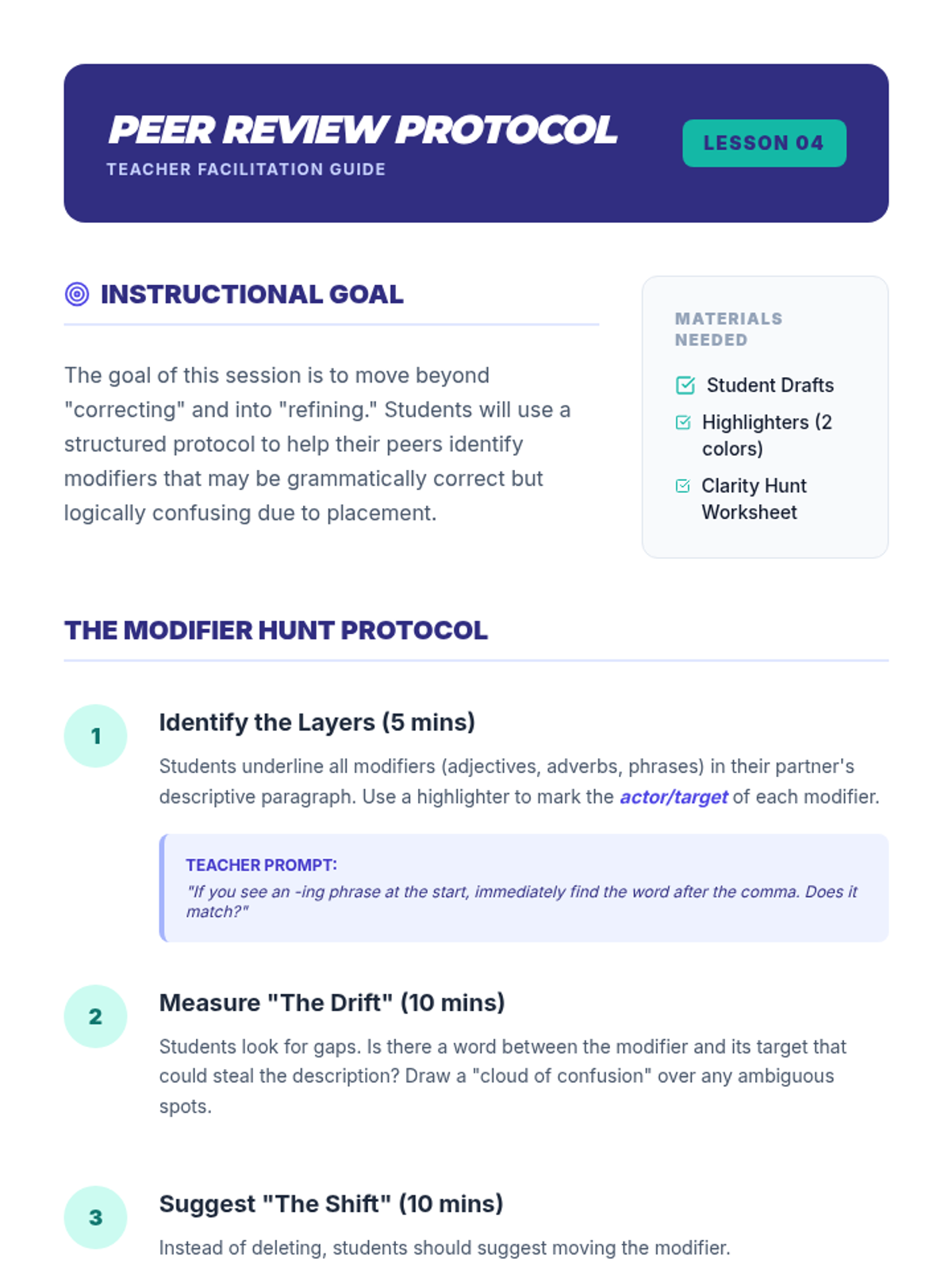 This workshop-style sequence for 8th Grade students focuses on misplaced and dangling modifiers within descriptive writing. Students move from analyzing mentor texts to drafting, expanding, and peer-editing their own narrative scenes to ensure clarity and precision.