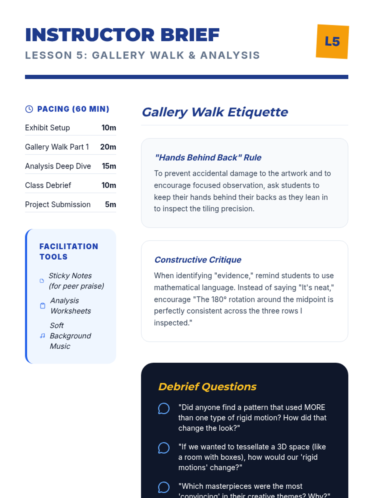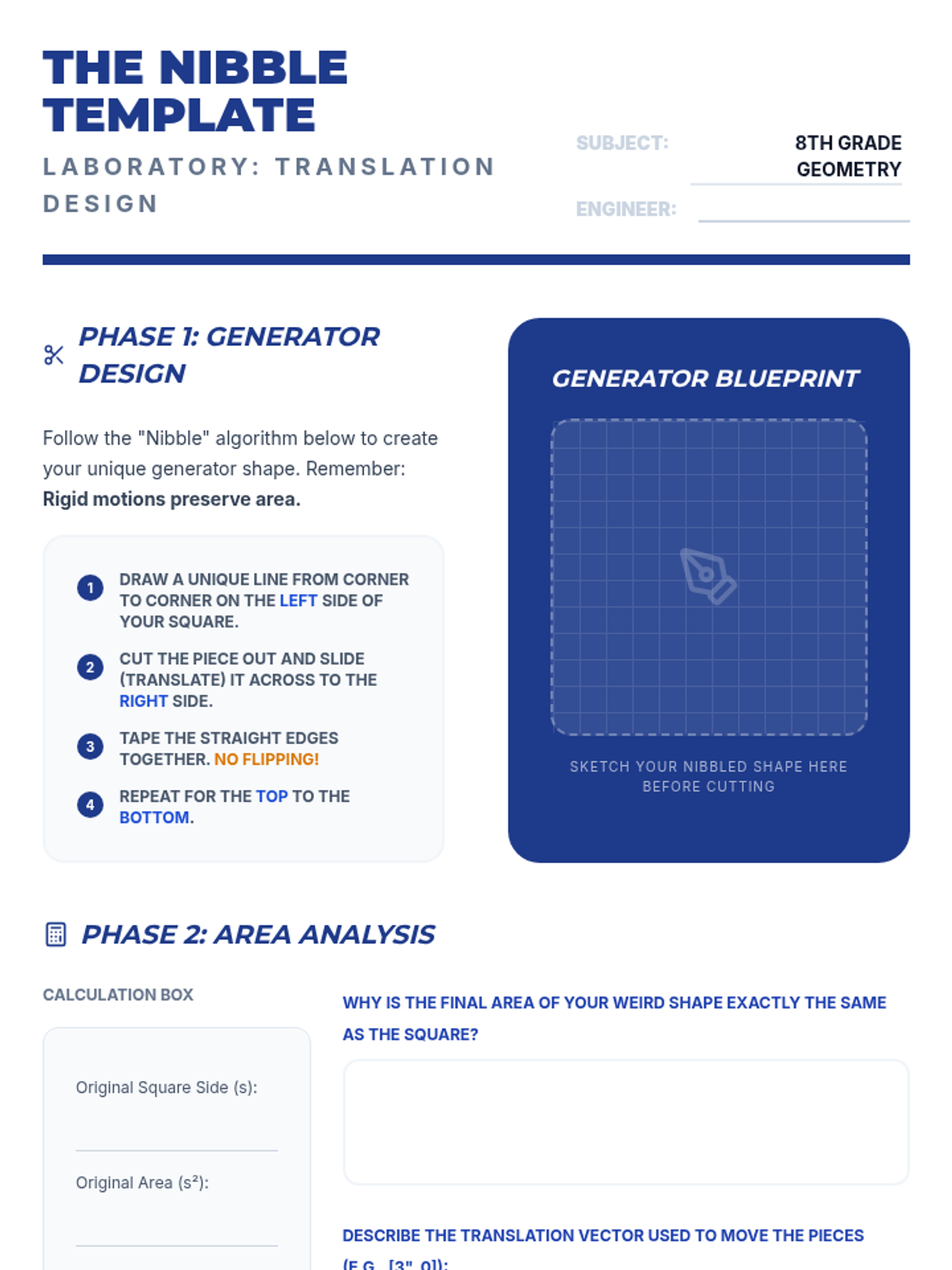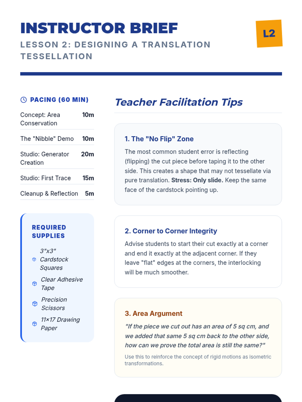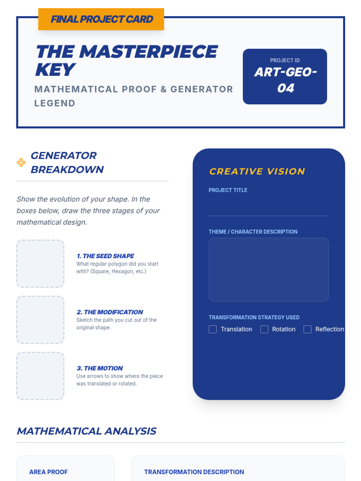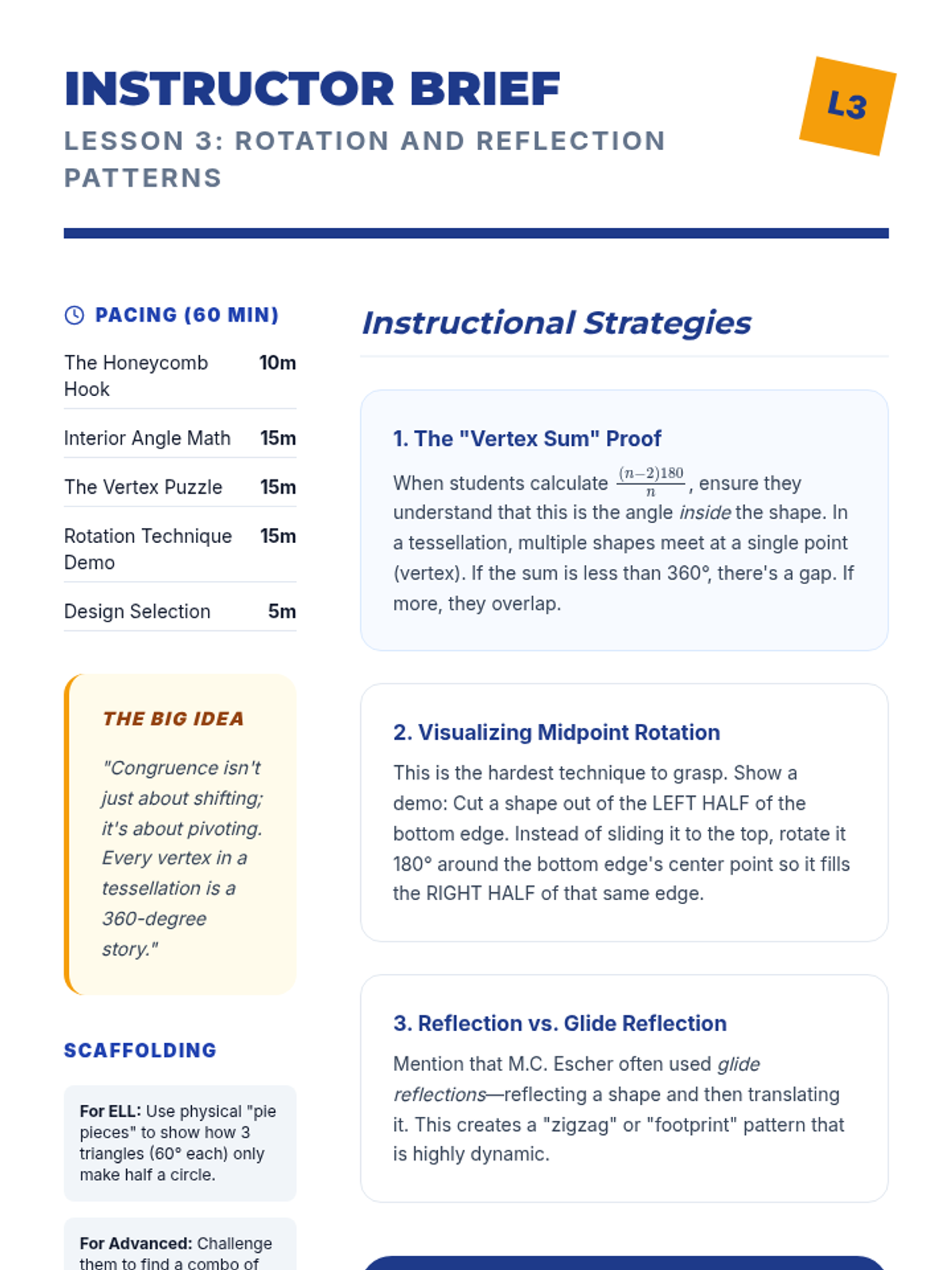 An 8th-grade geometry project where students use rigid motions to design complex, interlocking tessellations and geometric art, exploring congruence through practical application.