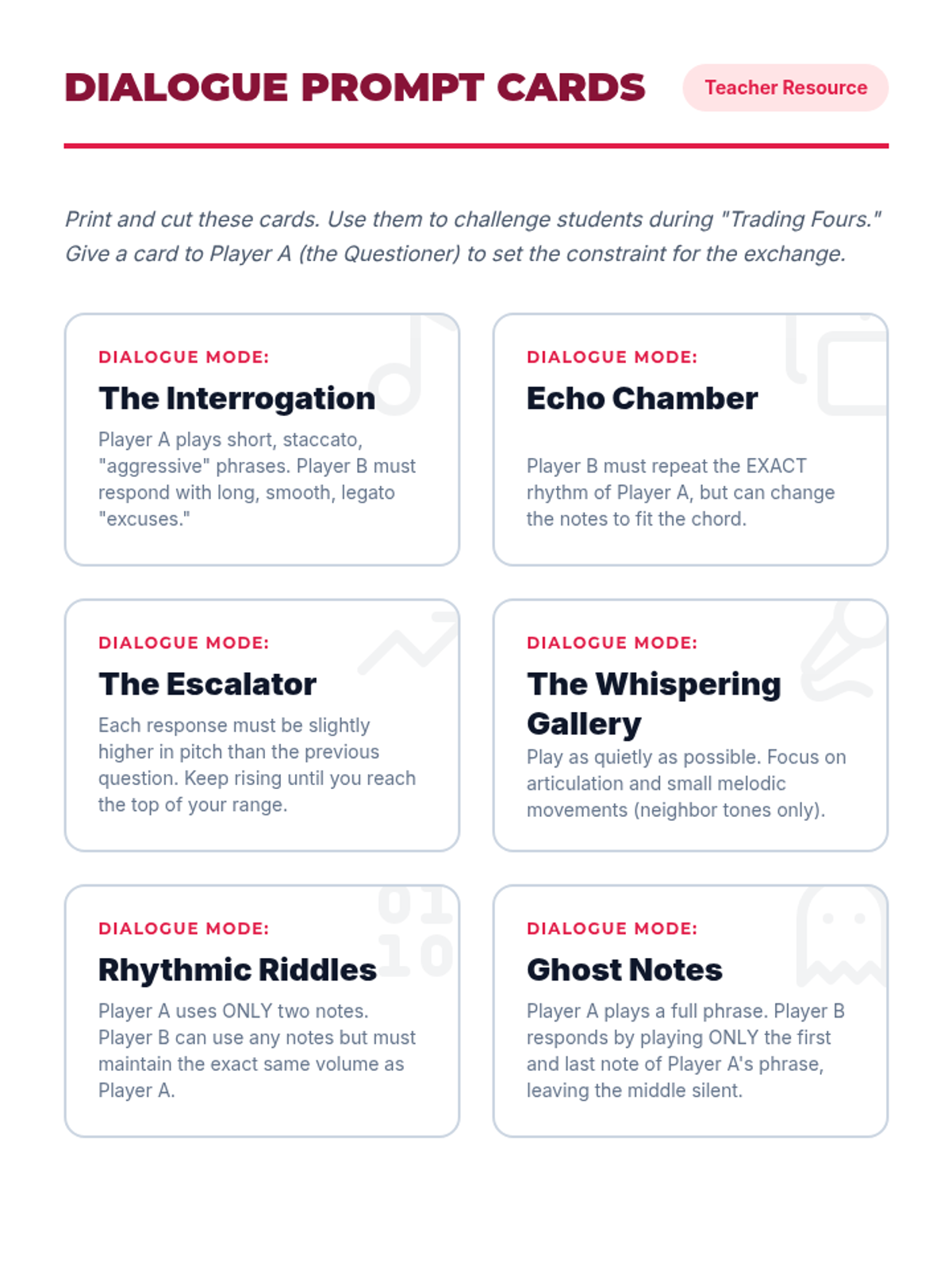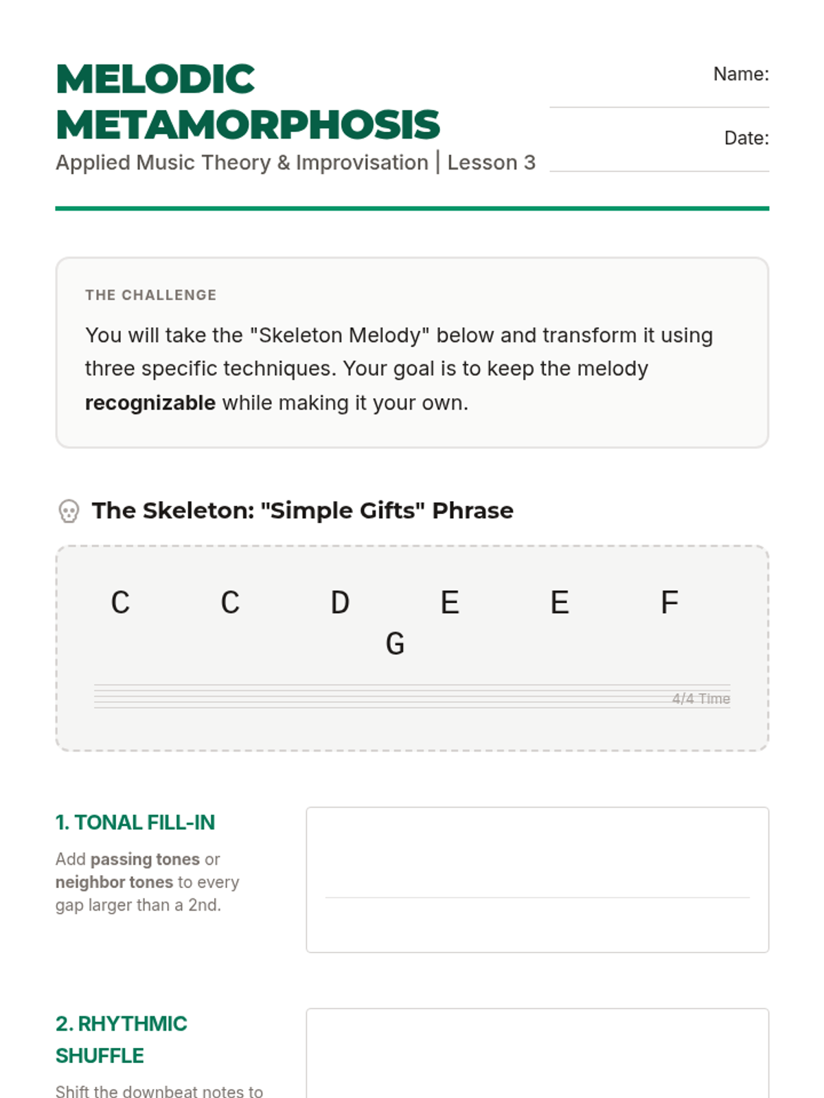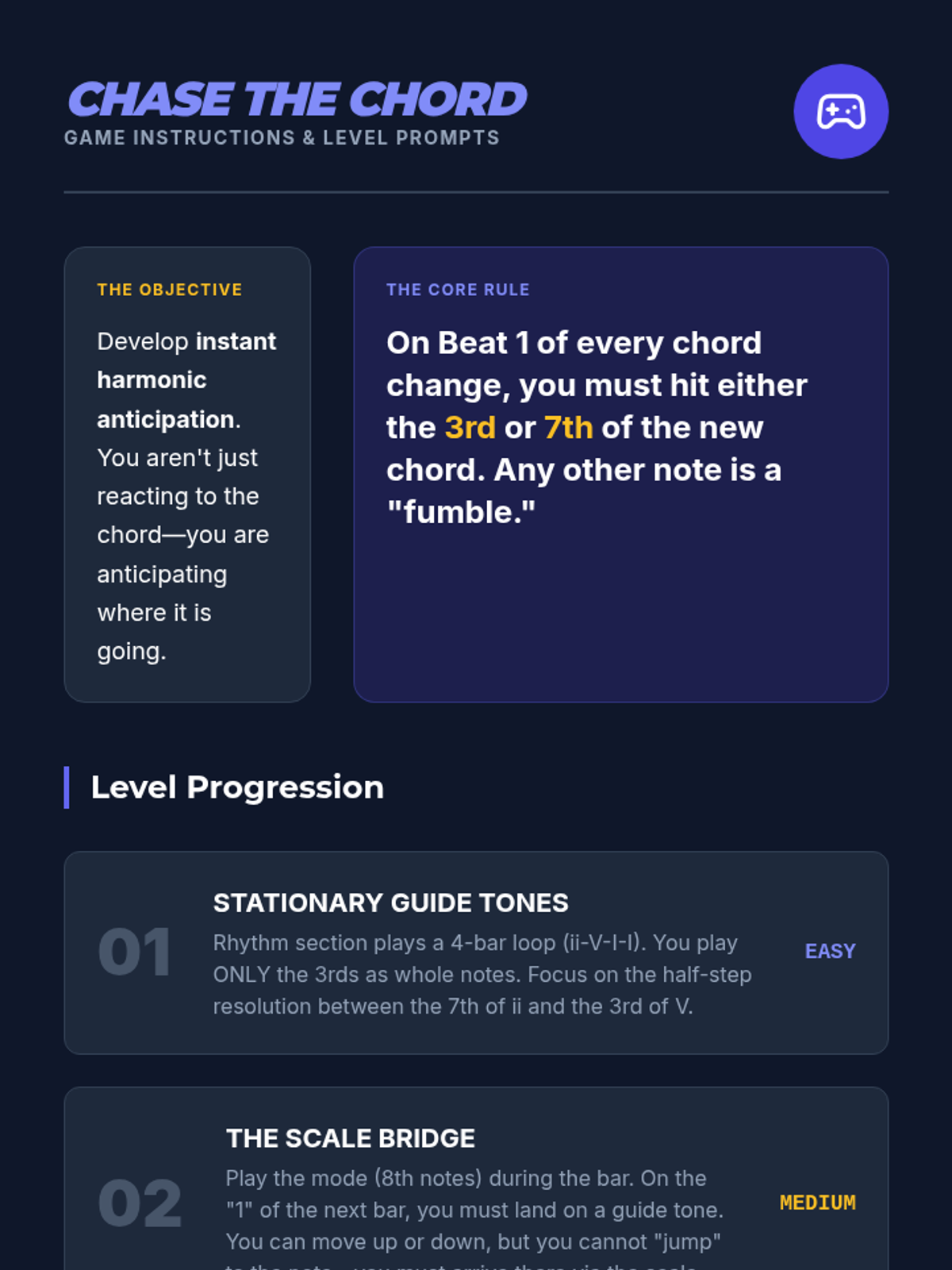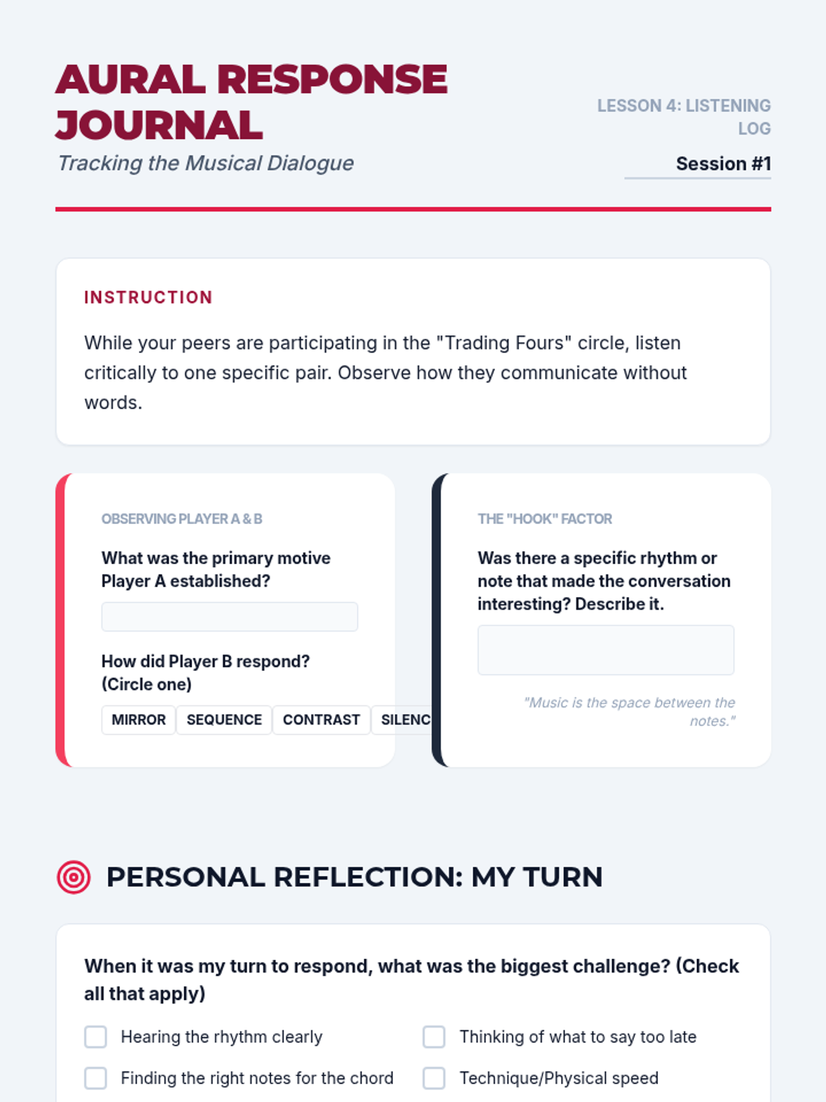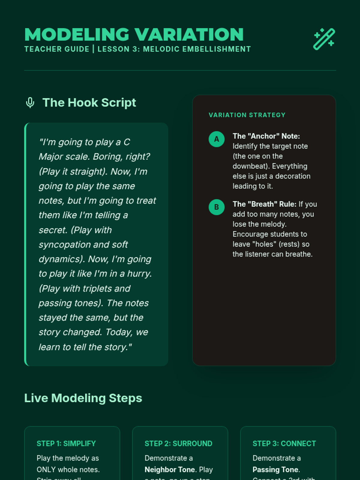 A high school sequence that bridges music theory and instrumental performance through improvisation. Students move from analyzing harmonic structures to spontaneously creating melodic content using modes, guide tones, and stylistic embellishments.