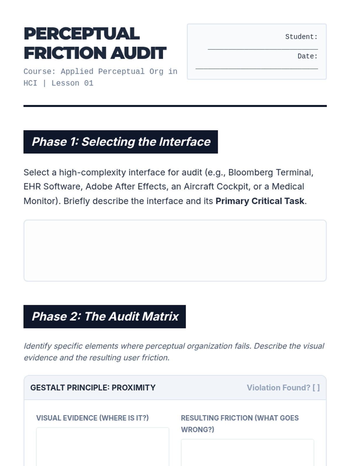 A graduate-level sequence exploring the intersection of Gestalt psychology and Human-Computer Interaction, focusing on how perceptual organization principles like proximity, similarity, and closure influence usability and cognitive load in digital design.