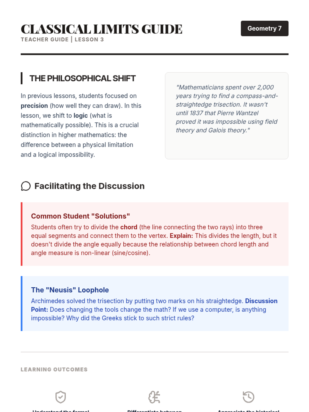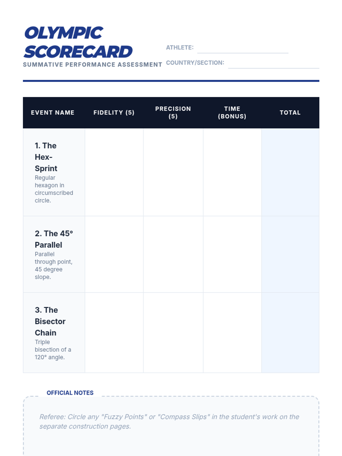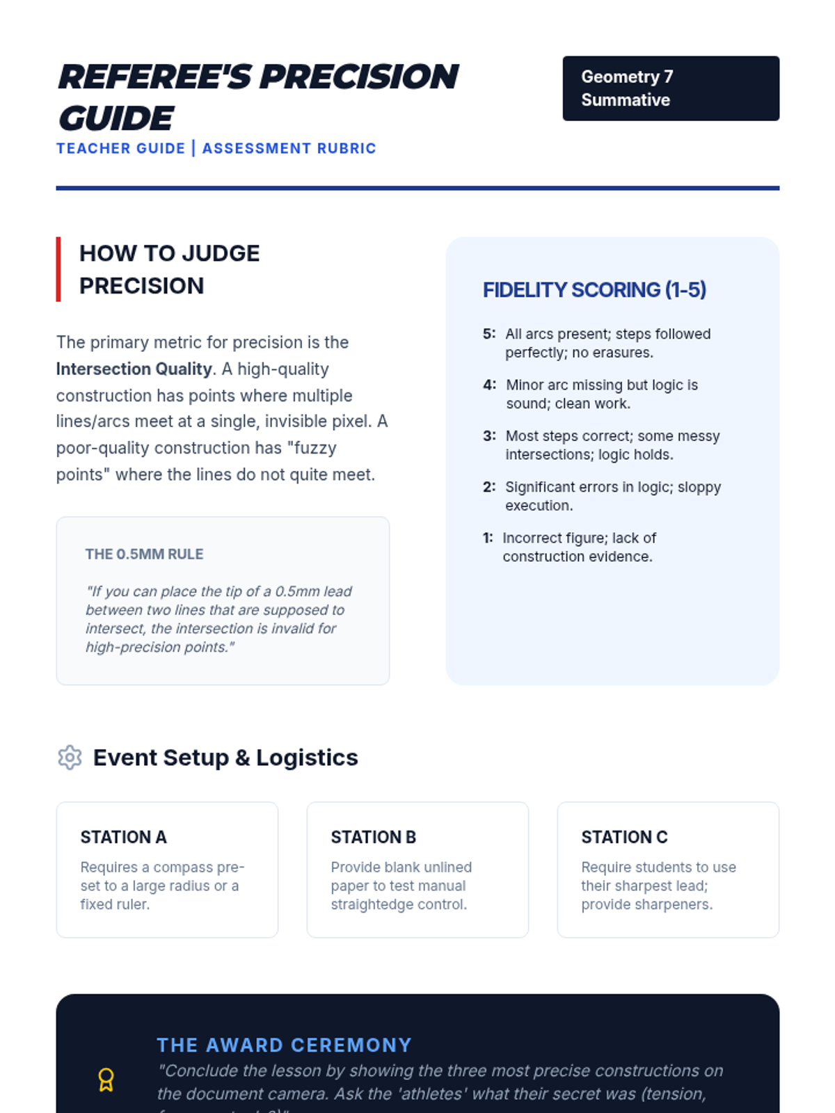 A 7th-grade geometry sequence focusing on the precision, logic, and limitations of geometric constructions through gamified challenges and error analysis. Students explore the 'why' behind compass and straightedge techniques while honing their technical skills.