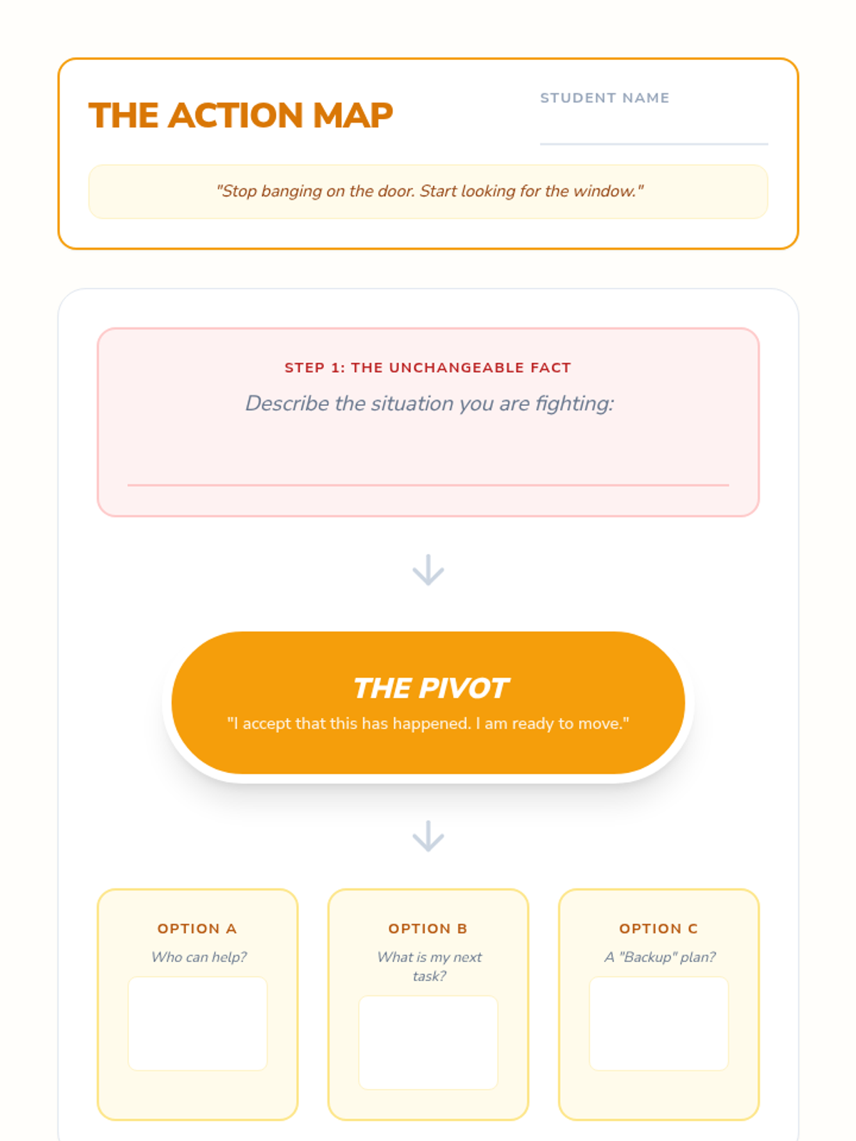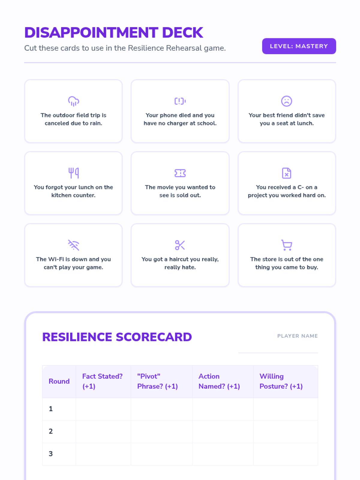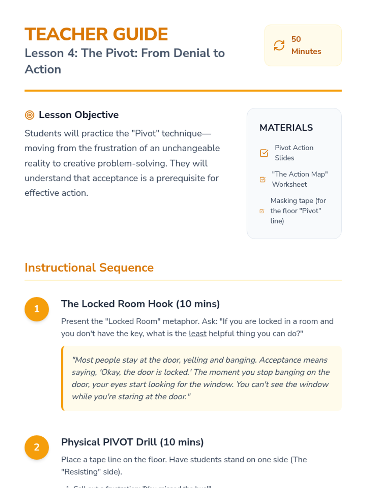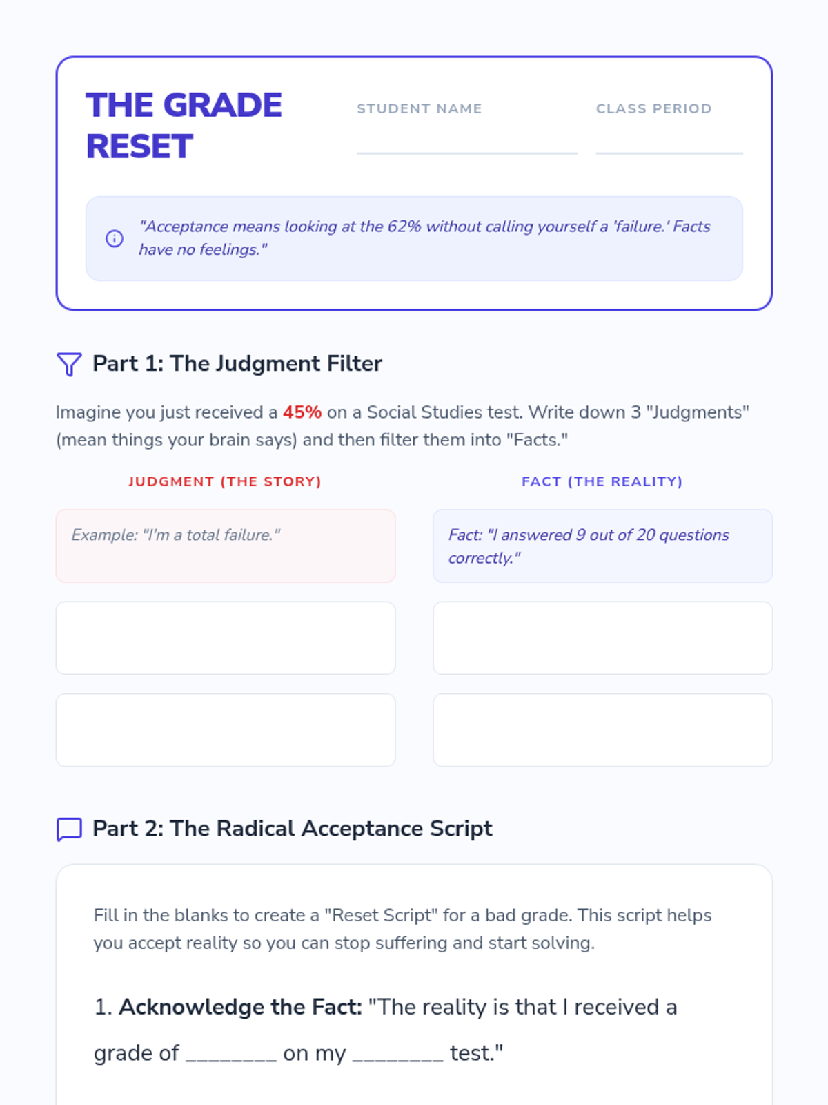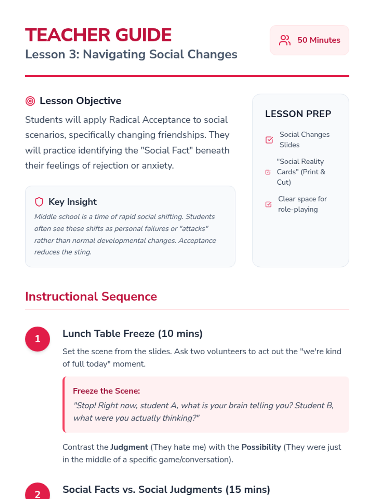 This middle school sequence focuses on building distress tolerance through Radical Acceptance. Students move from understanding the 'Cycle of Suffering' to practicing resilience in academic and social scenarios, ultimately learning to pivot from disappointment to proactive problem-solving.