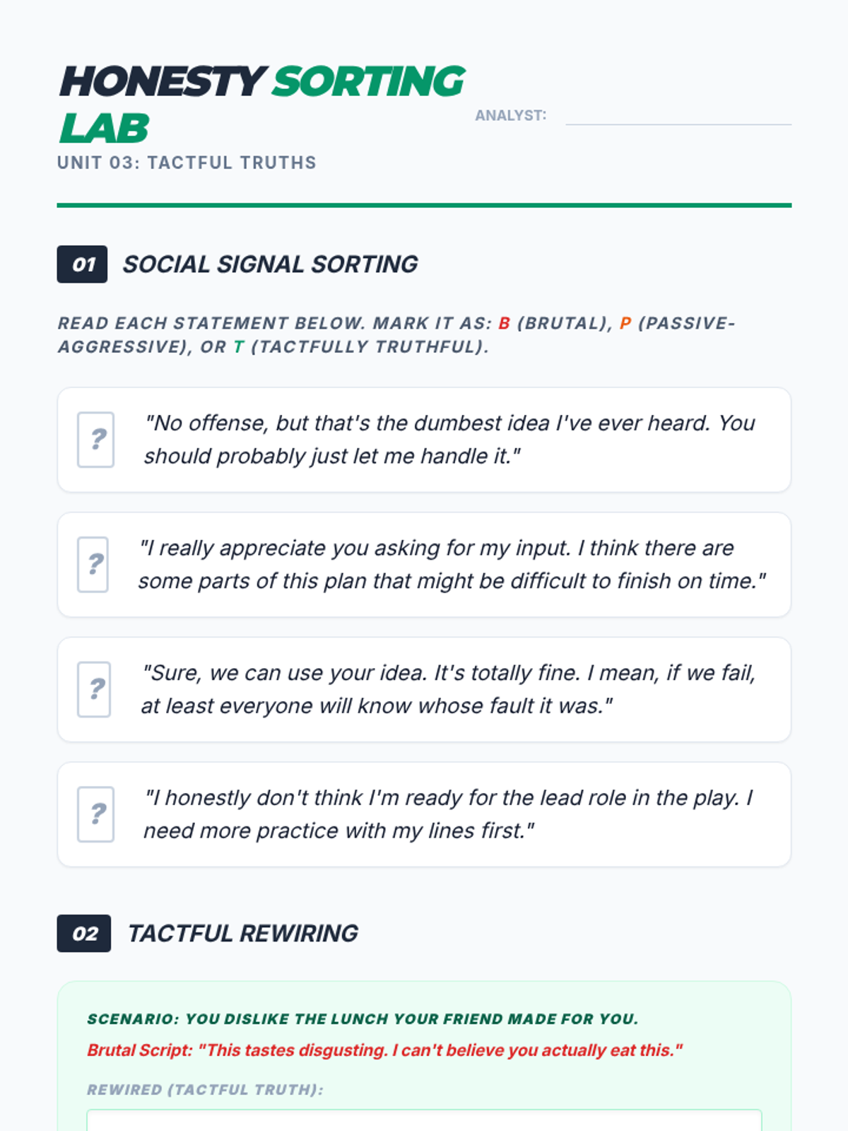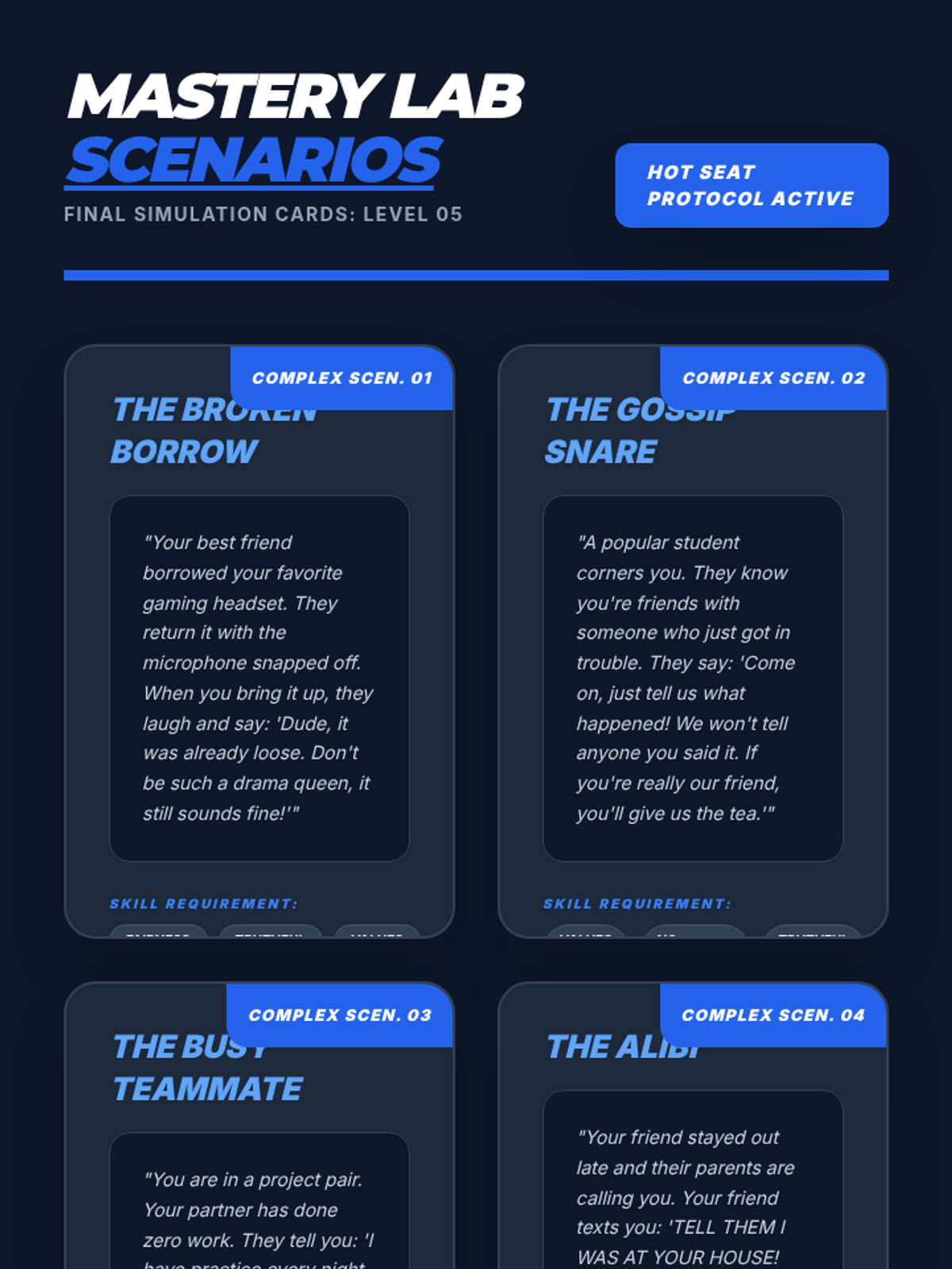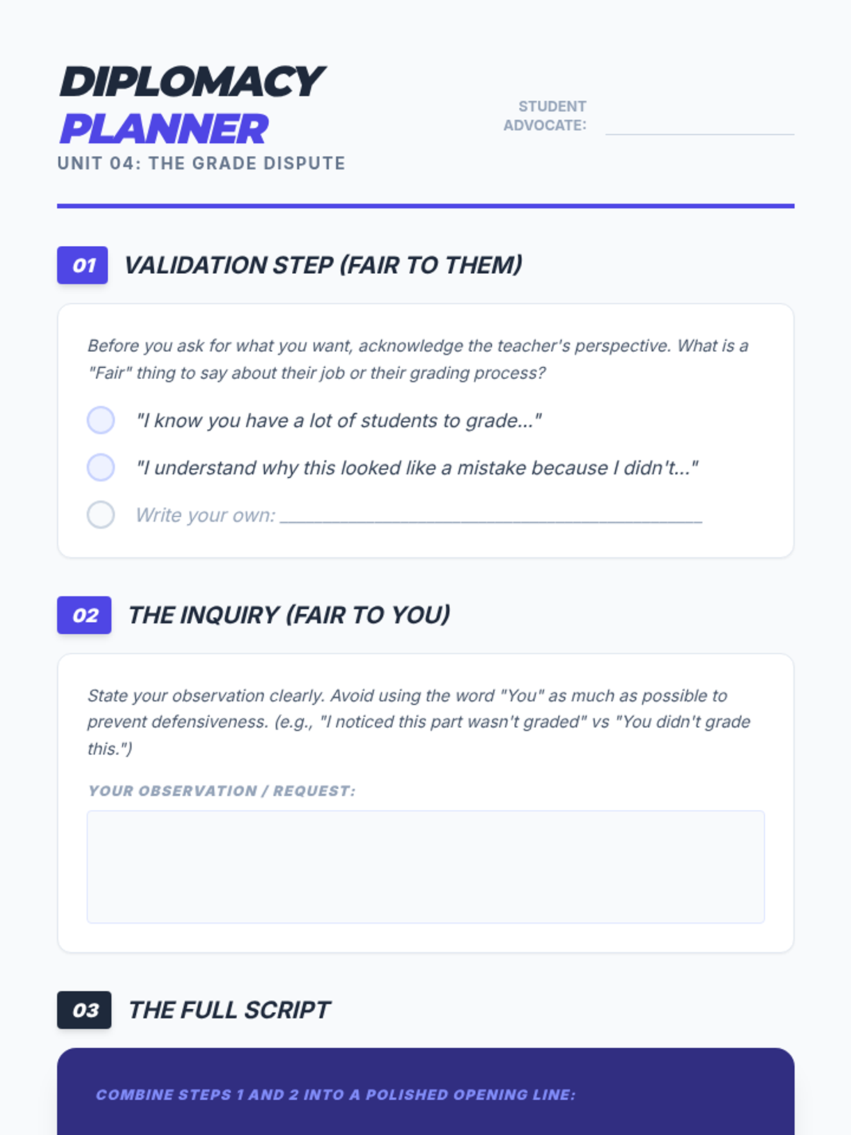 An advanced five-part professional development series for 11th graders focusing on the psychology of conflict, high-stakes communication, and strategic diplomacy. Students prepare for adult environments by mastering emotional intelligence, interest-based negotiation, and professional digital protocols.