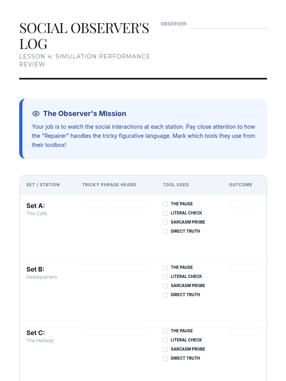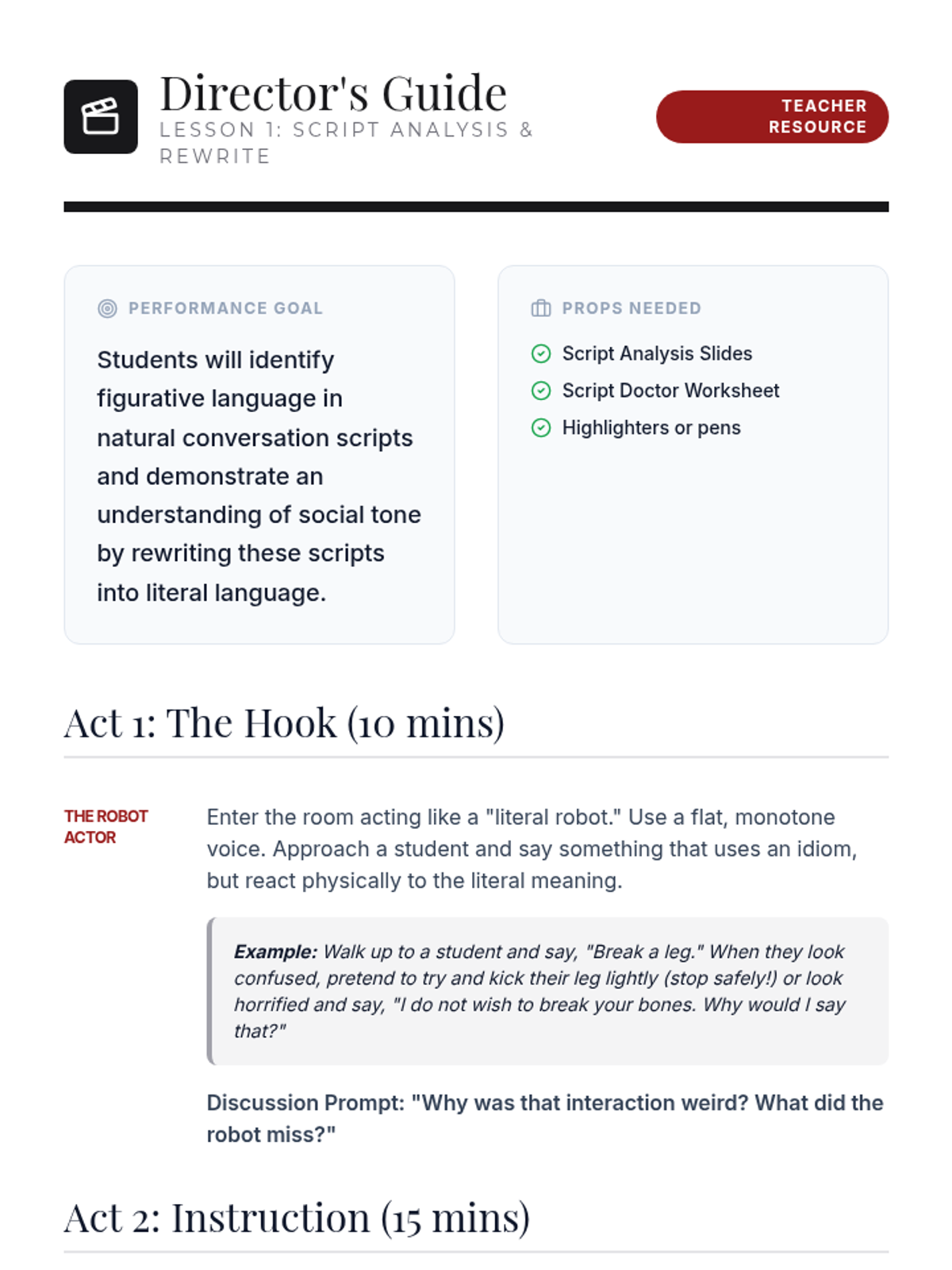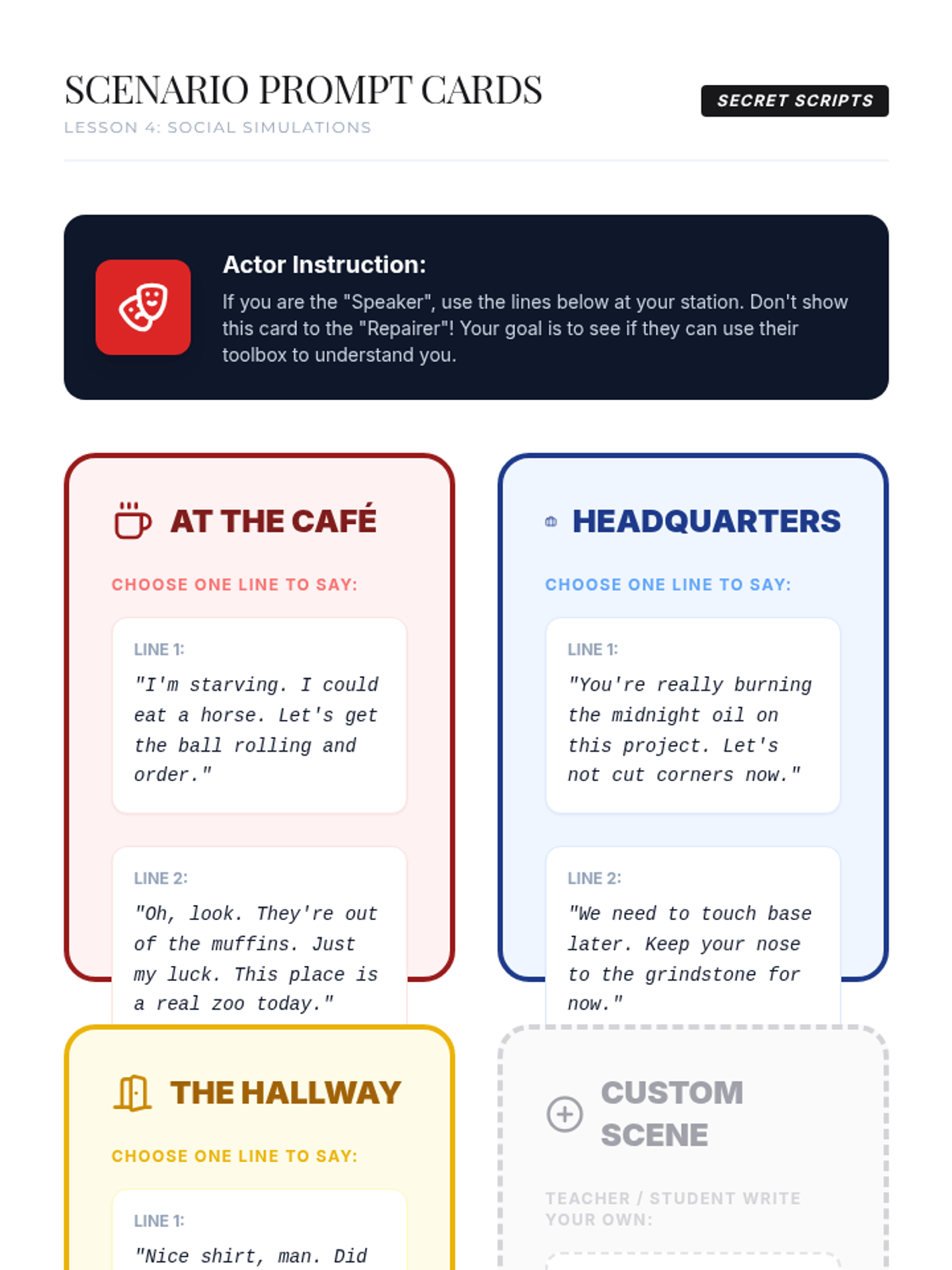 A 5-lesson sequence for 9th-grade Special Education students focusing on the practical application of figurative language through role-play, repair strategies, and social simulations. Students move from script analysis to real-time communication repair, building confidence in navigating complex social interactions.