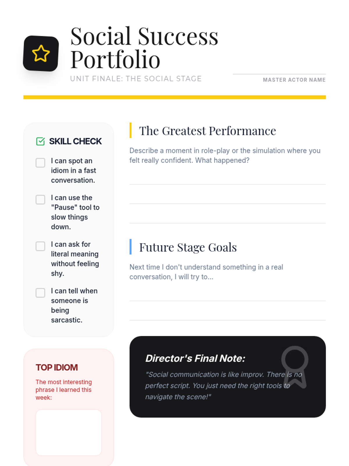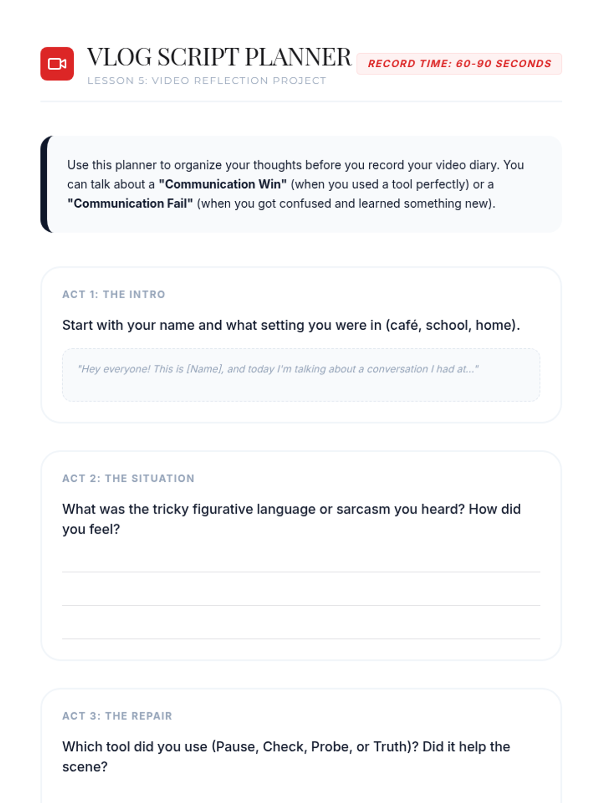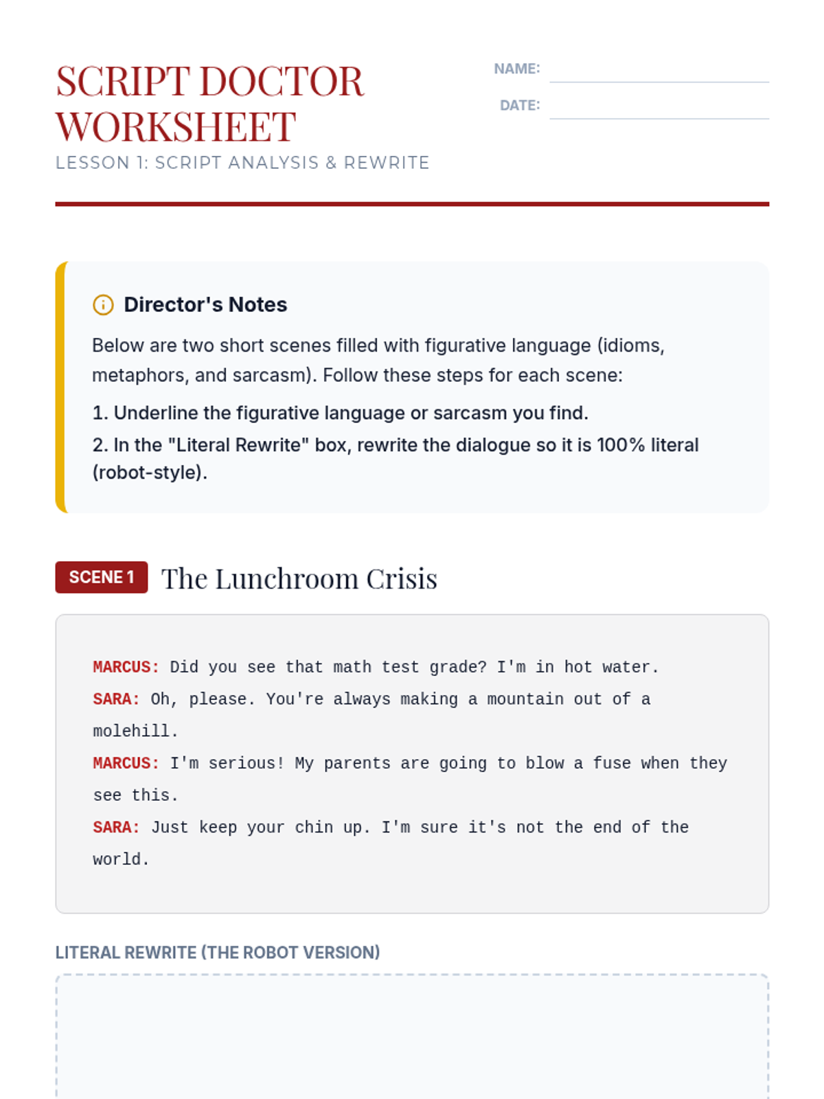 A 5-lesson sequence for 9th-grade Special Education students focusing on the practical application of figurative language through role-play, repair strategies, and social simulations. Students move from script analysis to real-time communication repair, building confidence in navigating complex social interactions.