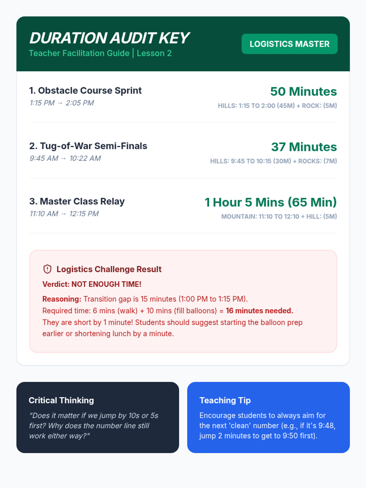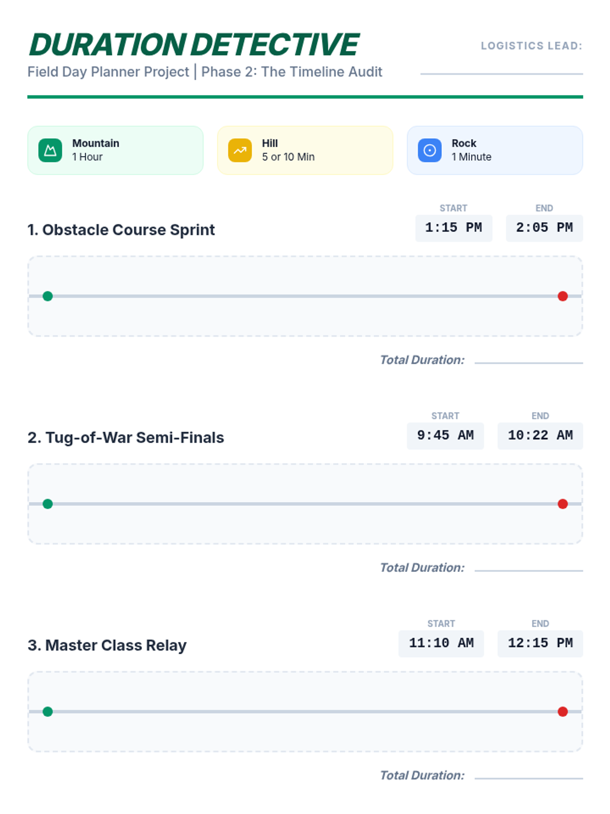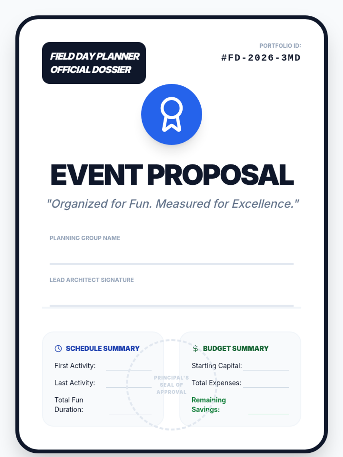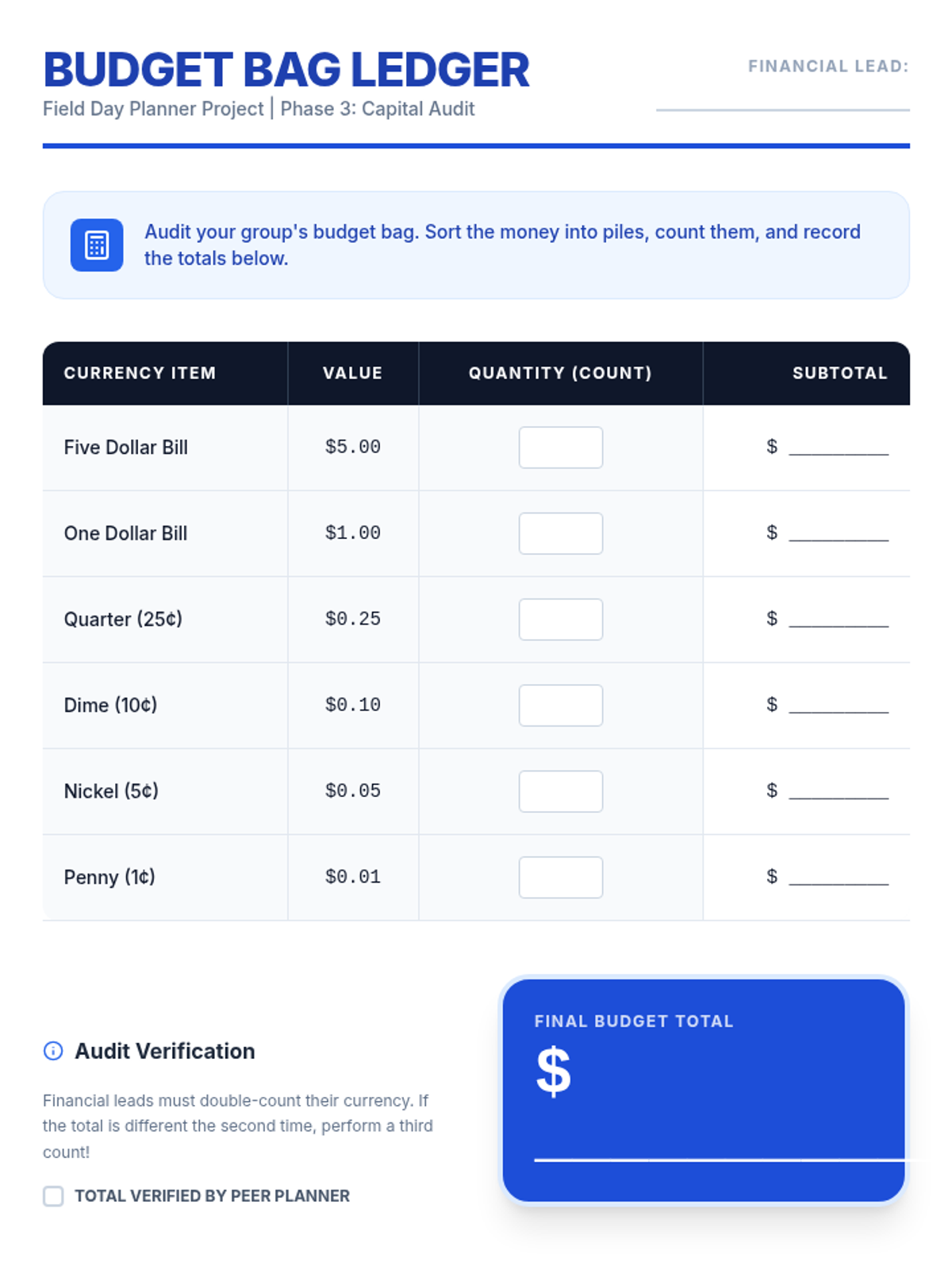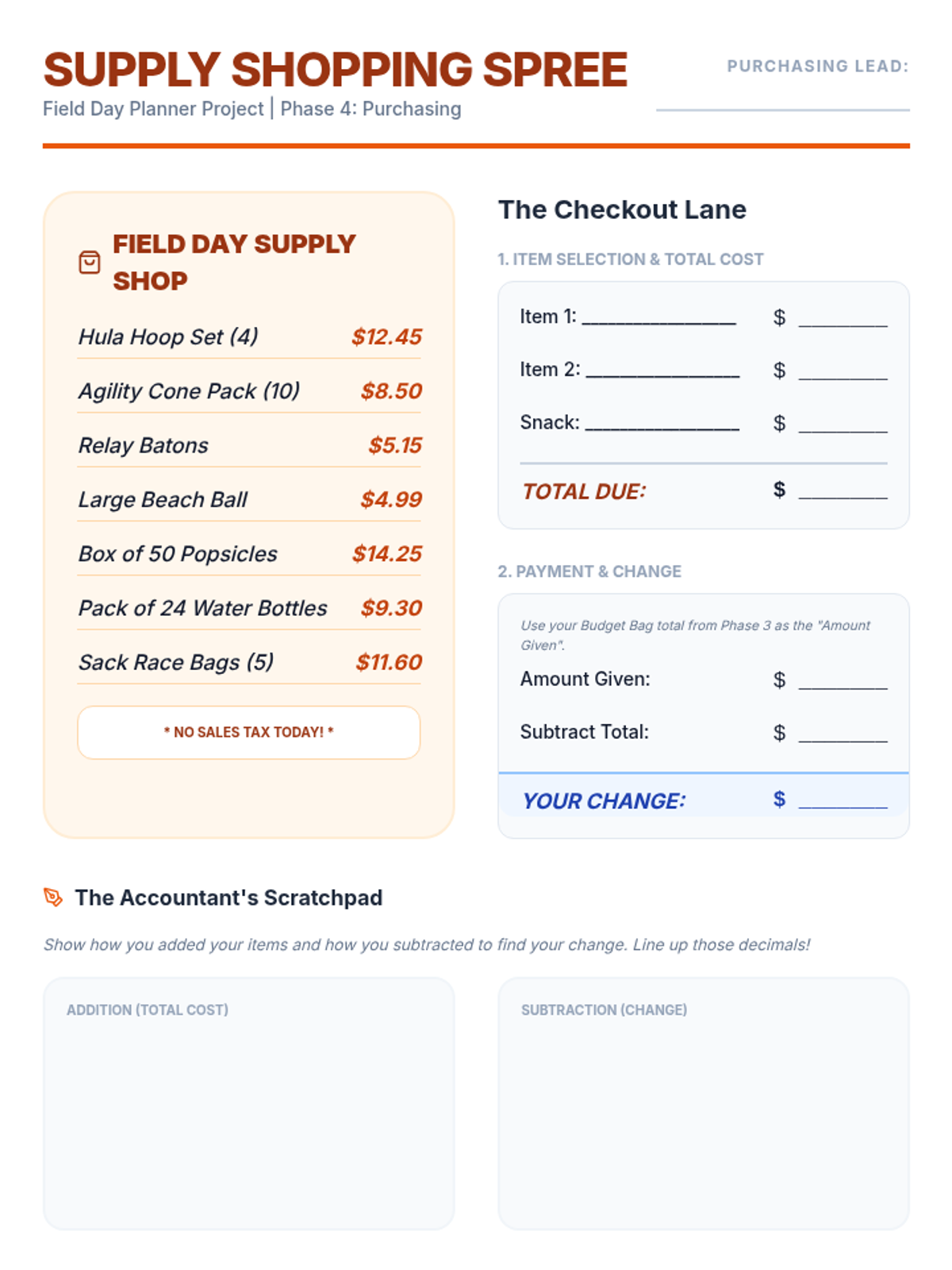 A simulation-based math unit where 3rd graders act as event planners for a Class Field Day. Students master telling time, calculating elapsed time, counting currency, and managing a budget through practical application.