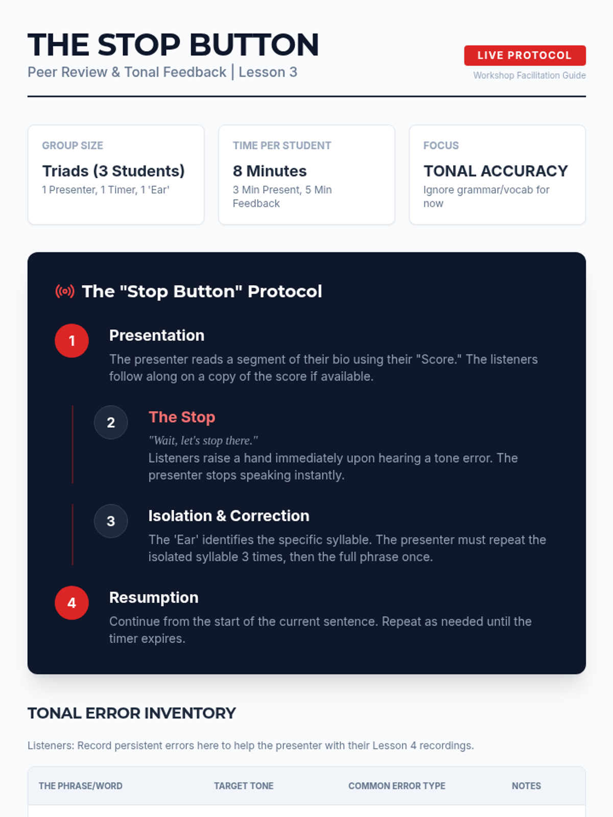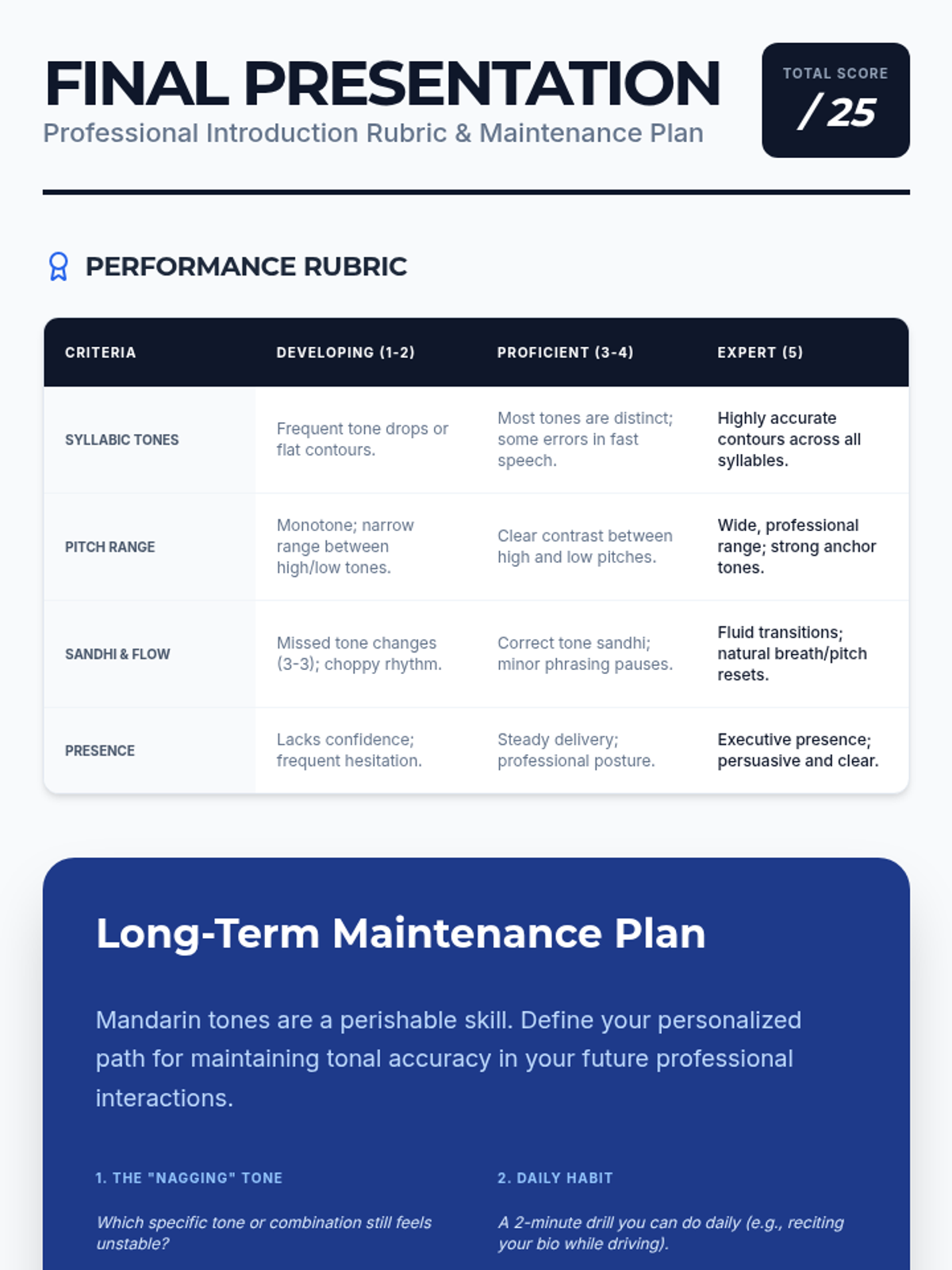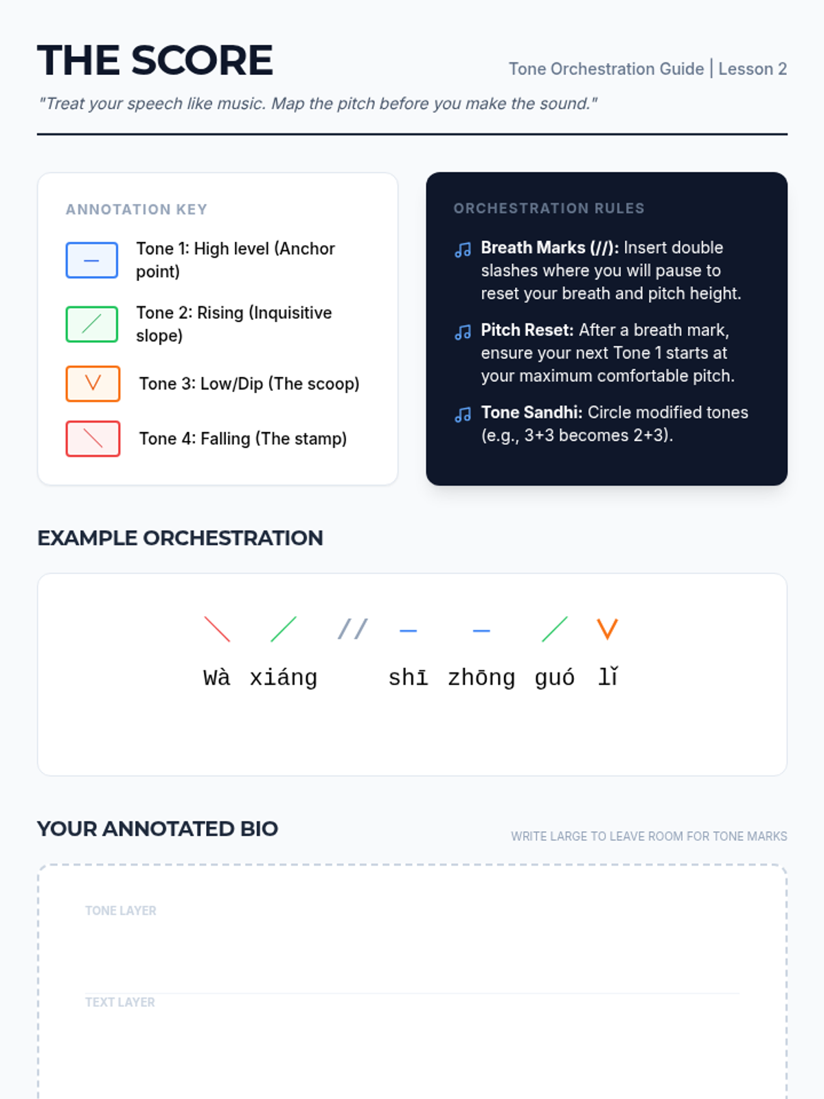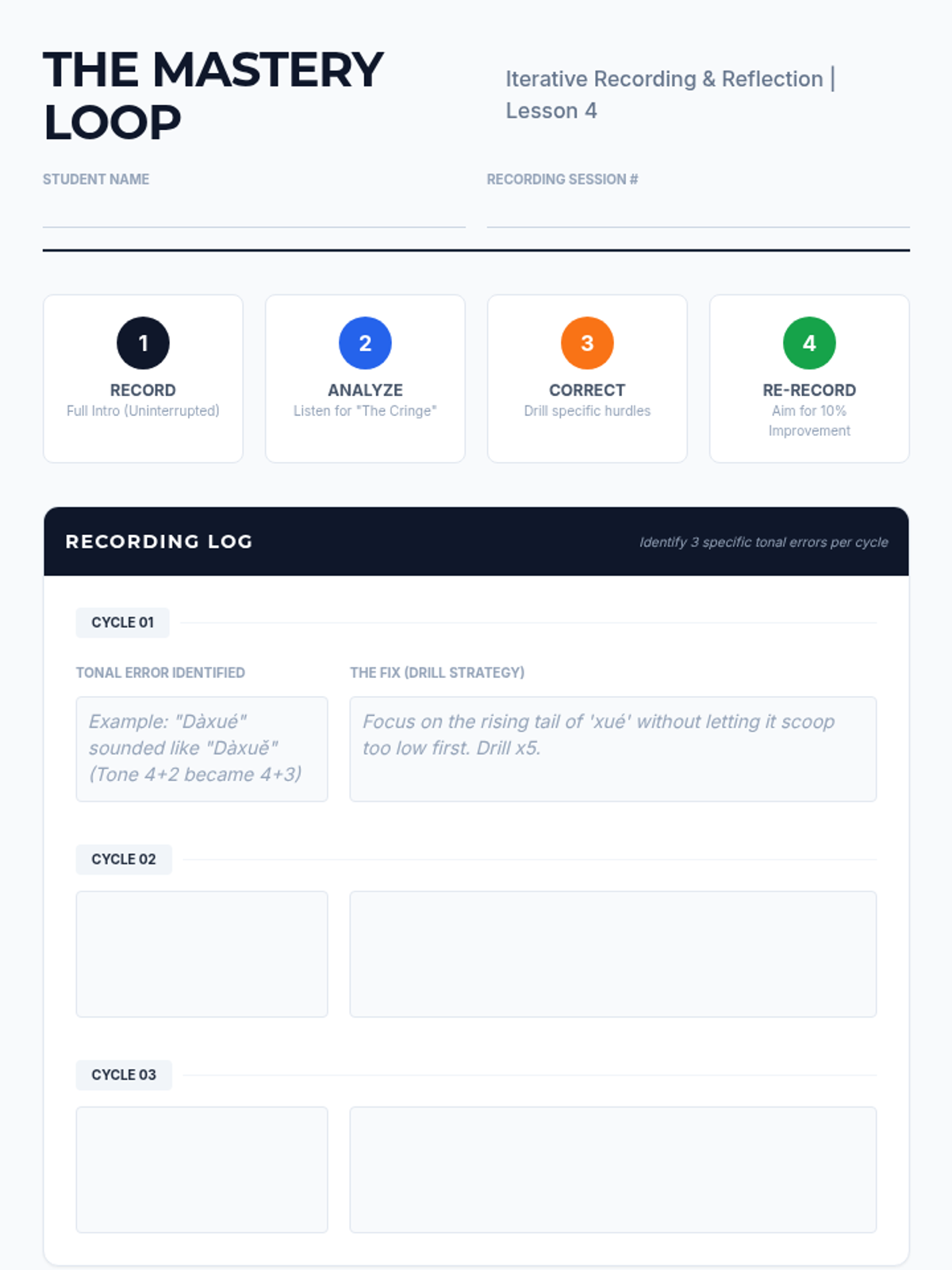 A flipped-classroom sequence for graduate students focusing on mastering Mandarin tones through the creation of a professional bio. Students move from analyzing tone structures to 'orchestrating' their speech and iterative recording for mastery.