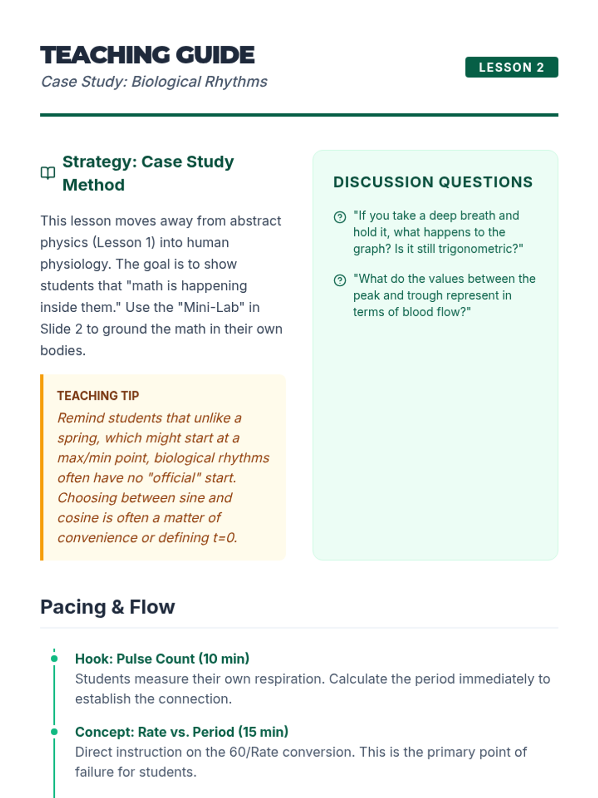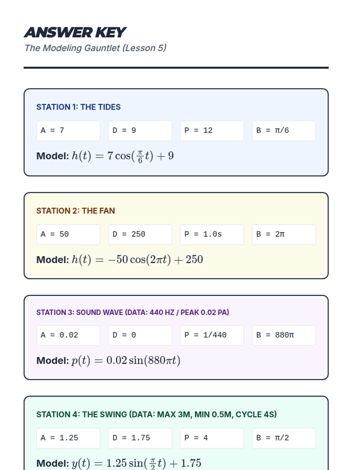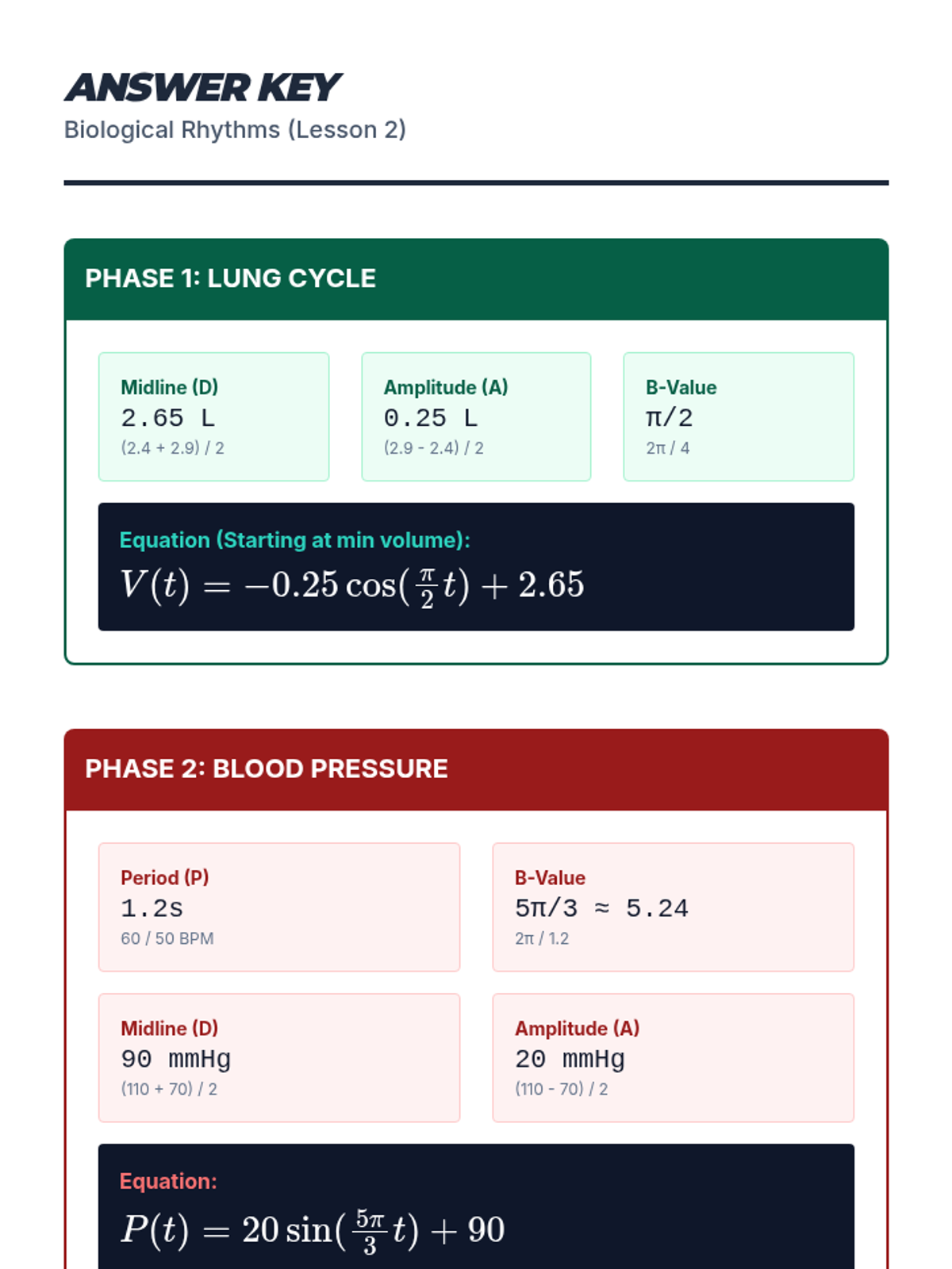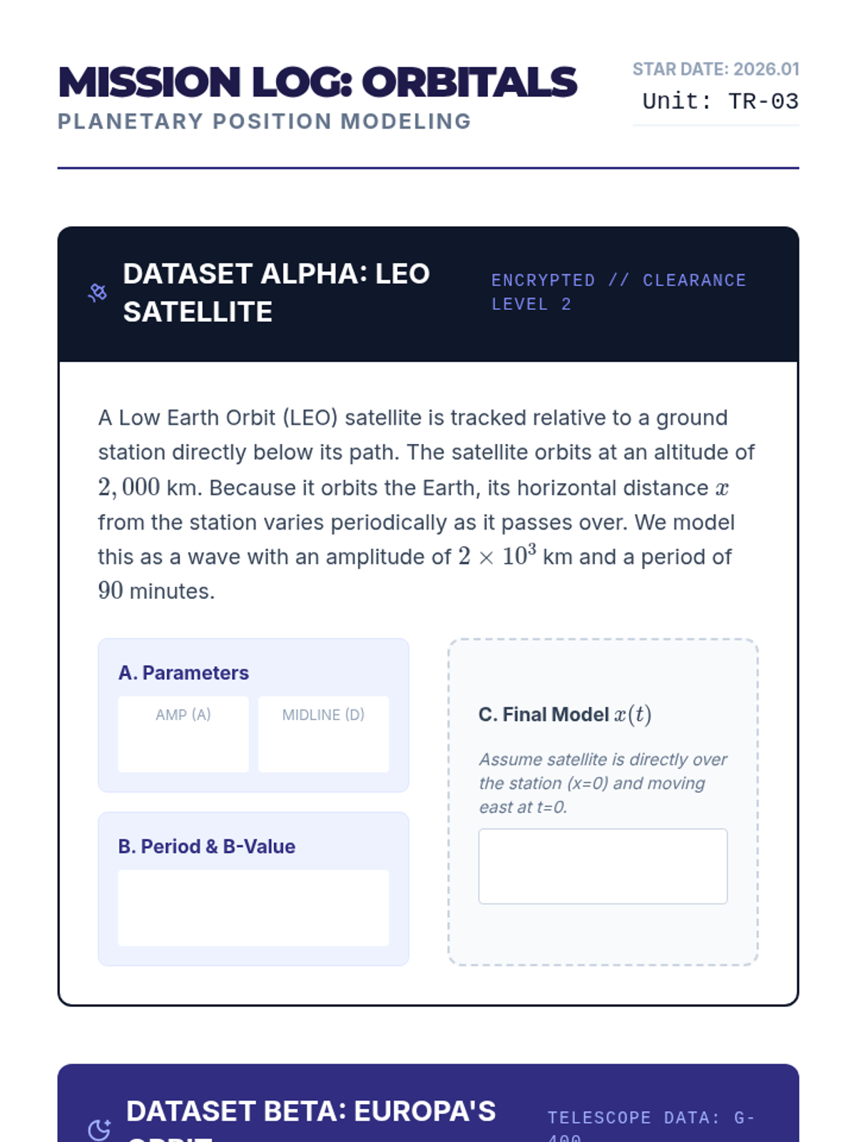 A comprehensive unit on modeling real-world periodic phenomena using trigonometric functions across physics, biology, and astronomy. Students master identifying amplitude, midline, and period from contextual data to build and solve predictive equations.
