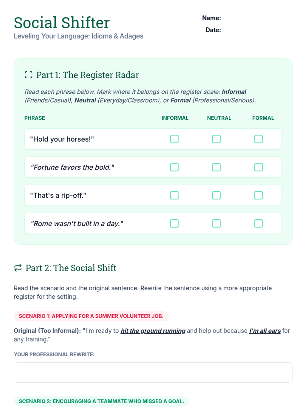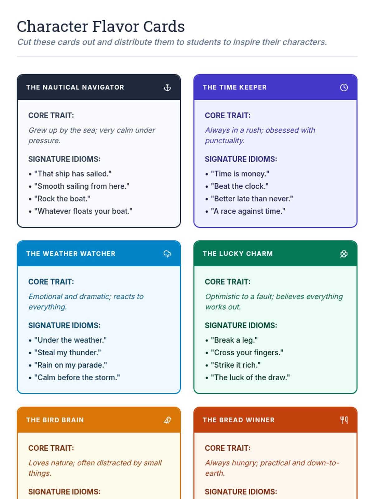 This sequence guides 6th-grade students through the production side of idioms and adages, focusing on when figurative language enhances or hinders communication in various contexts. Students will explore misinterpretation through simulation, adapt their speech for different settings, develop character voices in dialogue, and use proverbs as persuasive tools.
