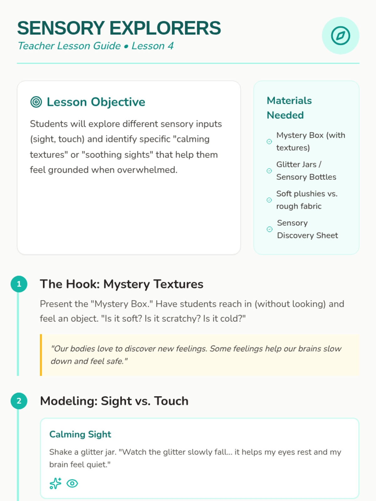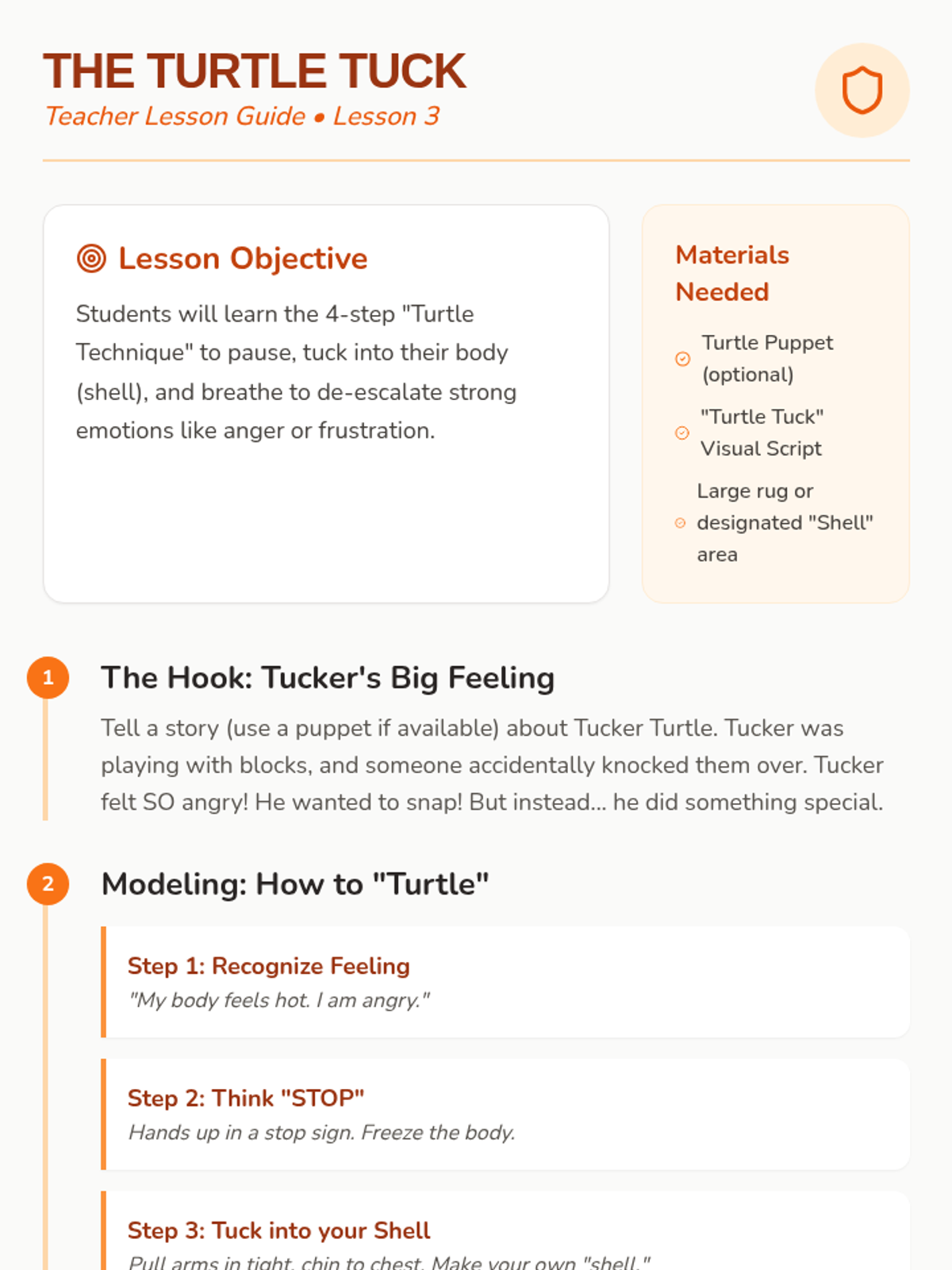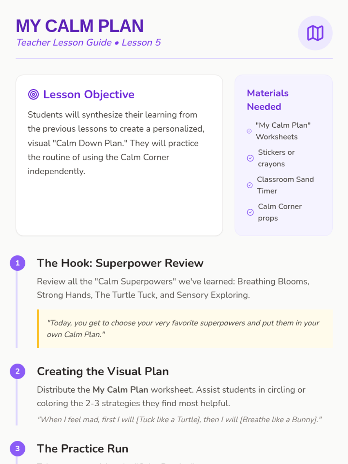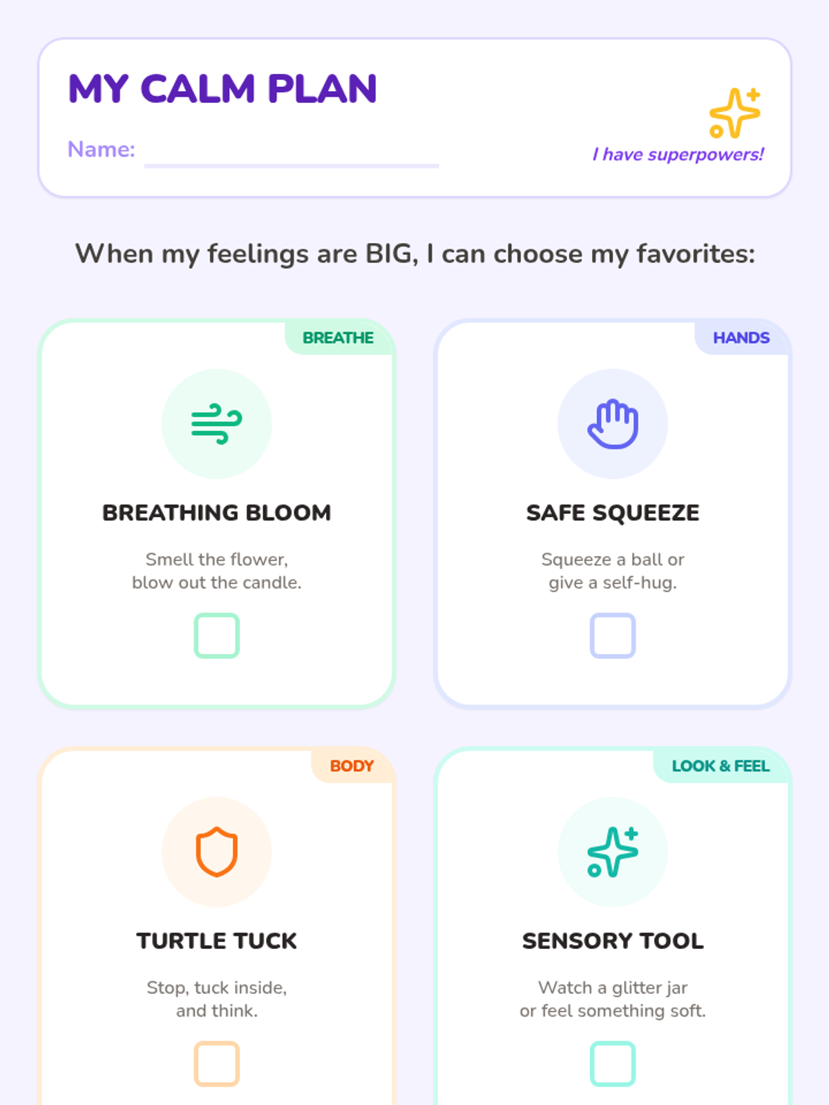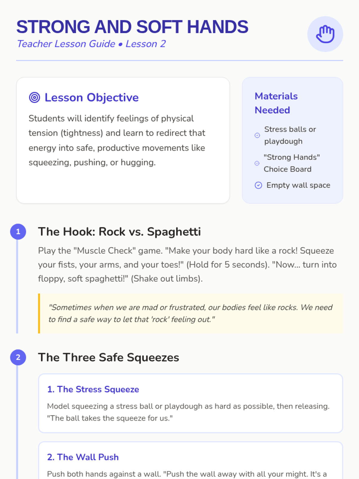 A Pre-K sequence focused on teaching physical coping strategies like deep breathing, muscle relaxation, and sensory grounding to replace impulsive reactions. Students develop a toolkit of self-regulation skills through workshop-style practice and creative projects.