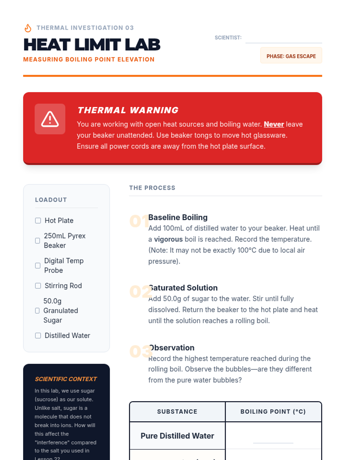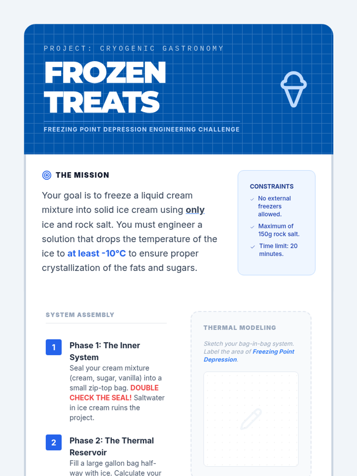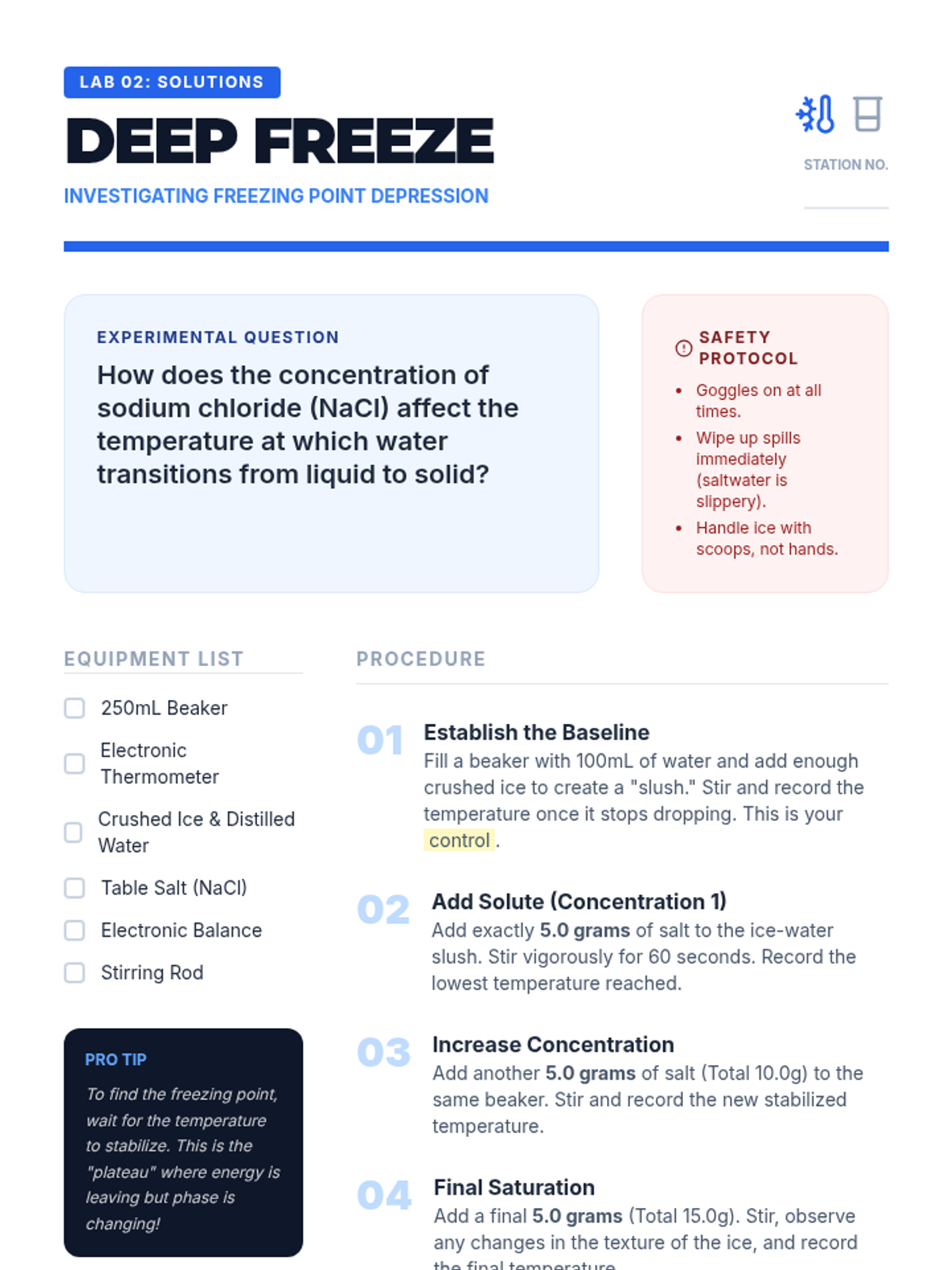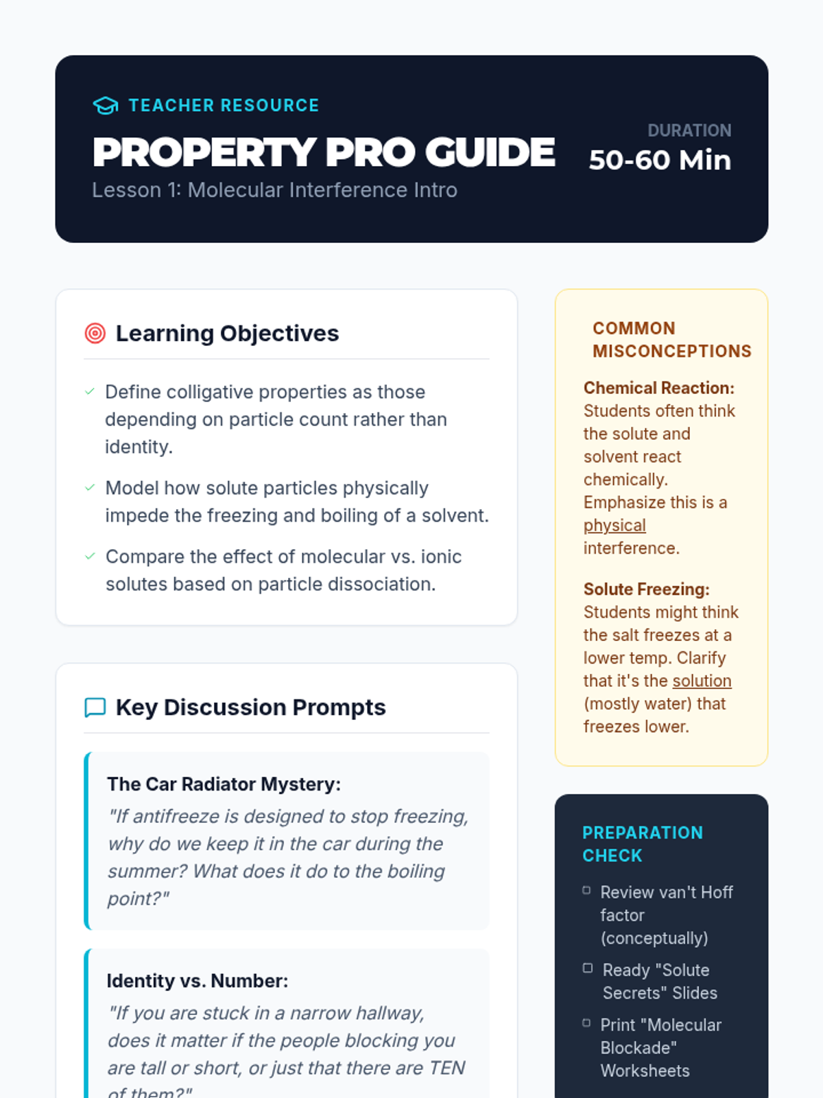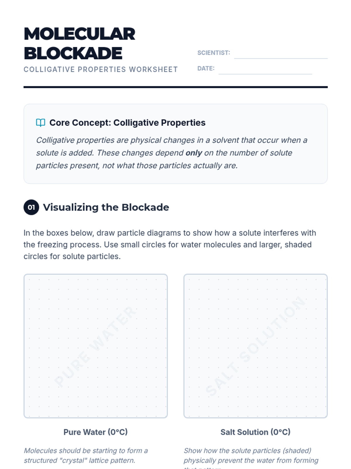 This sequence explores how solutes affect the physical properties of solvents, focusing on freezing point depression and boiling point elevation through hands-on labs and engineering challenges.