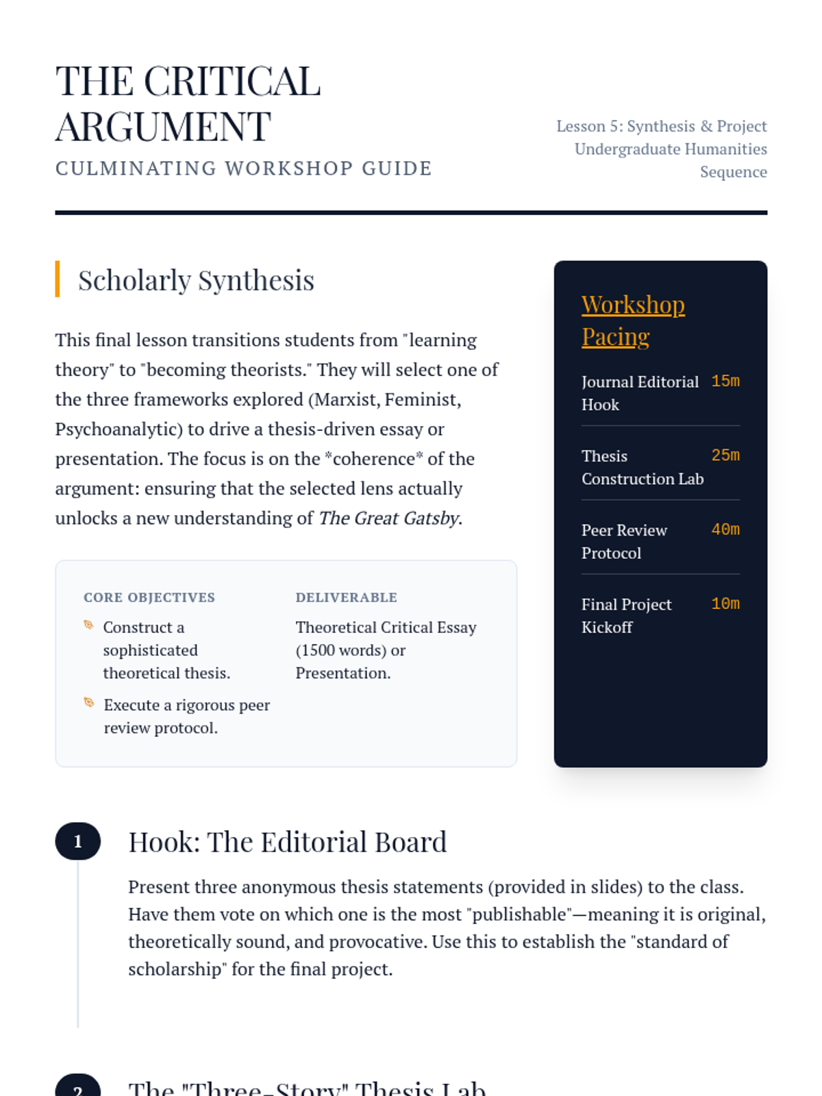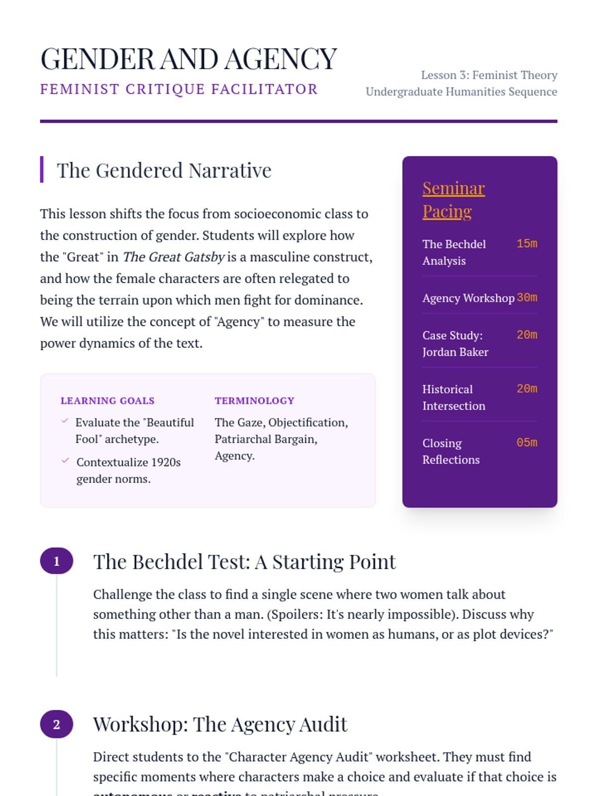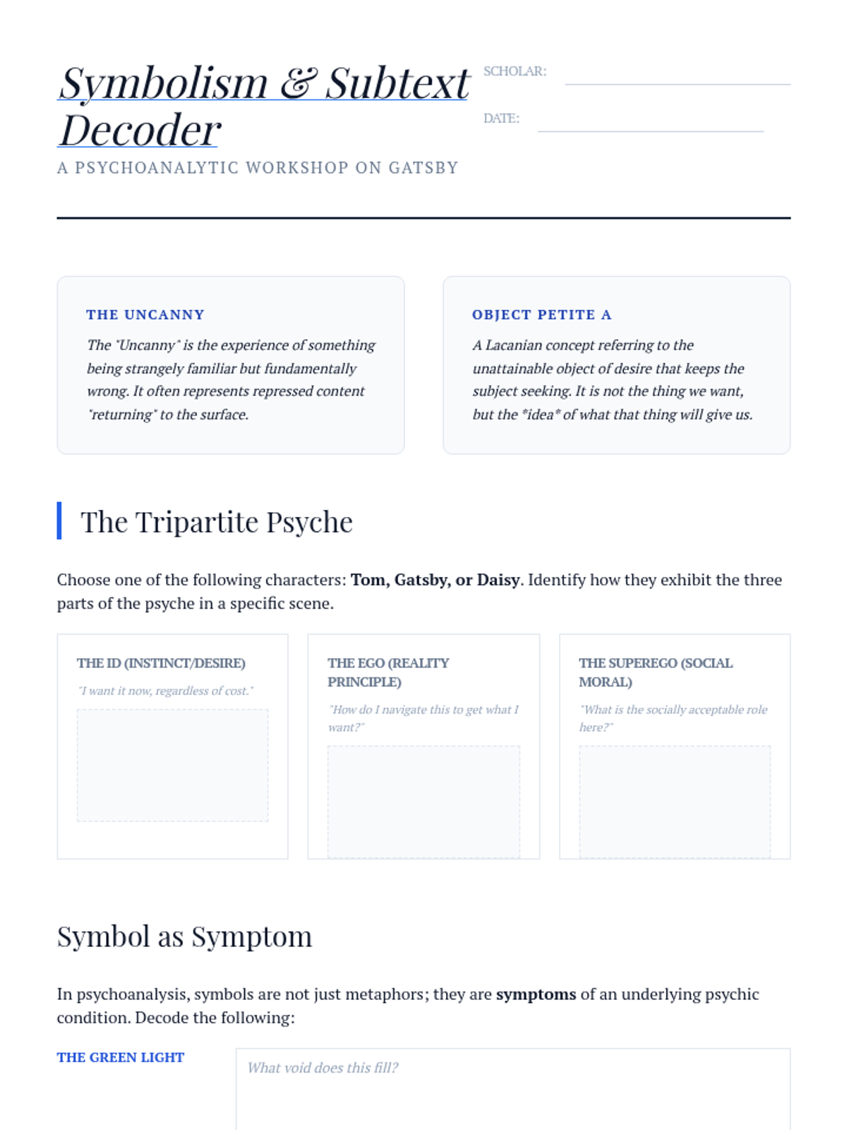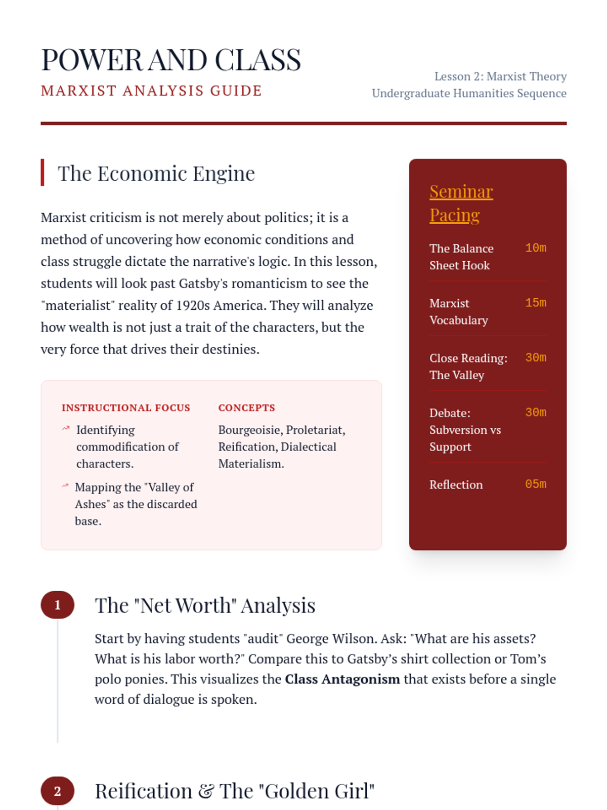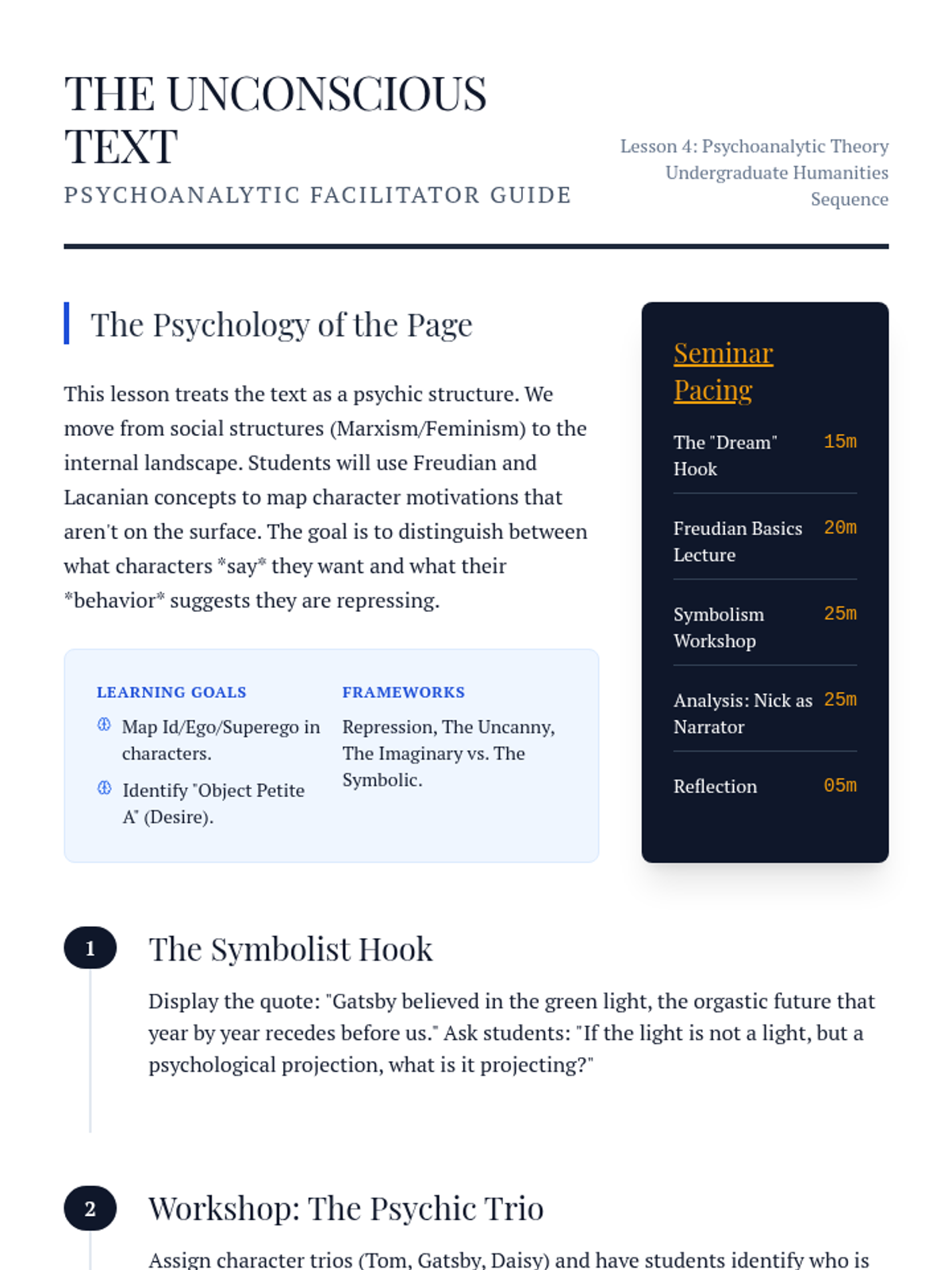 An undergraduate-level novel study sequence that introduces students to critical literary theory. Students apply Marxist, Feminist, and Psychoanalytic lenses to a core text to uncover subtext and develop sophisticated scholarly arguments.