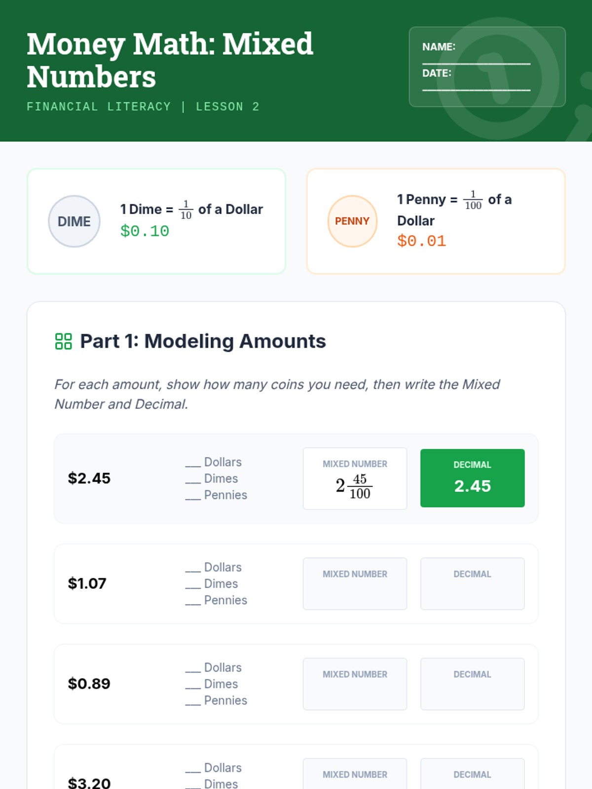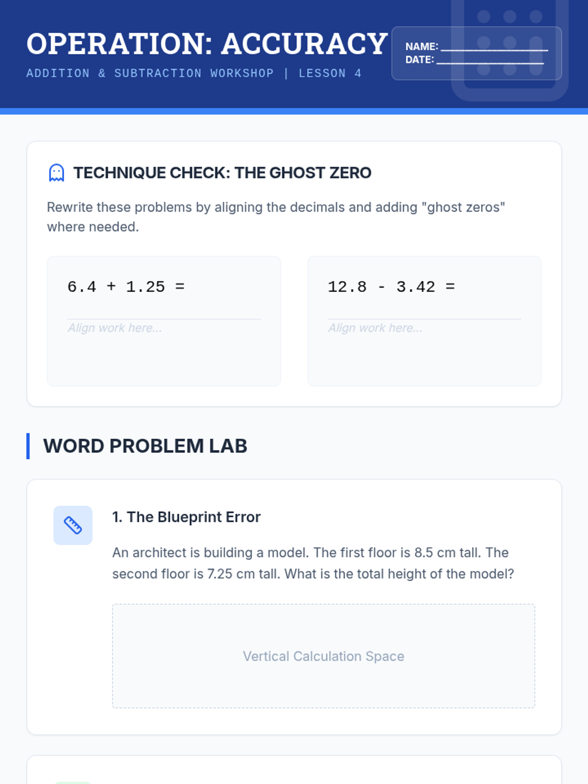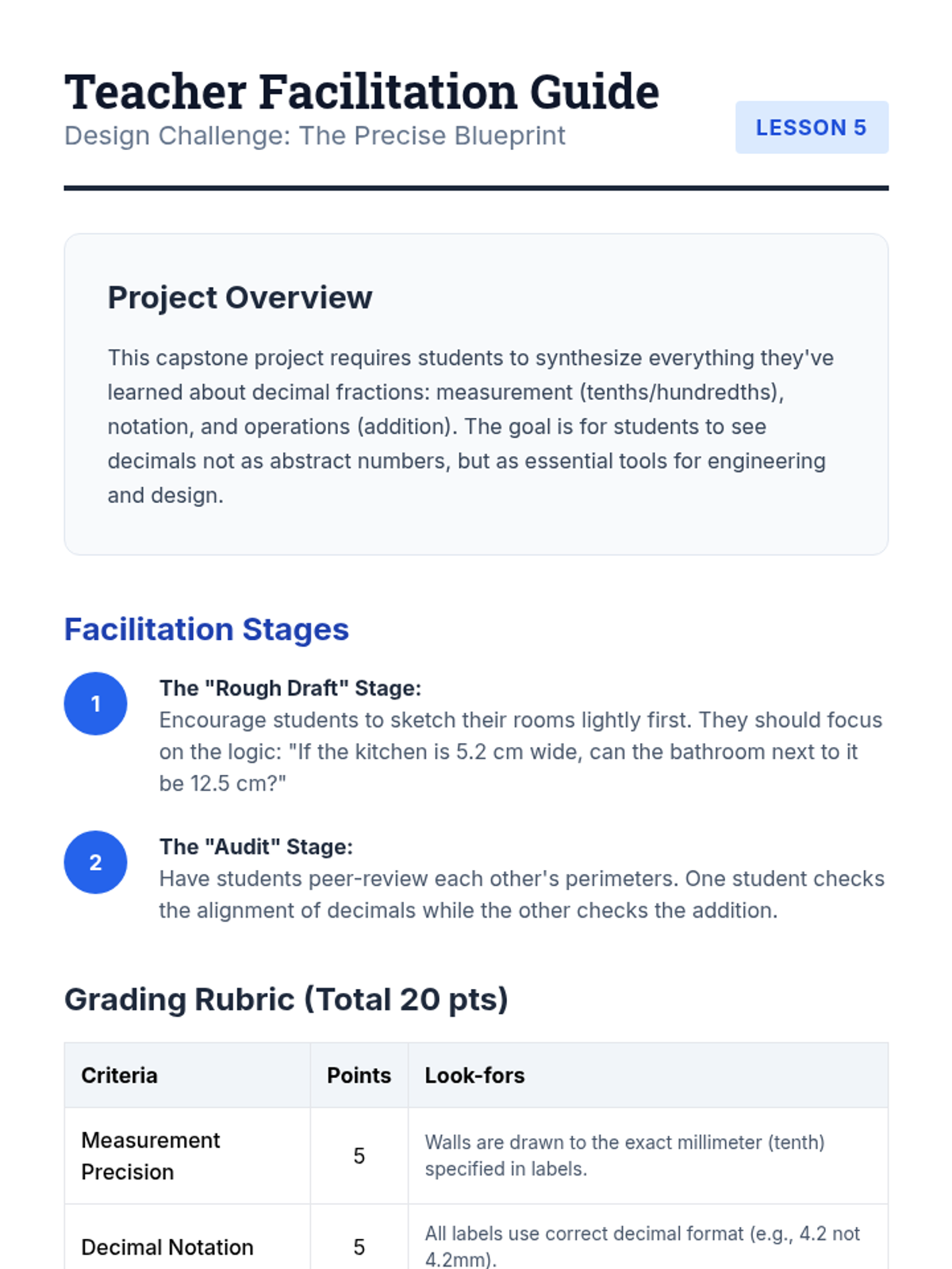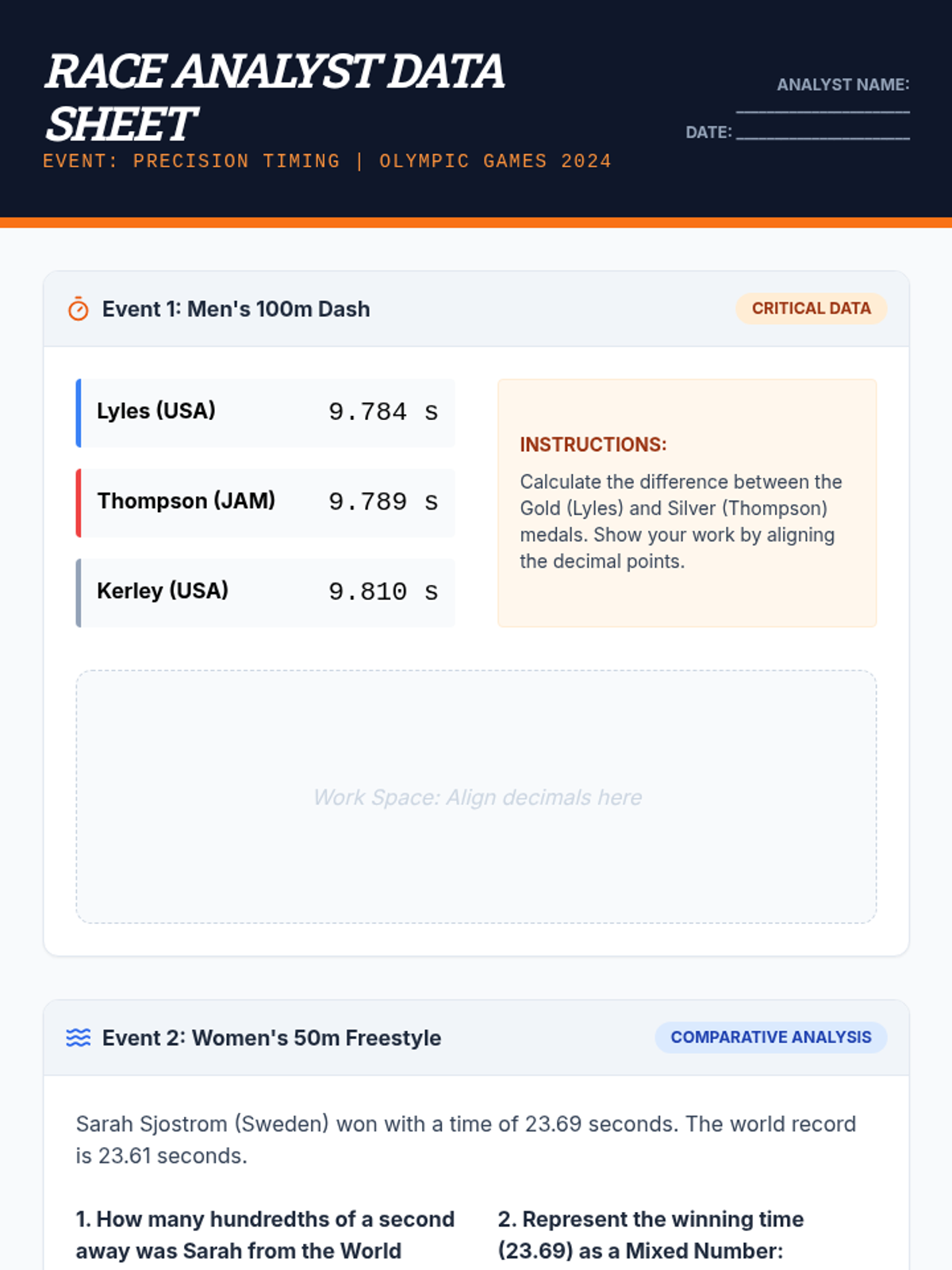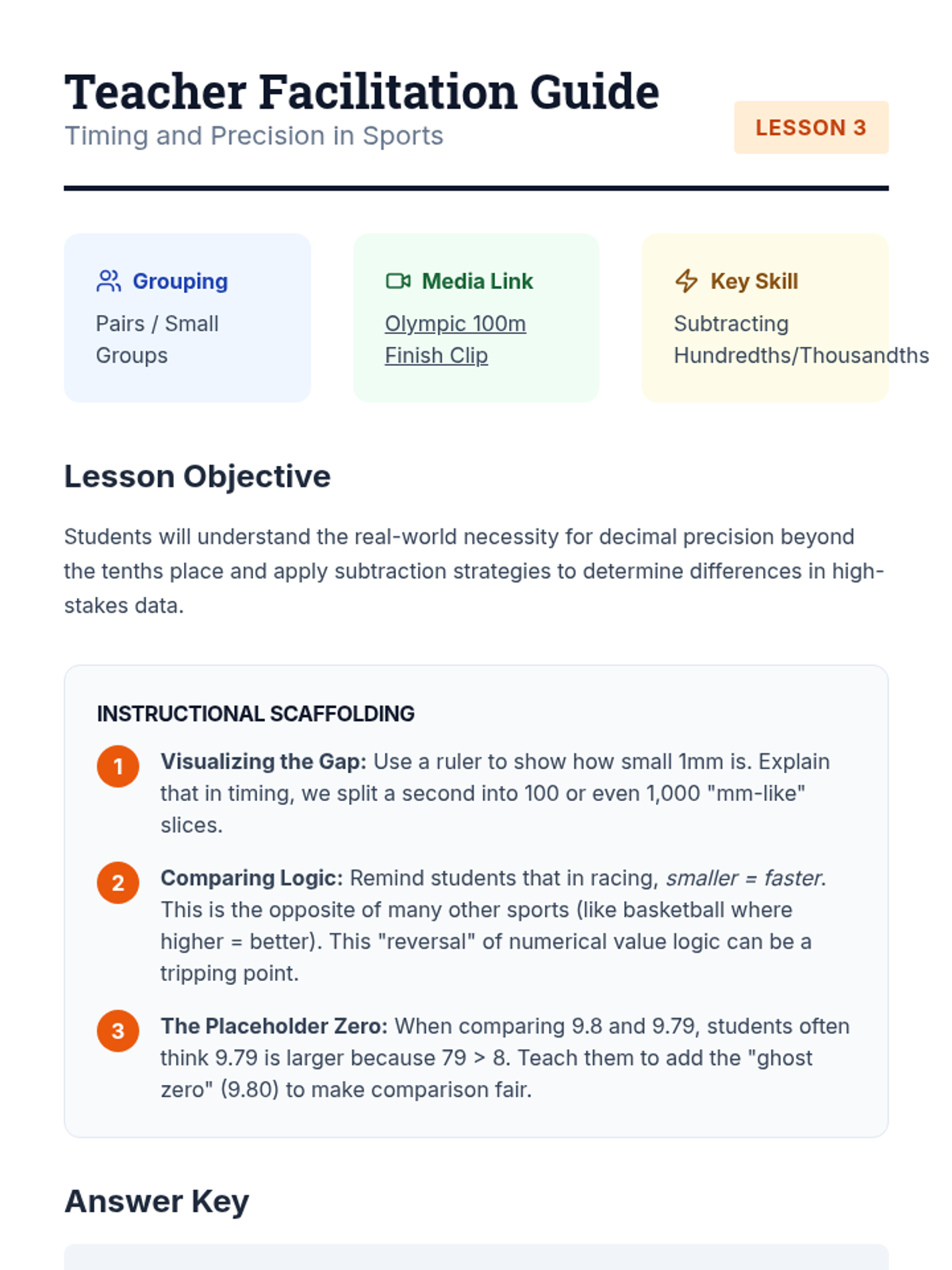 This sequence connects abstract decimal fractions to tangible measurement and data analysis. Students act as scientists and analysts using metric tools, financial data, and sports timing to understand the necessity of precise decimal notation.