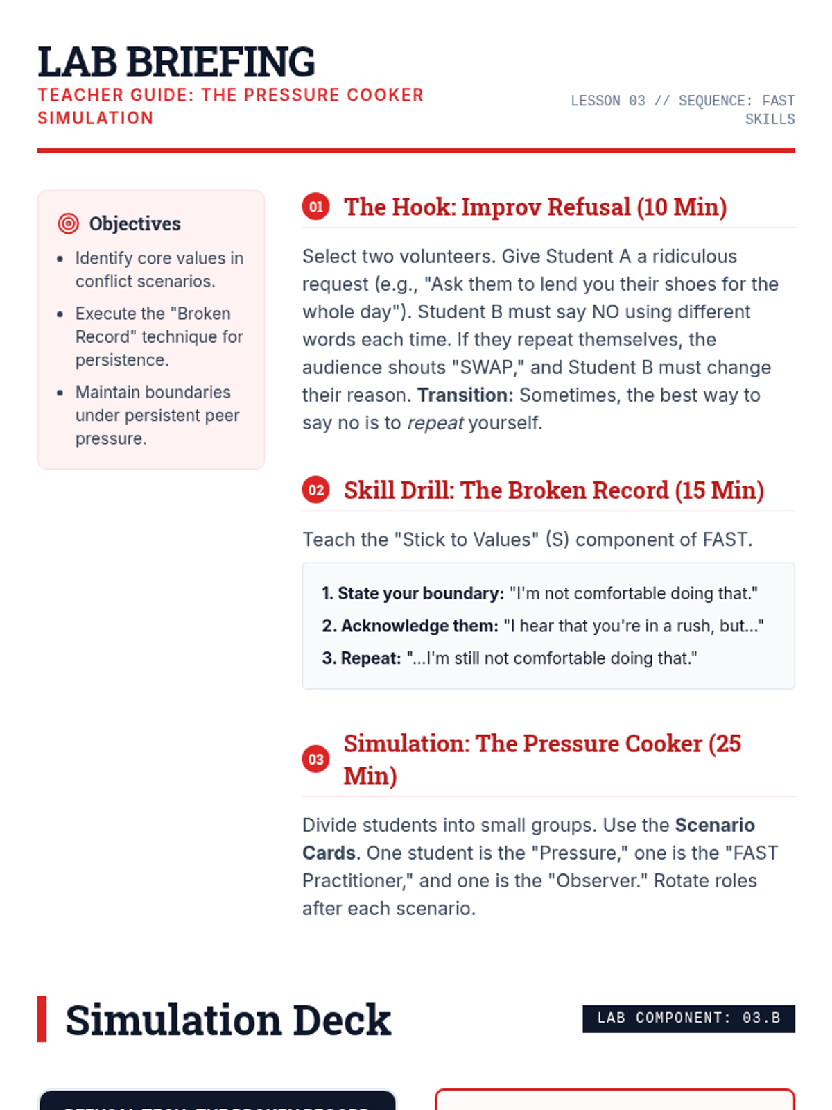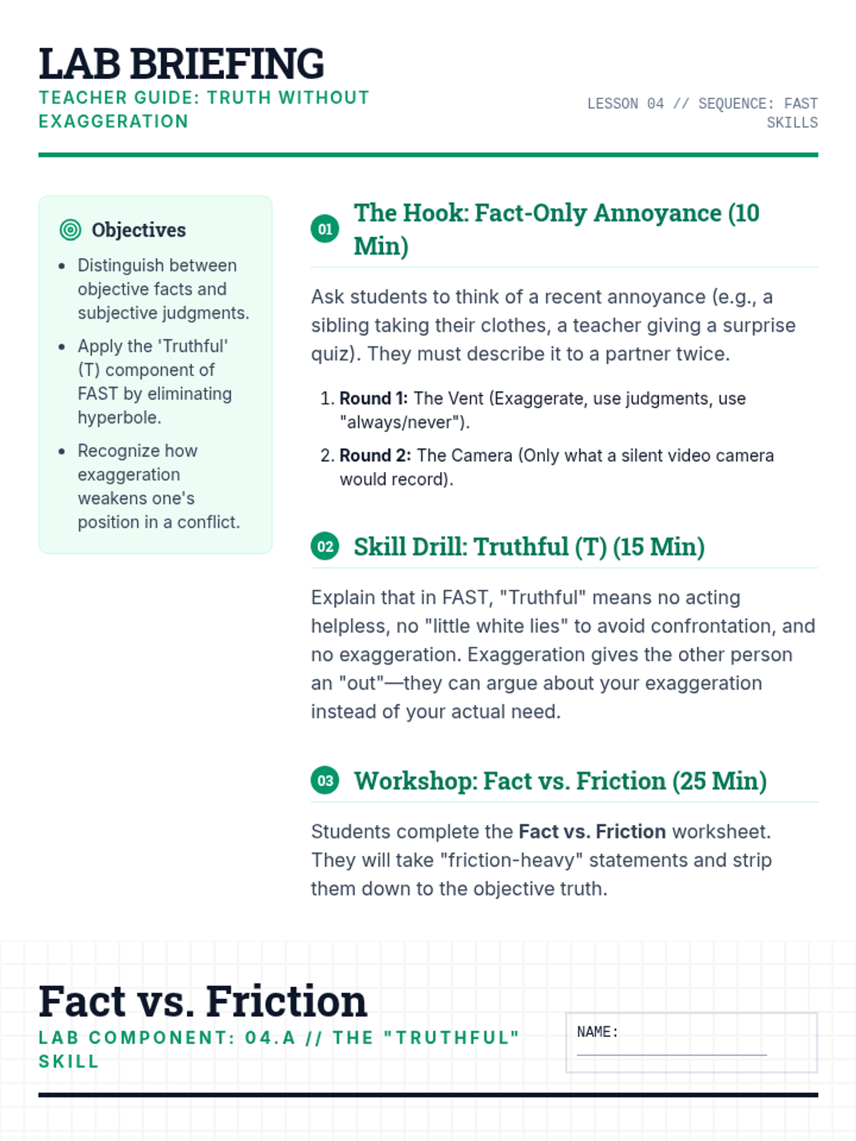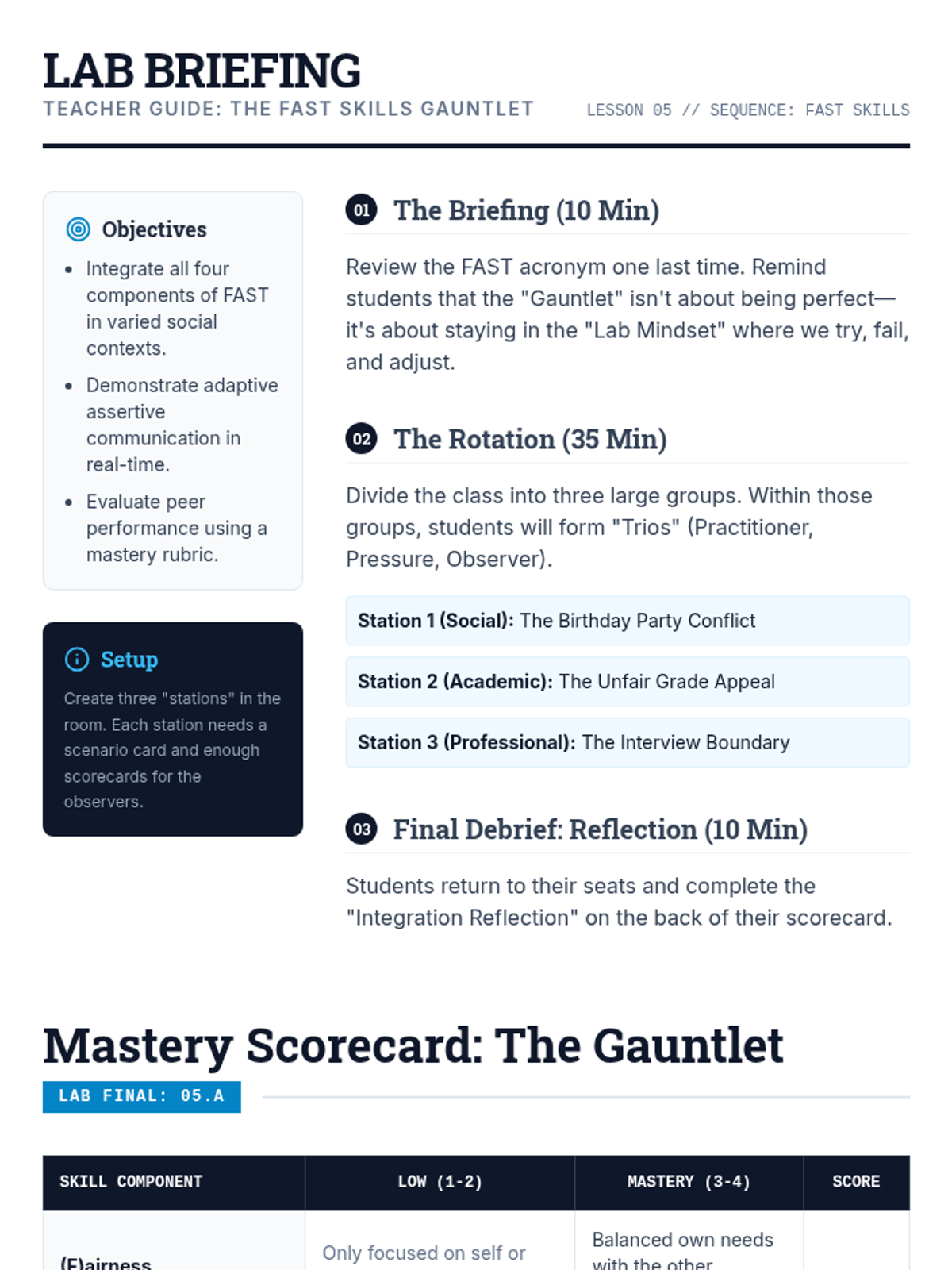 A high-school level interpersonal communications lab focused on the FAST acronym (Fair, No Apologies, Stick to Values, Truthful). Students transition from self-reflection to active behavioral rehearsal to build 'muscle memory' for self-respecting communication.