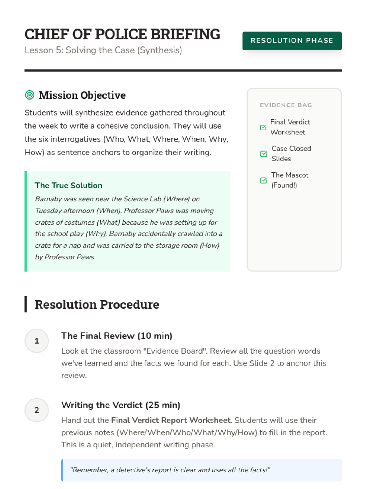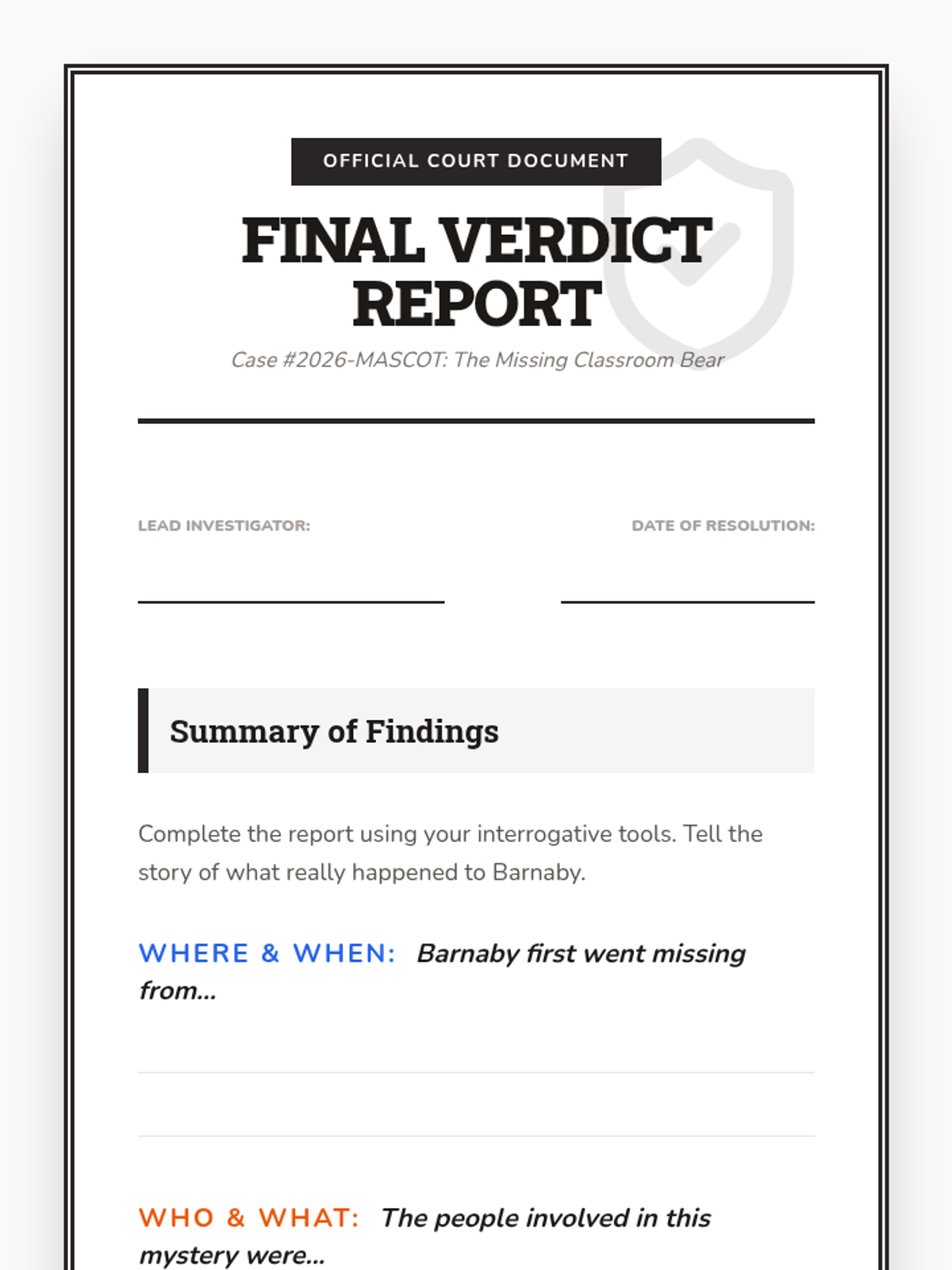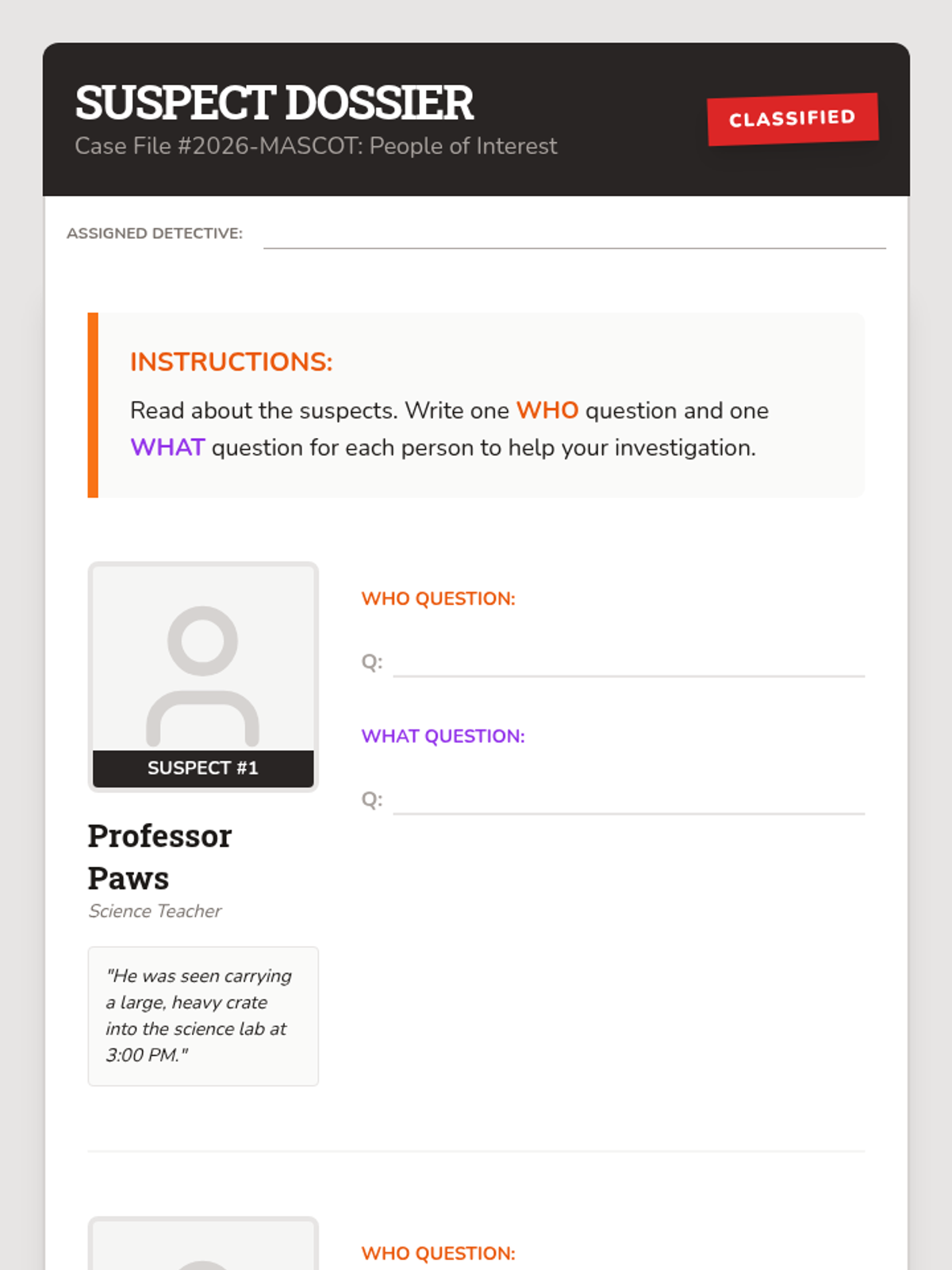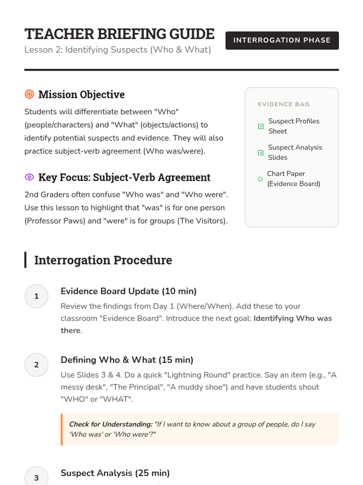 A mystery-themed ELA sequence for 2nd graders that teaches the use of interrogatives (Who, What, Where, When, Why, How) through a simulated investigation of a missing classroom mascot. Students act as detectives, using specific question words to gather evidence, identify suspects, and solve the case.